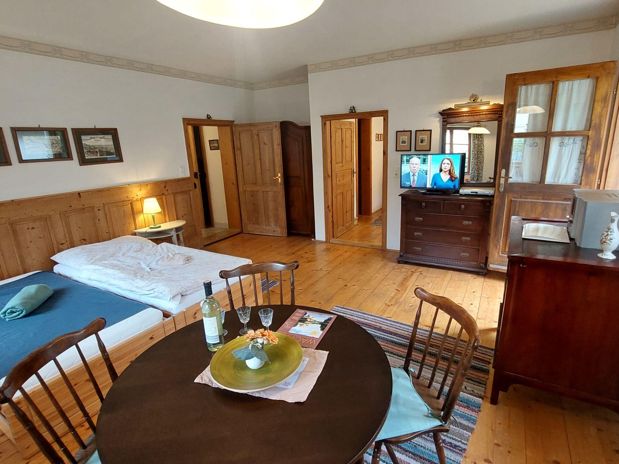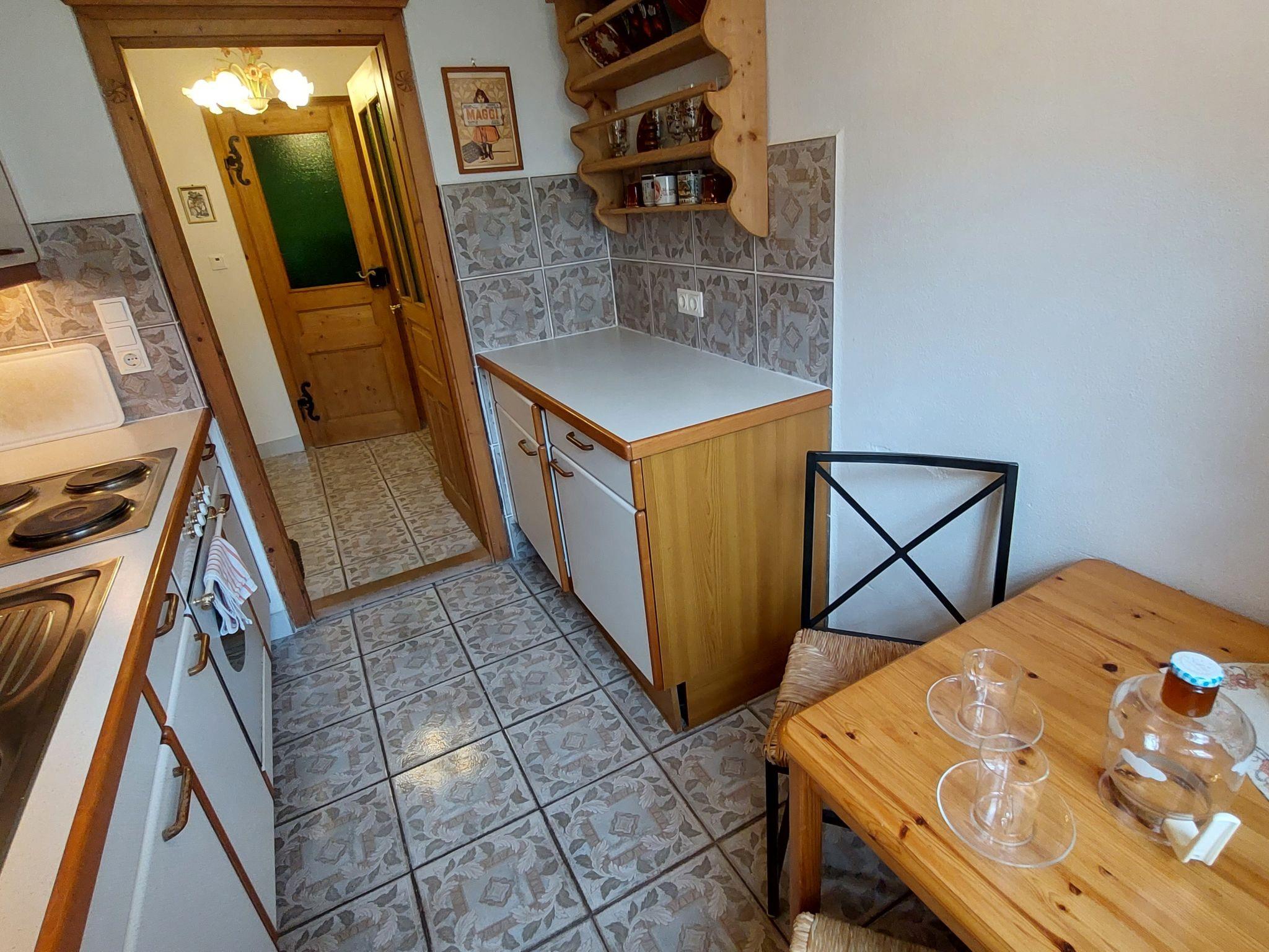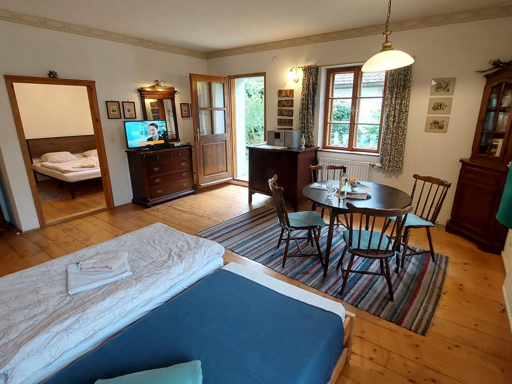 2-Zimmer-Wohnung 58 m2, im Erdgeschoss. Rustikal und gemütlich eingerichtet: Eingang. 1 Doppelzimmer. Wohn-/Esszimmer mit 1 Doppeldiwanbett, Esstisch, Sat-TV und DVD. Ausgang zum Garten. Küche (4 Kochplatten, Backofen, Geschirrspüler, elektrische Kaffeemaschine). Bad/Dusche, sep. WC. Holzdielenboden. Gartensitzplatz. Terrassenmöbel. Zur Verfügung: Kinderhochstuhl, Babybett, Haartrockner. Internet (WLAN, gratis). Bitte beachten: Nichtraucher-Unterkunft.