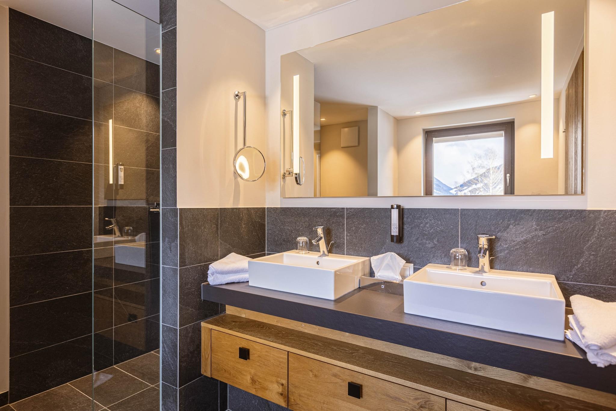 Das Bergresort Zugspitze Ehrwald bietet den perfekten Urlaubsort mit Frühstück für einen entspannten Start in den Tag. Dieses geräumige, 136 m² große Chalet bietet bequem Platz für bis zu 8 Gäste. Es verfügt über 4 Schlafzimmer, darunter 3 Doppelbetten und 1 französisches Doppelbett, sowie 3 Badezimmer mit Dusche und WC sowie ein zusätzliches Badezimmer mit Dusche, alle mit Haartrocknern ausgestattet. Ein Schlafzimmer und ein Badezimmer befinden sich im Erdgeschoss und sind daher ideal für Gäste mit eingeschränkter Mobilität. Das Chalet verfügt außerdem über eine voll ausgestattete Küche und einen großzügigen, 80 m² großen privaten Garten. Die Küche im offenen Wohn- und Essbereich umfasst Besteck, Kochgeschirr, ein Cerankochfeld, eine Mikrowelle, einen Kühlschrank mit Gefrierfach, einen Geschirrspüler, einen Wasserkocher und eine Nespresso-Kaffeemaschine. Bei der Ankunft erhalten Sie ein kleines Starterset mit Geschirrspültabs, Spülmittel (20 ml), Schwämmen, Müllbeuteln, Reinigungstüchern und Handtüchern. Das Highlight dieses Premium-Chalets ist zweifellos der private Garten, der einen atemberaubenden Blick nach Süden auf die Zugspitze bietet – der perfekte Ort, um Ihr nächstes Abenteuer zu planen. Kostenloses WLAN ist in der gesamten Unterkunft verfügbar. Gäste können auch den Wellnessbereich des Resorts mit beheiztem Außenpool, Saunen (Biosauna, finnische Sauna, Infrarotsauna), Dampfbad und Fitnessraum nutzen. Das Restaurant serviert köstliche Mahlzeiten und das Frühstück ist im Preis inbegriffen. Die Zugspitz Arena Bayern-Tirol Card bietet zusätzliche Vorteile und kostenlose Parkplätze in der Tiefgarage sind vorhanden. Jedes Chalet ist individuell eingerichtet und alle Bilder dienen nur zur Veranschaulichung.