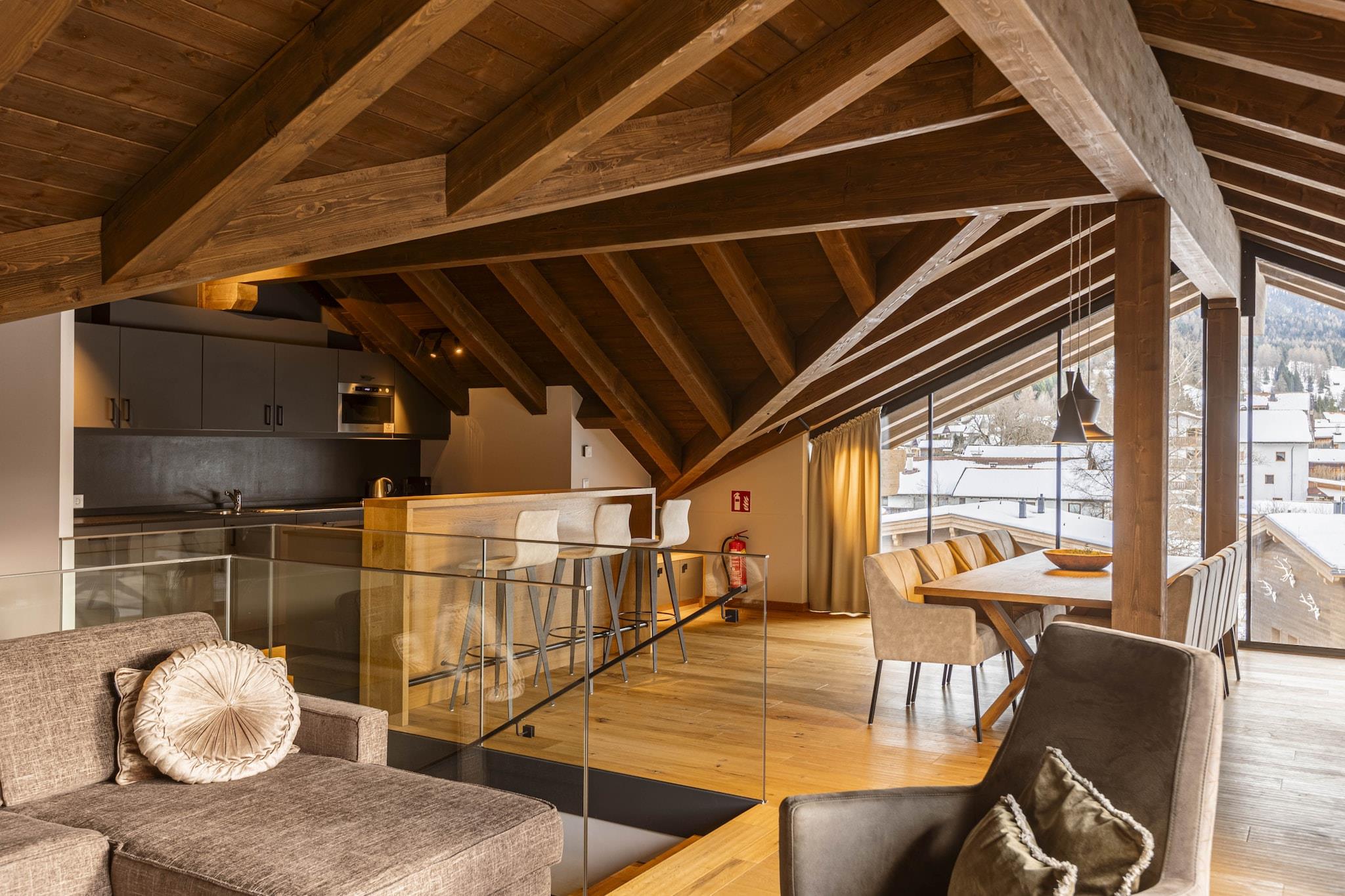 Dieses Penthouse bietet die ideale Unterkunft für Ihren Urlaub, inklusive Frühstück. Das 134 bis 159 m² große Penthouse bietet bequem Platz für 2 bis 8 Personen. Die Wohnung verfügt über 3 Schlafzimmer, 2 Bäder mit Dusche oder Badewanne und WC (ein Fön ist vorhanden), eine Küchenzeile und einen Balkon oder eine Loggia. Erholsamen Schlaf finden Sie in bequemen Doppelbetten, im Wohnbereich steht eine Doppelschlafcouch für 2 weitere Personen zur Verfügung. Die Küche im Wohn-Essbereich ist komplett ausgestattet, d.h. mit Besteck und Kochgeschirr, Ceran-Kochfeld, Mikrowelle, Kühlschrank mit Gefrierfach, Geschirrspüler, Wasserkocher und Nespresso-Kaffeemaschine. Ein kleines Starterset mit Spülmaschinentabletten, Spülmittel (20 ml), Schwamm, Müllsäcken, Reinigungstuch und Geschirrtuch wird bei Ihrer Ankunft bereitgestellt. Kostenloses Wi-Fi ist im gesamten Bergresort Zugspitze Ehrwald verfügbar. Alle Bilder sind Beispielbilder, da jedes Appartement individuell eingerichtet ist. Das Resort verfügt außerdem über einen Wellnessbereich mit beheiztem Außenpool, Saunen (Bio-Sauna, Finnische Sauna, Infrarot-Sauna), Dampfbad und Fitnessraum. Für das leibliche Wohl steht das Restaurant zur Verfügung. Die Gästekarte „Zugspitz Arena Bayern-Tirol Card“ ist im Preis inbegriffen und eine kostenlose Tiefgarage steht Ihnen zur Verfügung.