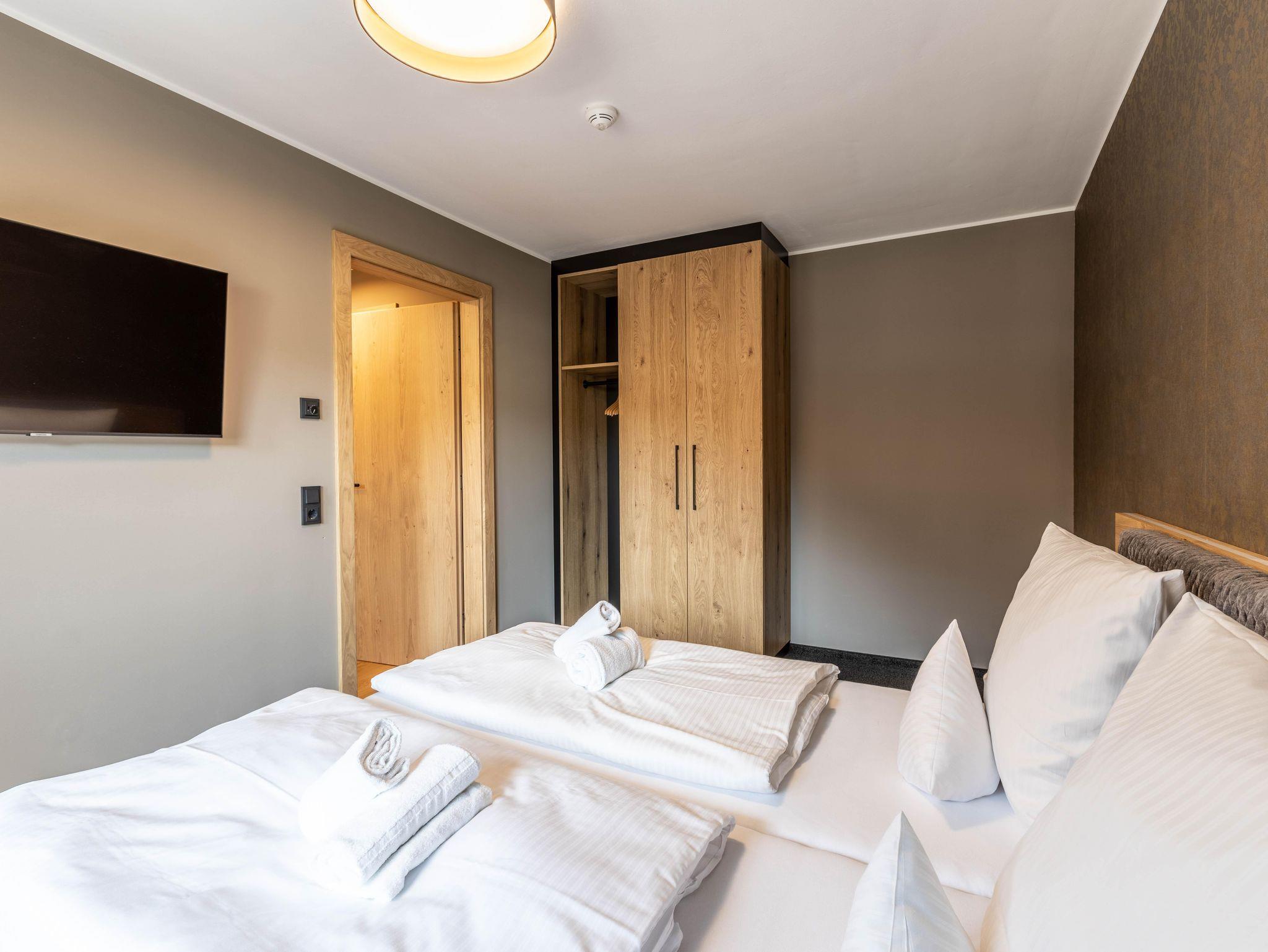 Das Apartment für 4 Personen bietet Wohnküche, Schlafzimmer (Boxspringbett+Balkonzugang), Bad, separates WC und Balkon. Der Eingangsbereich, mit Garderobe, führt direkt in den Wohn und Essbereich (Balkonzugang), welcher mit Esstisch, TV, Kleiderschrank und einem Ausziehsofa aufwartet. Die angrenzende Küche ist mit Küchengeräten, Kühl-Gefrierkombi sowie Nespresso Kaffeemaschine ausgestattet und verfügt außerdem über Küchengeschirr inklusive Töpfe und Pfannen.