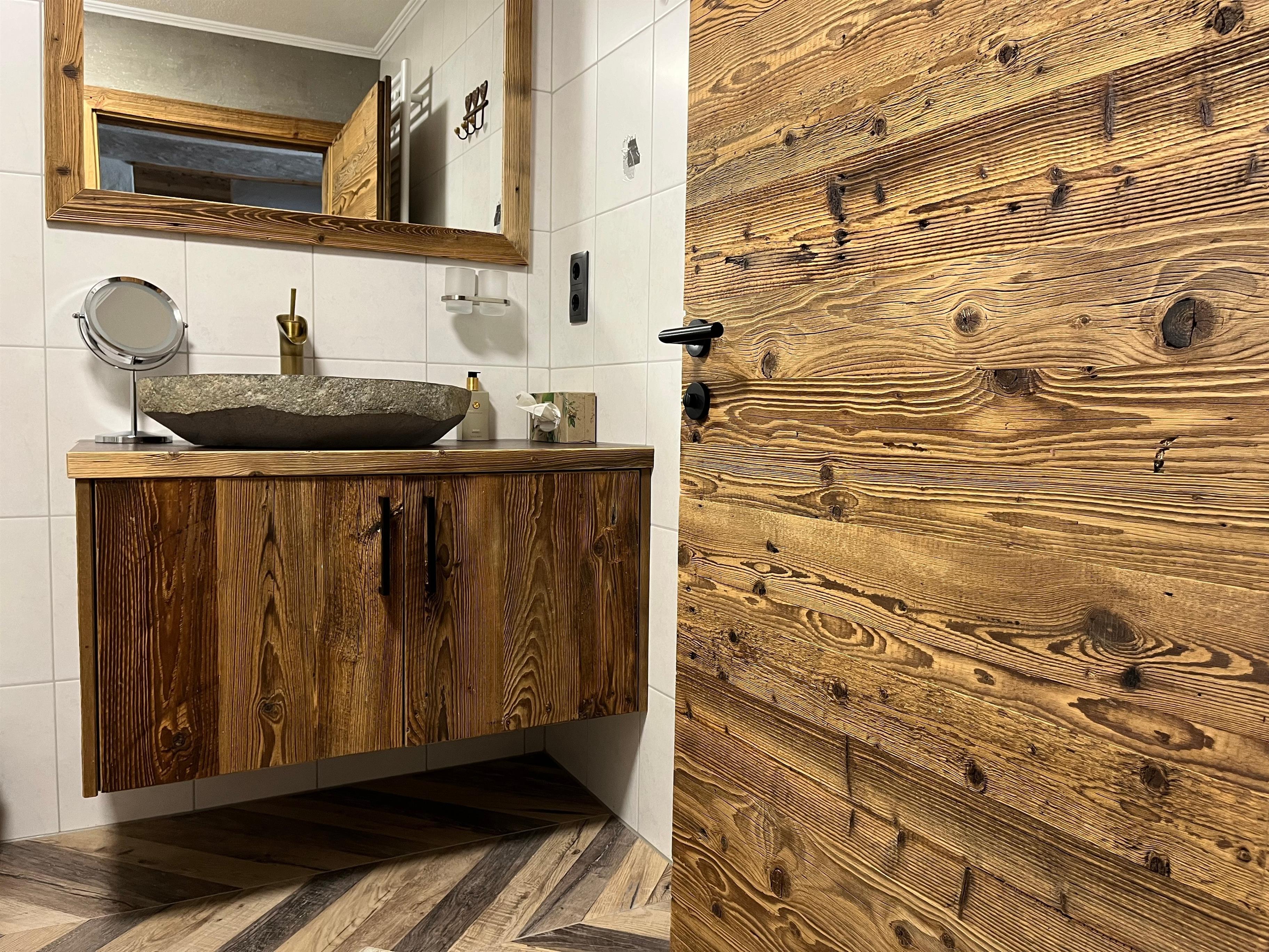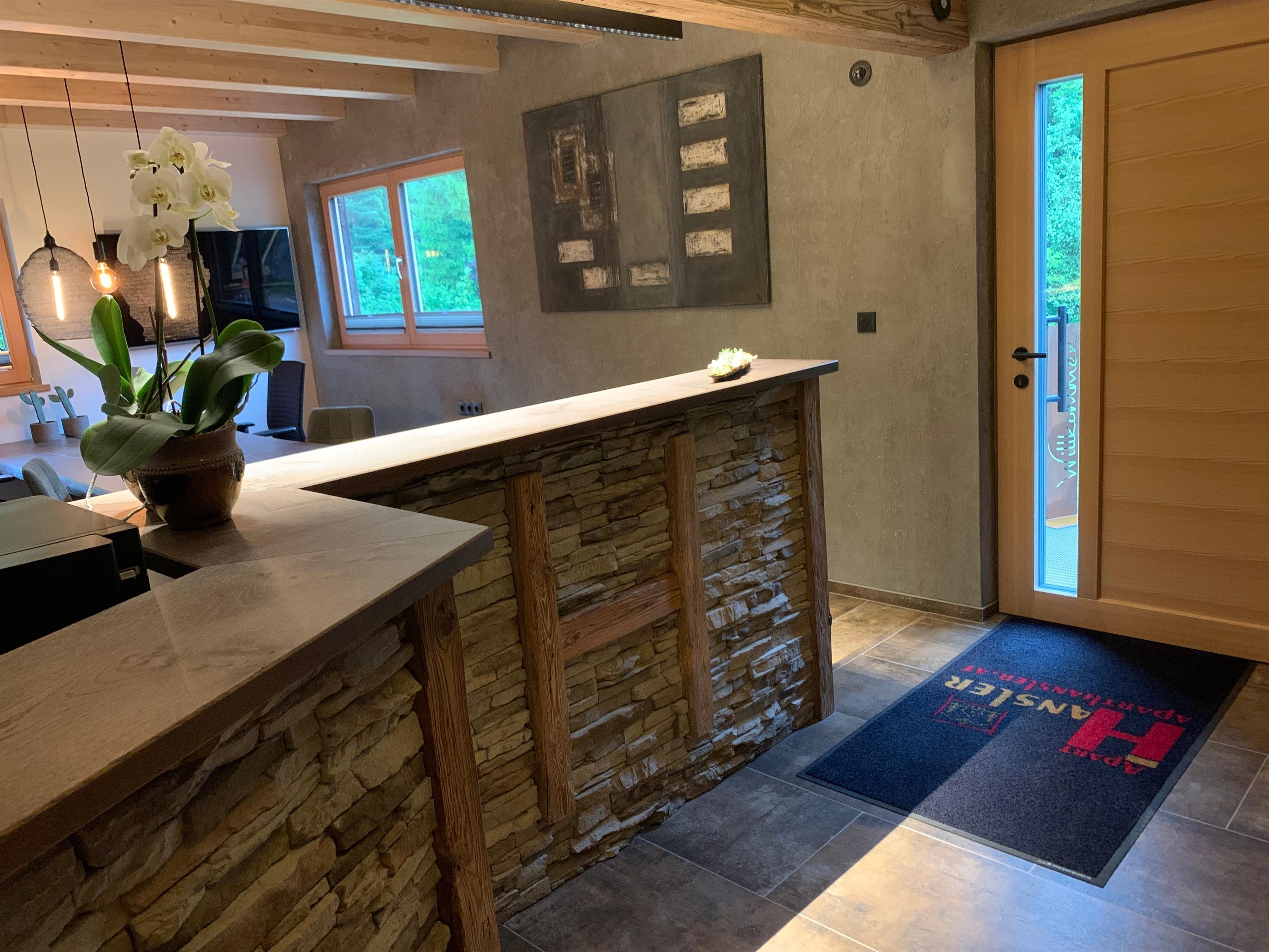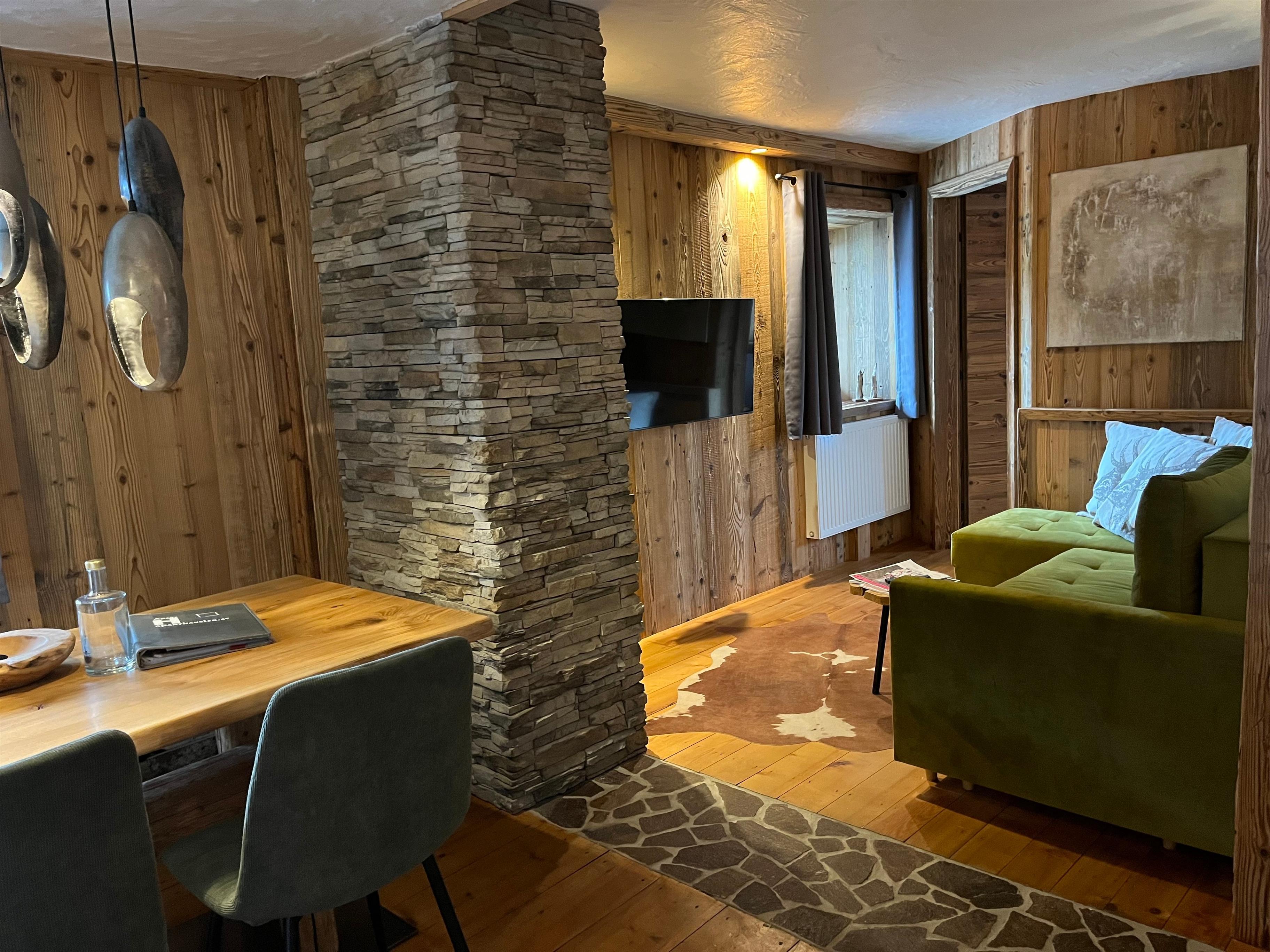Das Sandro befindet sich im 1.Stock mit Blick auf die Zugspitze, Die Wände in Altholz, eine Steinmauer, moderner Hüttenstyle, gemütliches Lichtkonzept, hochwertige Möbel aus Holz, Verdunklungs-Vorhänge, W-Lan