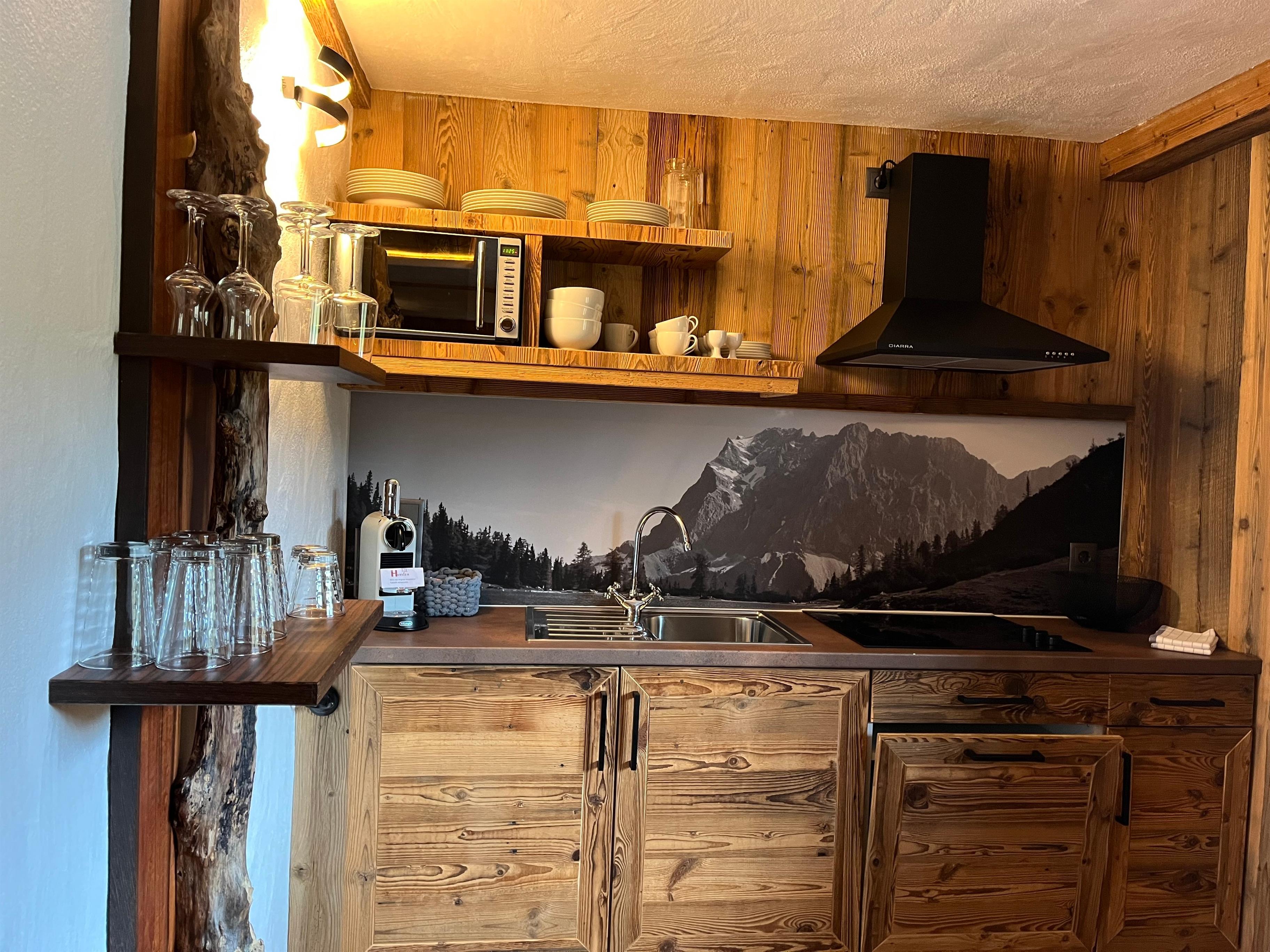 Die offene Wohn-Küche ist ausgestattet mit Ceran-Kochfeld, Geschirrspüler, Mikrowelle, Nespresso Kapsel Maschine, Wasserkocher, Toaster, Filterkaffee Maschine auf Nachfrage.