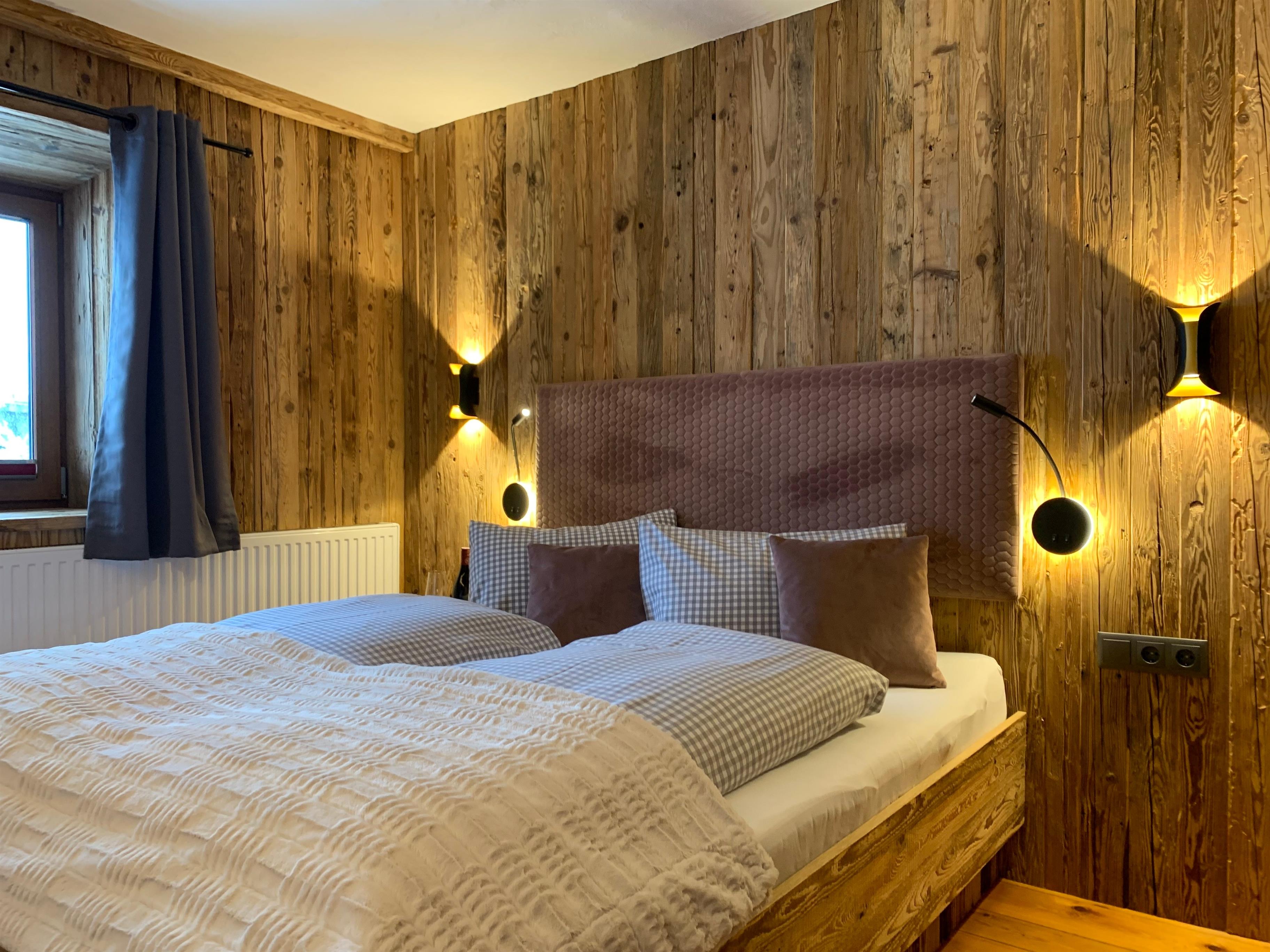 Das Joelina befindet sich im 1. Stock und verfügt über einen eigenen Balkon. 1 Kuschelhöhle mit Etagenbett für 3 Personen. Die Wände in Altholz, eine Steinmauer, moderner Hüttenstyle, gemütliches Lichtkonzept, hochwertige Möbel aus Holz, Verdunklungs-Vorhänge, W-Lan.