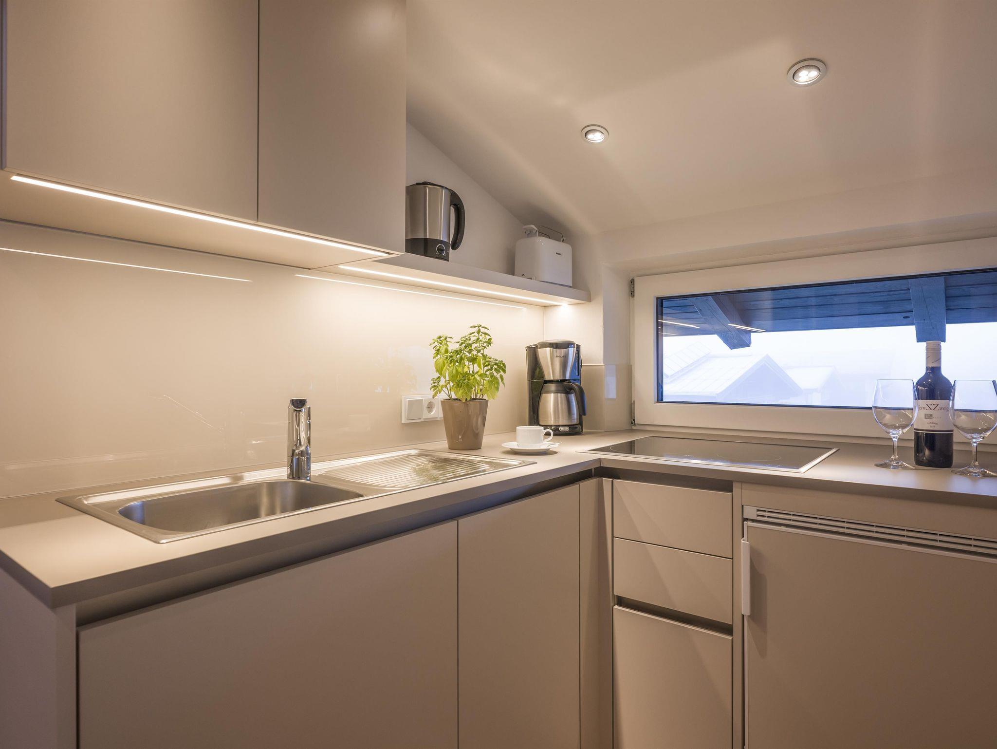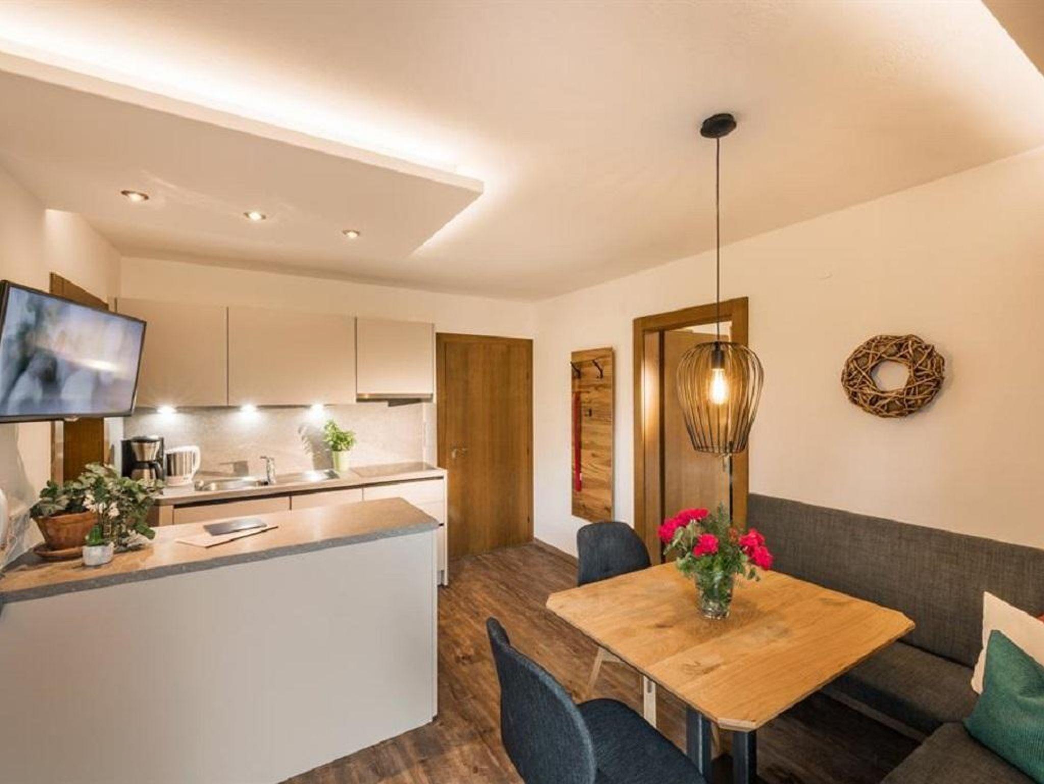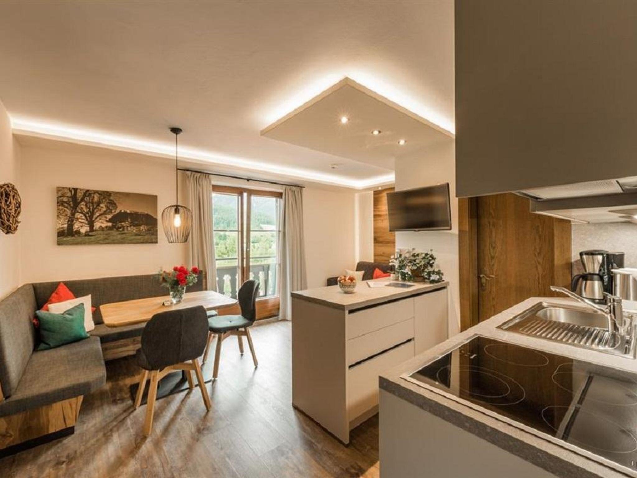 Appartement mit zwei Schlafräumen mit Doppelbett, 2x Dusche/WC, vollständige Küche und separater Wohnraum mit Schlafcouch für 1-2 Personen. Balkon mit Blick zum Wilden Kaiser und zum Hartkaiser.