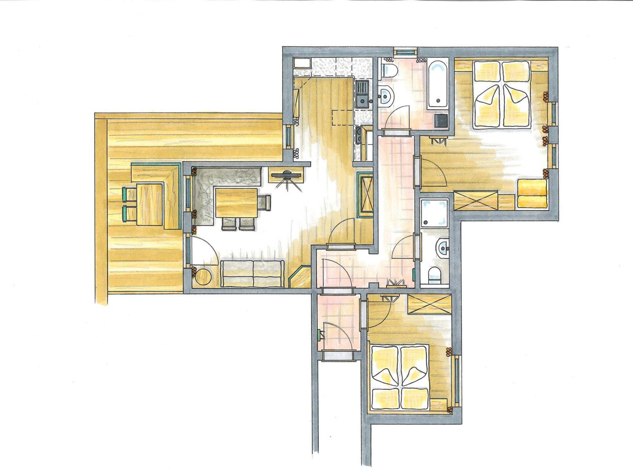 Unser App. mit einer Wohnfläche von 70 m² verfügt über zwei Schlafzimmer und einen Wohn-Schlafraum, Küche mit Geschirrspüler, Dusche/Wc und Bad/WC, Kabel-TV und Balkon.