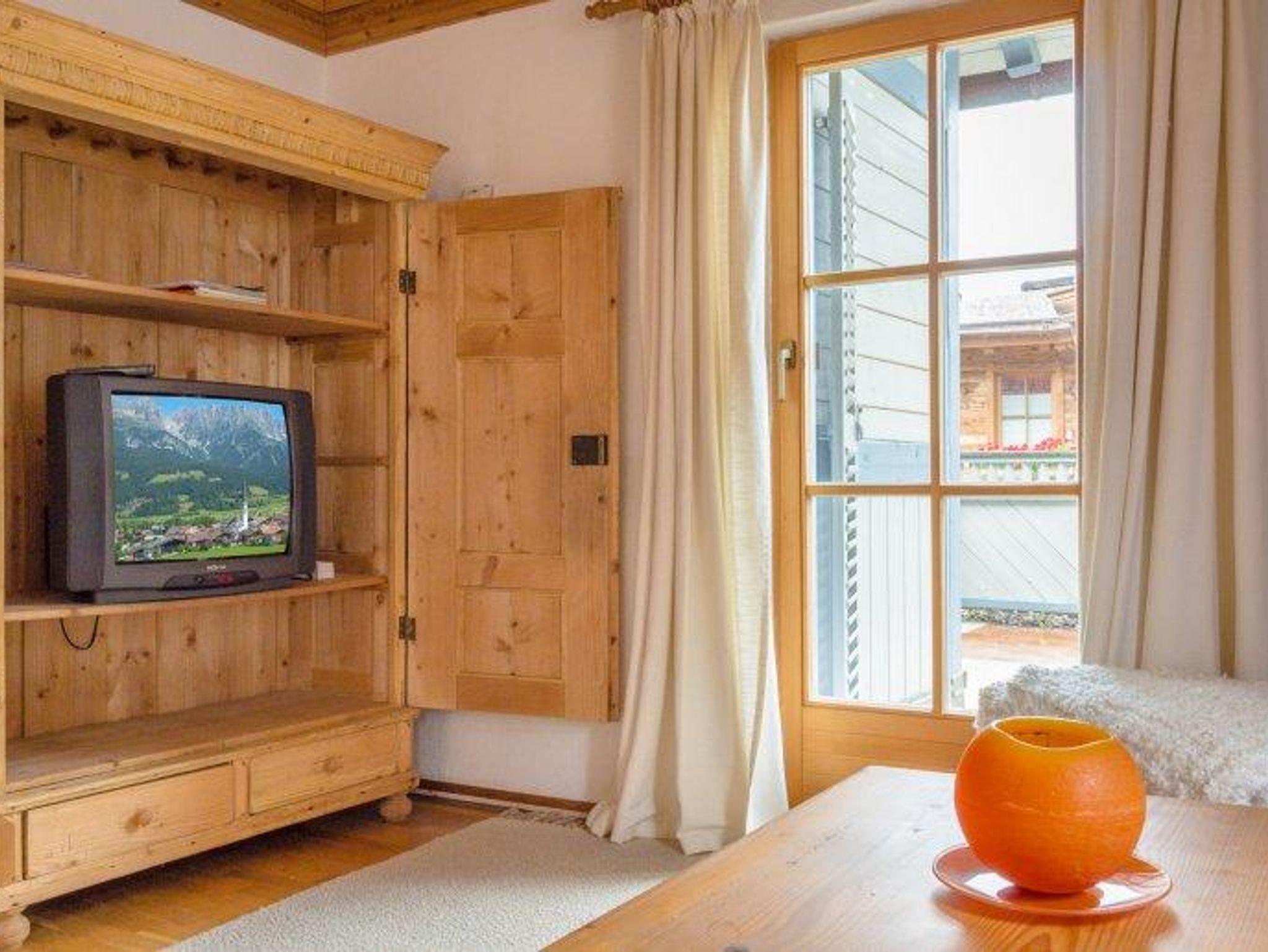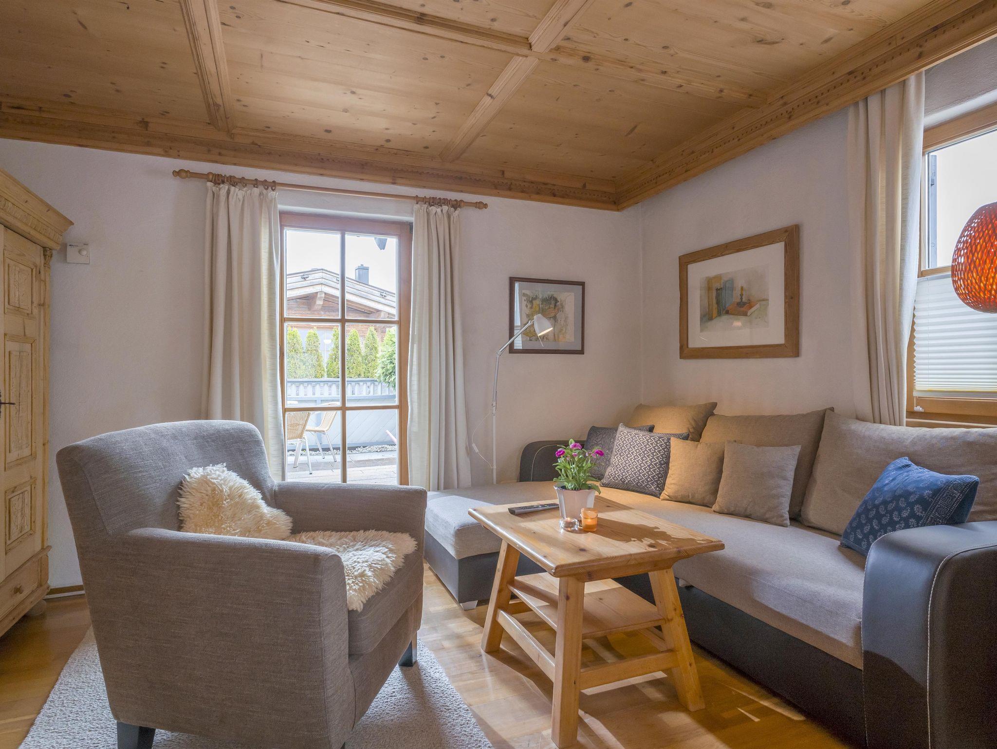 Das großzügige Appartement ist gemütlich eingerichtet mit drei Schlafzimmer (zwei Schlafzimmer haben einen Fernseher), eine kleine Küche mit kompletter Ausstattung, ein Wohnraum mit Esstisch. Es befinden sich 2 Bäder im Appartement. Ein Bad ist mit Badewanne, WC und Bidet ausgestattet - das zweite Bad verfügt über eine Dusche, Wc und Bidet. Sehr geschätzt von unseren Gästen wird die Fußbodenheizung in den Bädern, sowie drei Toilletten. Zum Wohlfühlen trägt die Terrasse mit Blick zum Wilden Kaiser bei. Weiters gibt es zwei Balkone mit Blick zum Dorf sowie einen Abstellraum.