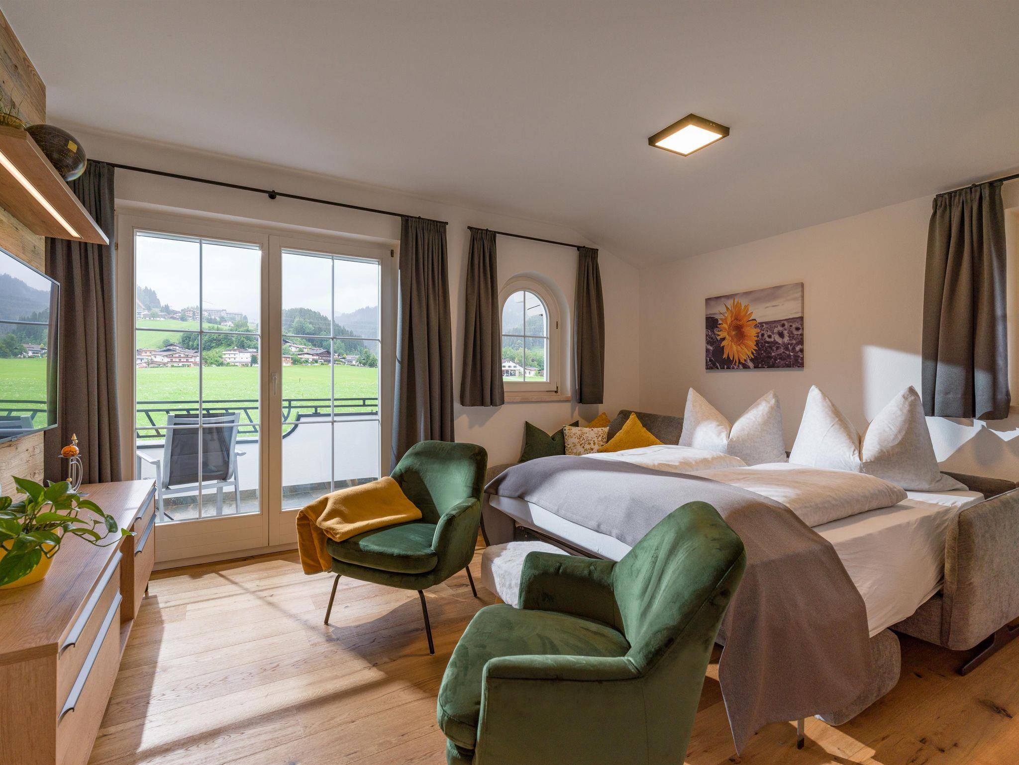 Ruhige, sonnige und gemütliche Nichtraucherwohnung mit ca. 54m² im 1. Stock, 1 Schlafzimmer, 1 Wohn- Schlafzimmer mit bequemer Wohnlandschaft u. Kabel-TV, komplett ausgestattete Wohnküche mit Sitzecke,Vorraum mit Garderobe, Dusche/WC, Balkon zur Süd- und Westseite. Hier können unsere Gäste die freie Aussicht auf den Astberg und Hartkaiser genießen.