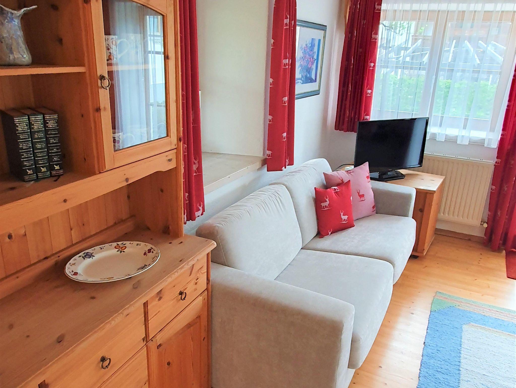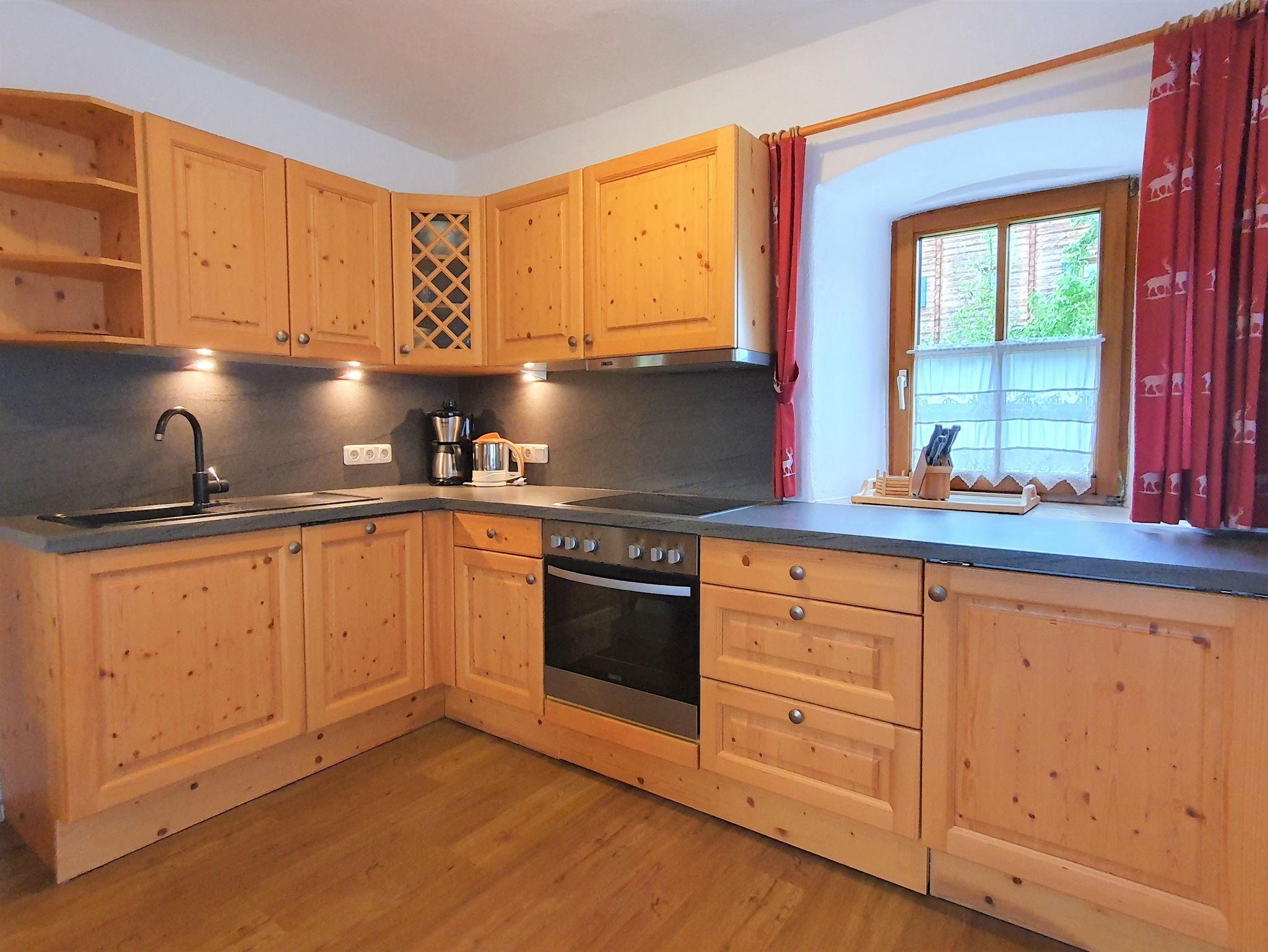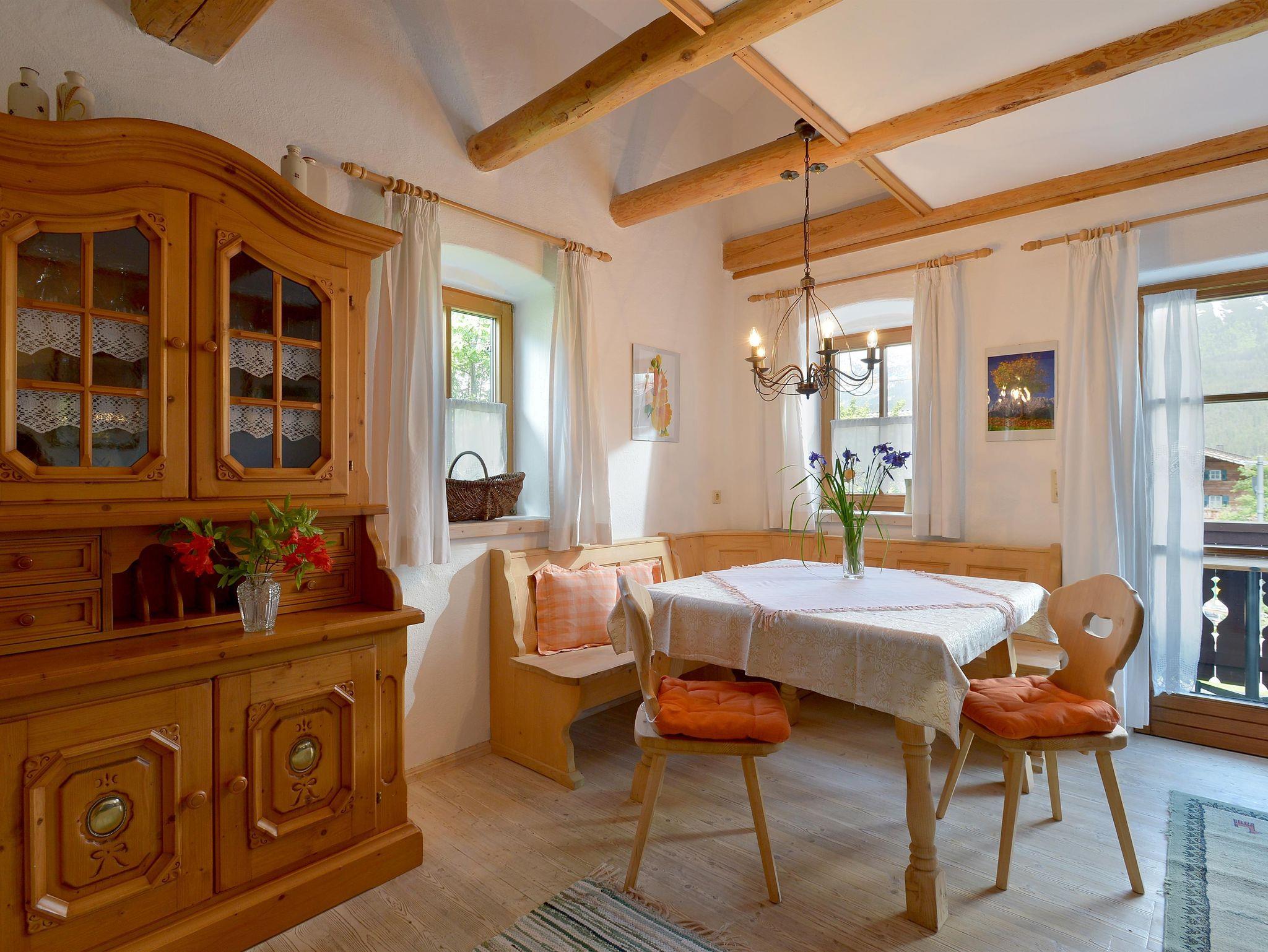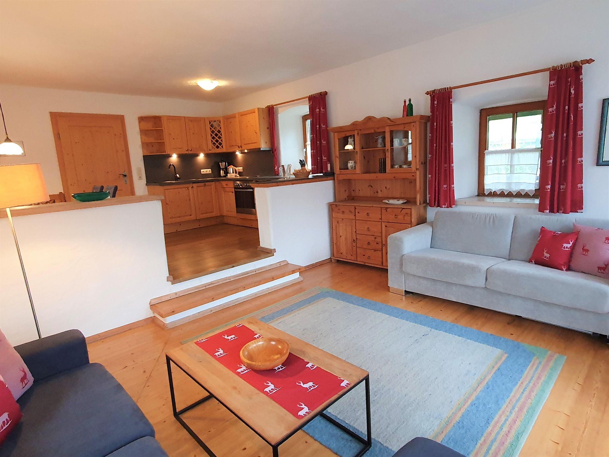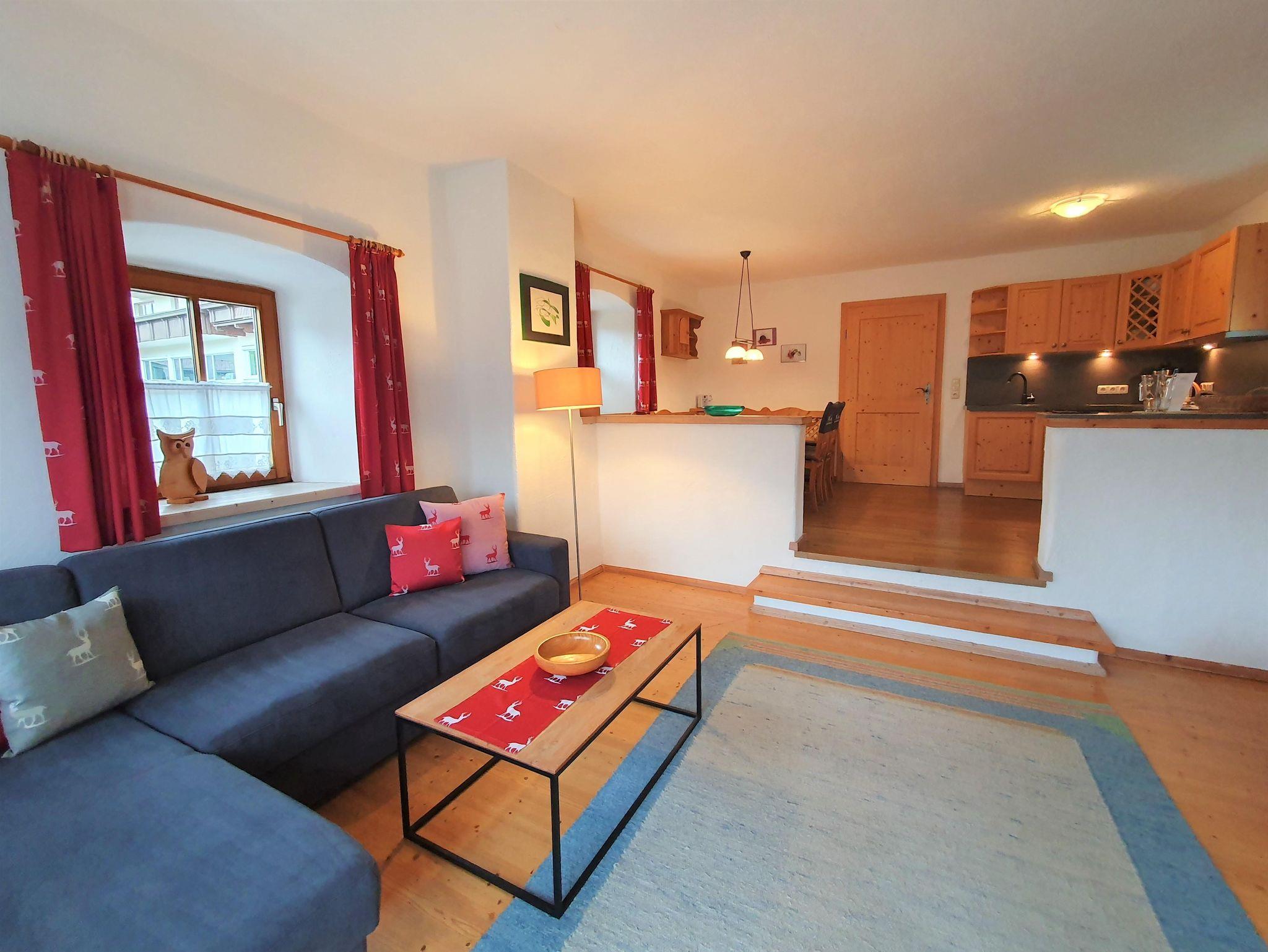 Das ebenerdige Appartement verfügt über einen offenen Wohnbereich mit gemütlicher Wohnlandschaft, großer Essecke und Tiroler Landhausküche.
