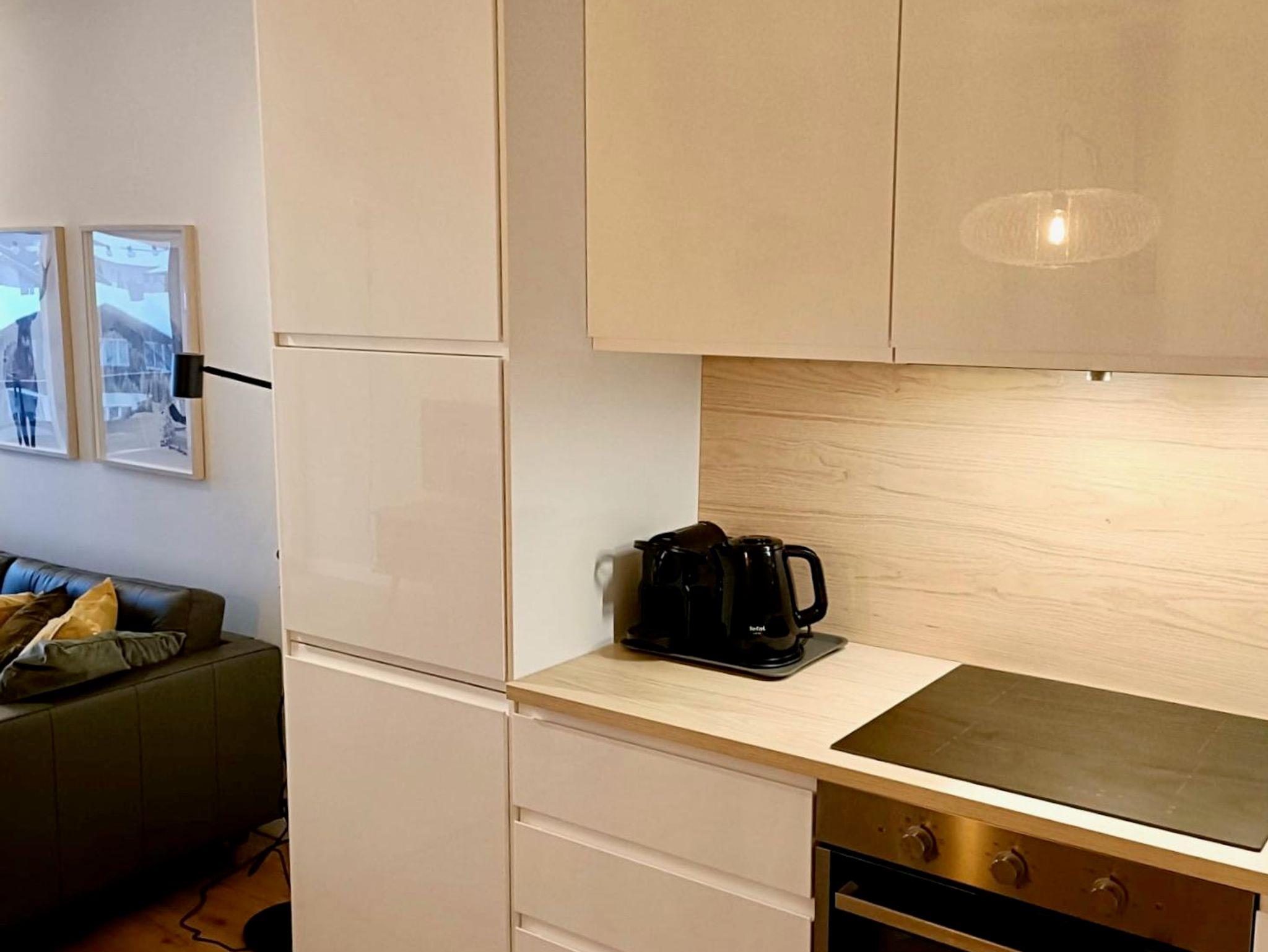 Im ersten Stock befindet sich das Talseite Apartment, ein komplett renoviertes Studio für bis zu 4 Personen. Die Wohnung befindet sich an der Nordseite des Gebäudes mit herrlichem Blick auf den Wilder Kaiser.