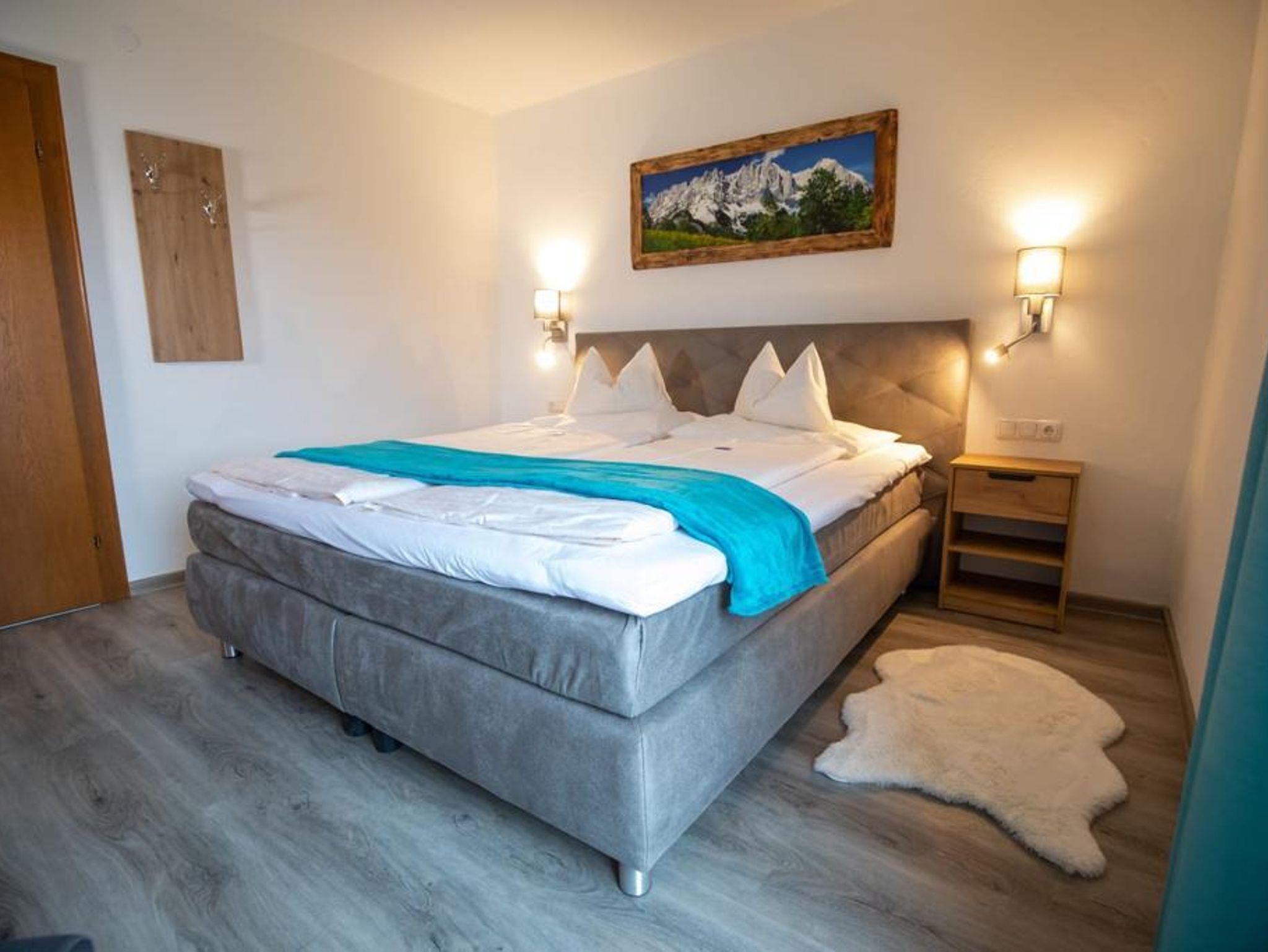 2 Schlafzimmer mit je Dusche, WC, Fön, Flat-TV und eigenem Balkon mit Blick auf den Wilden Kaiser und zur Marienkapelle. Bettwäsche und Handtücher incl.sowie Tischwäsche. Zirka 60m² groß.