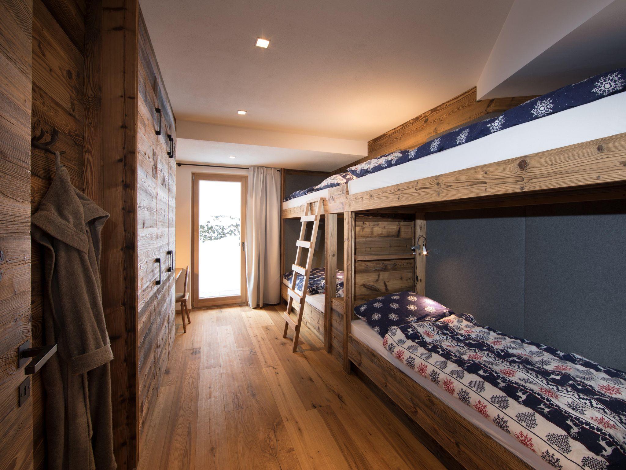 • Erdgeschoss: Ein gemütliches Vierbettzimmer mit zwei Etagenbetten, Schreibtisch und Zugang zum Wellnessbereich.