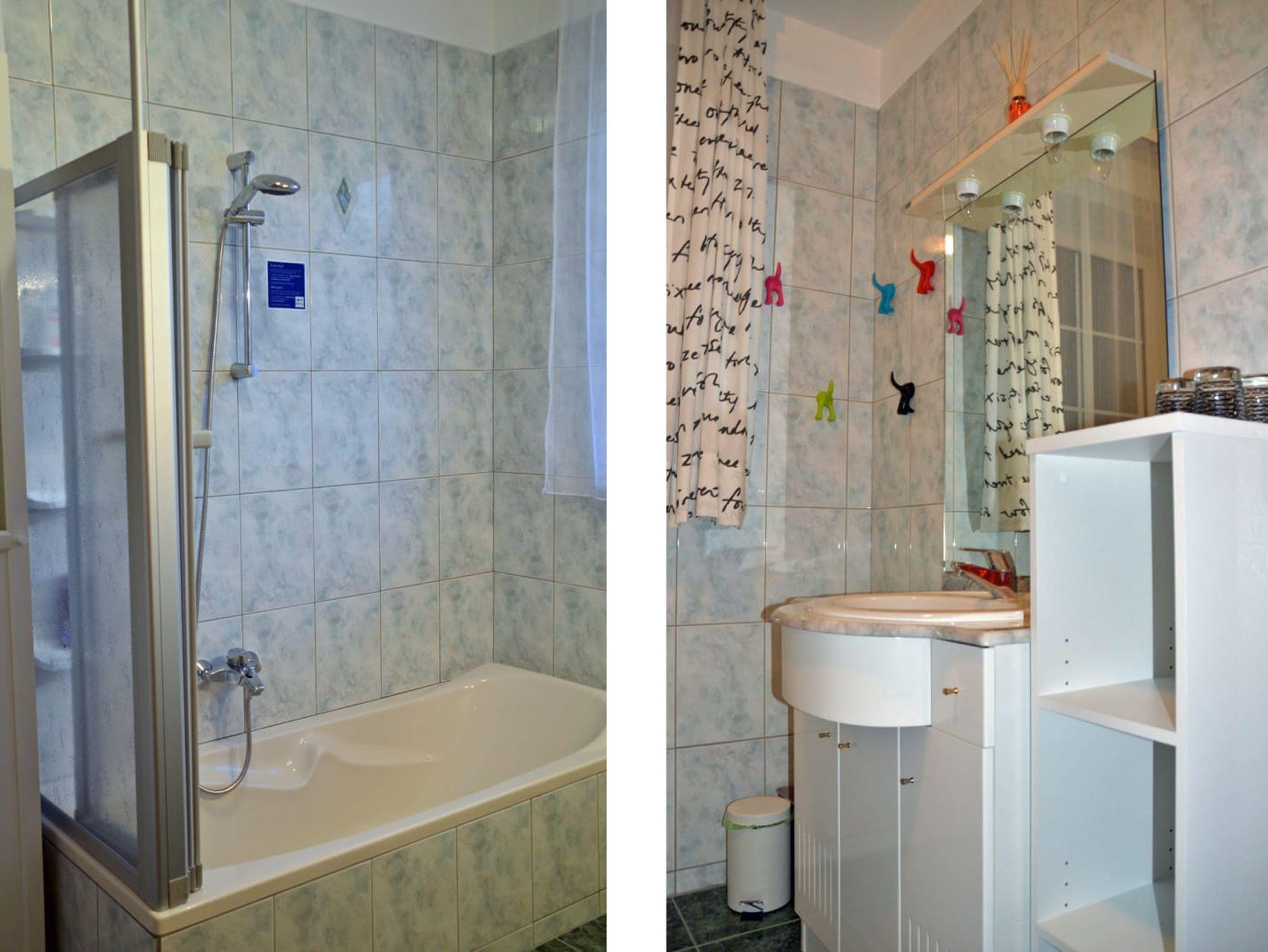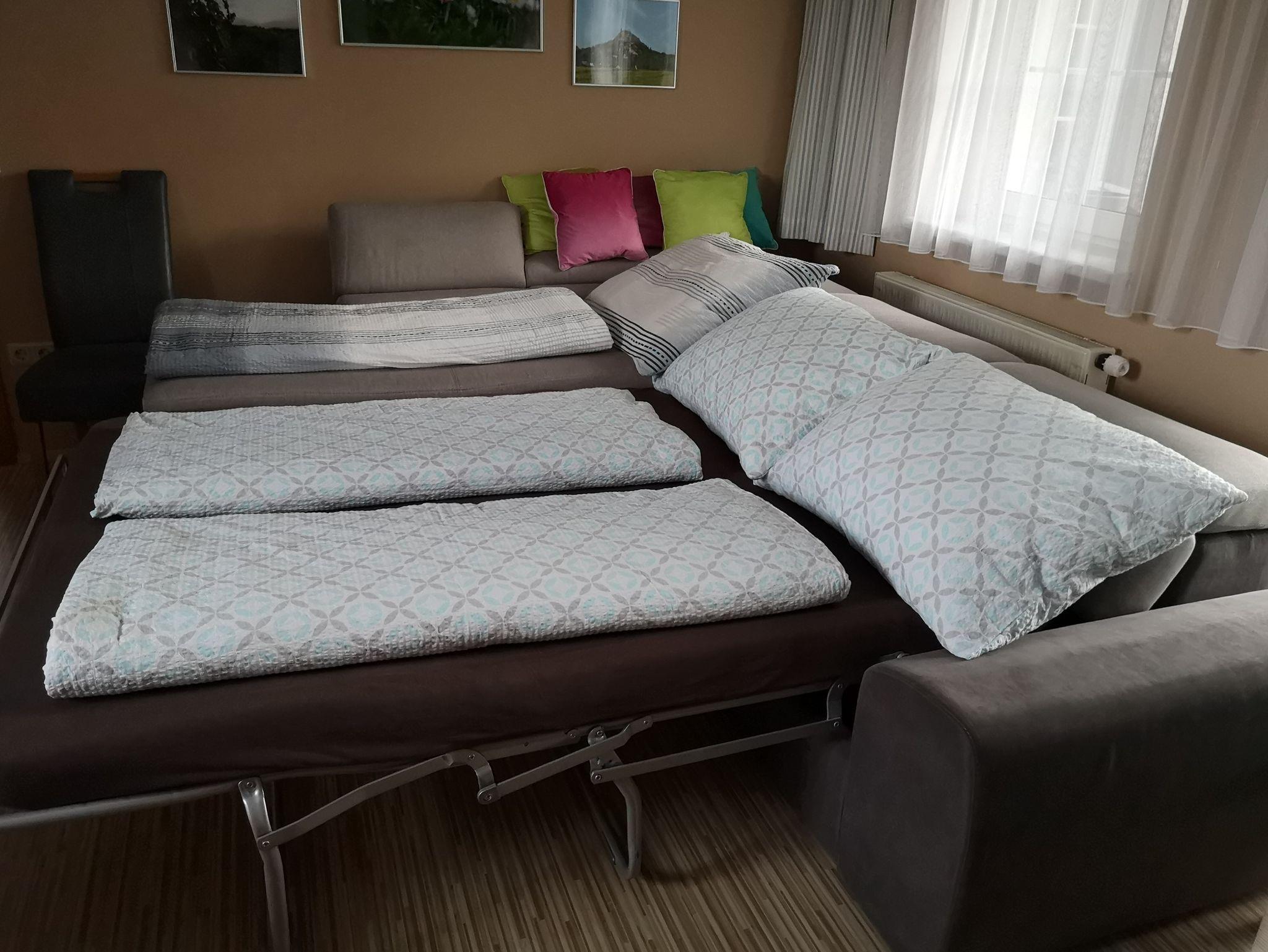Die Wohnung besteht aus einer großen Wohn-Küche mit ausziehbarer Bank (integrierte Matratze) für 2 Personen, einem Schlafzimmer mit Doppelbett und zusätzlichem Schlafsofa, einem großen Badezimmer mit Badewanne inkl. Dusche und Waschmaschine, einer seperaten Toilette, einem großen Schrankraum und einem Abstellraum im Eingangsbereich.