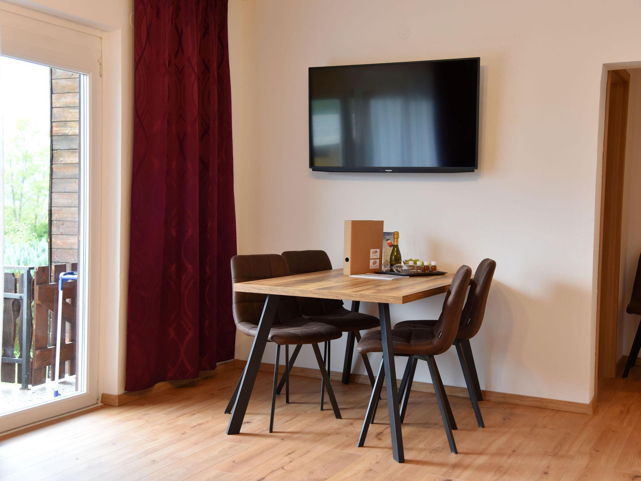 Es bietet einen Küchen-Wohnraum mit ausziebarer Couch, 2 Schlafzimmer mit Doppelbett und Kasten, Dusche mit Infrarotkabine, separates WC und einen Balkon.