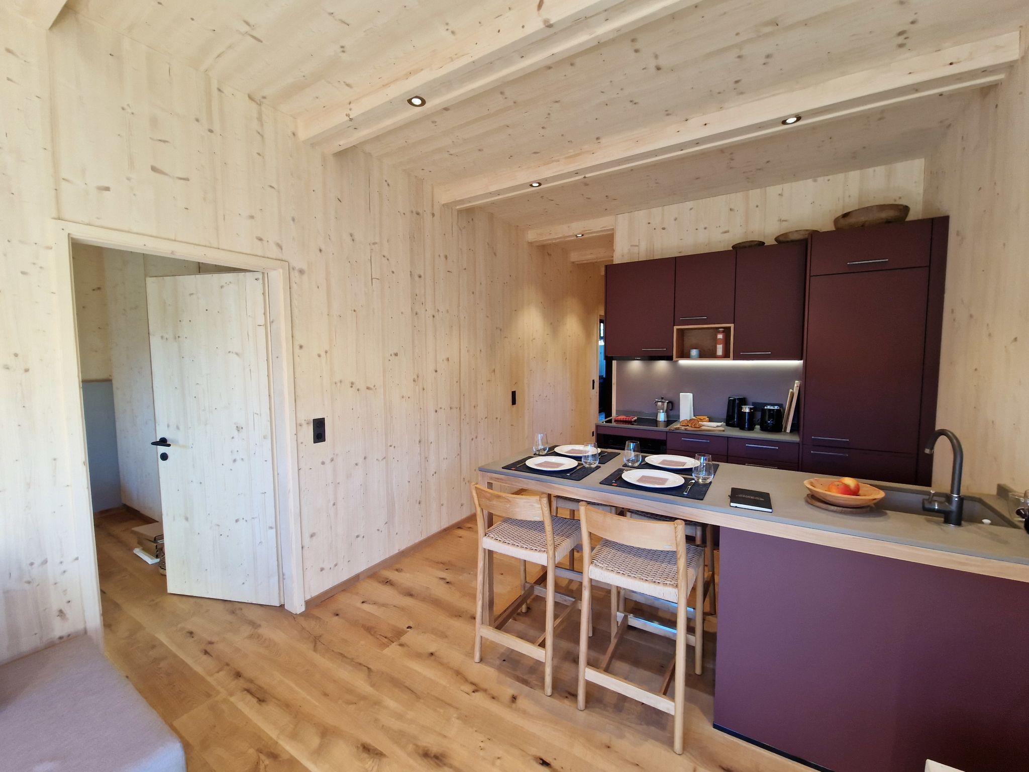 "Melchboden", 3-Zimmer-Wohnung 46 m2 im 1. Stock. Objekt geeignet für 2 Erwachsene + 2 Kinder. Hell, sehr gemütlich und mit viel Holz eingerichtet: 1 Doppelzimmer. 1 kleines Zimmer mit 1 x 2 Etagenbetten. Wohnküche (Backofen, Geschirrspüler, 4 Induktionskochplatten, Toaster, Wasserkocher, elektrische Kaffeemaschine) mit Esstisch und Sat-TV (Flachbildschirm). Bad/WC. Fussbodenheizung. Terrasse. Terrassenmöbel. Herrliche Panoramasicht auf die Berge. Zur Verfügung: Haartrockner. Internet (WLAN, gratis).