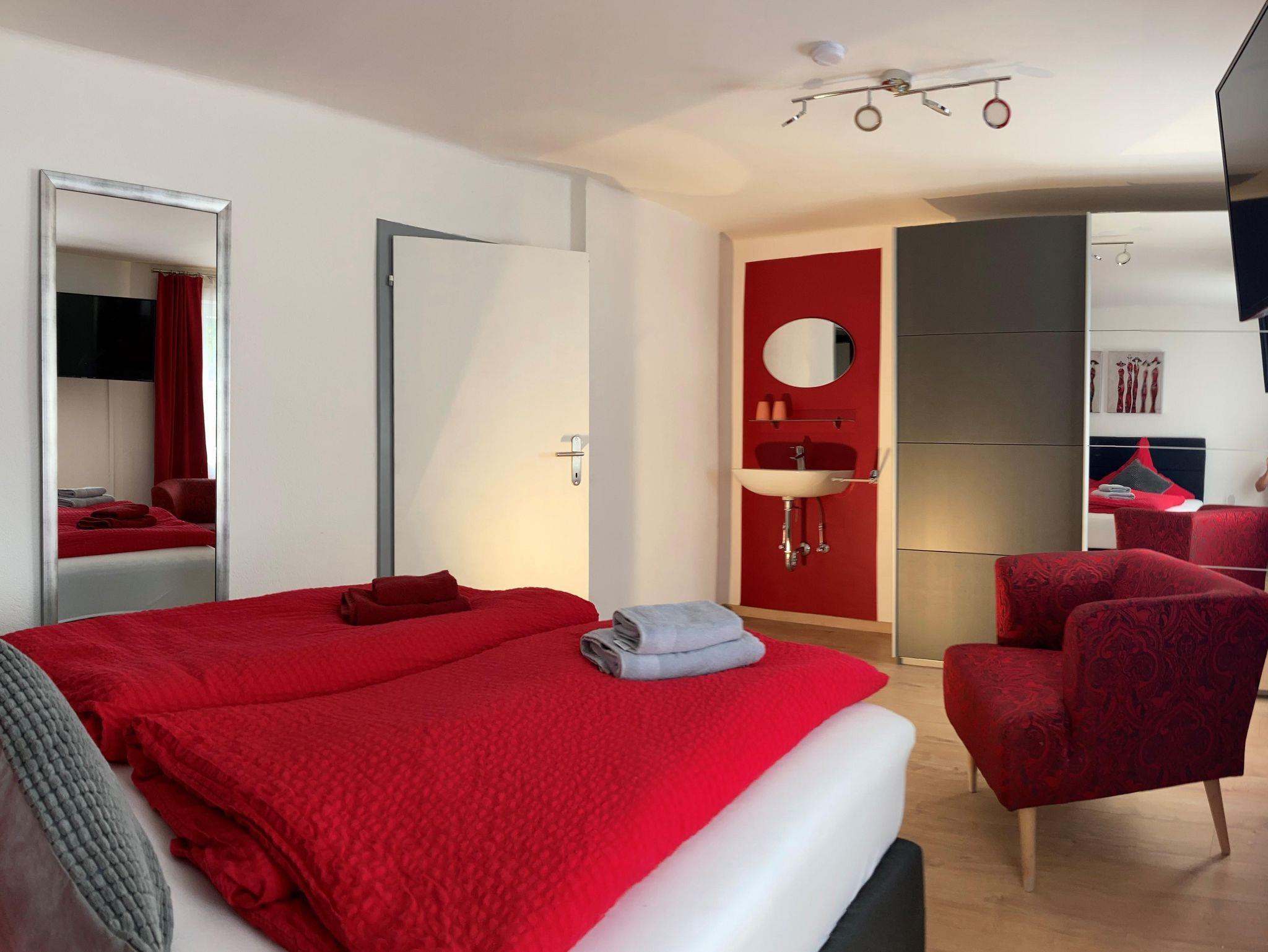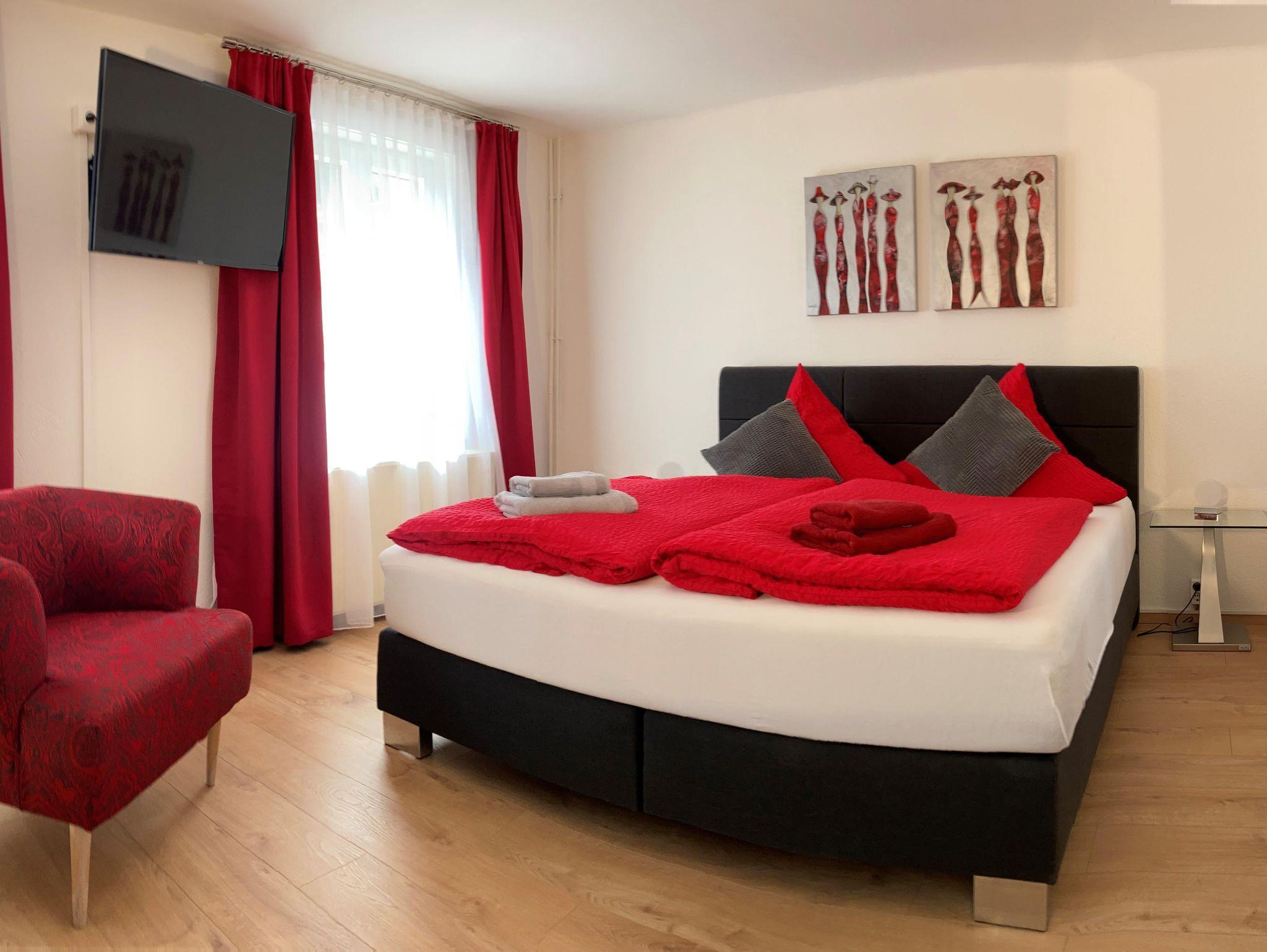 • 1 Schlafzimmer (2 Personen) mit modernem Doppelbett (Boxspringbetten), Kleiderschrank, Spiegel und Flat-TV