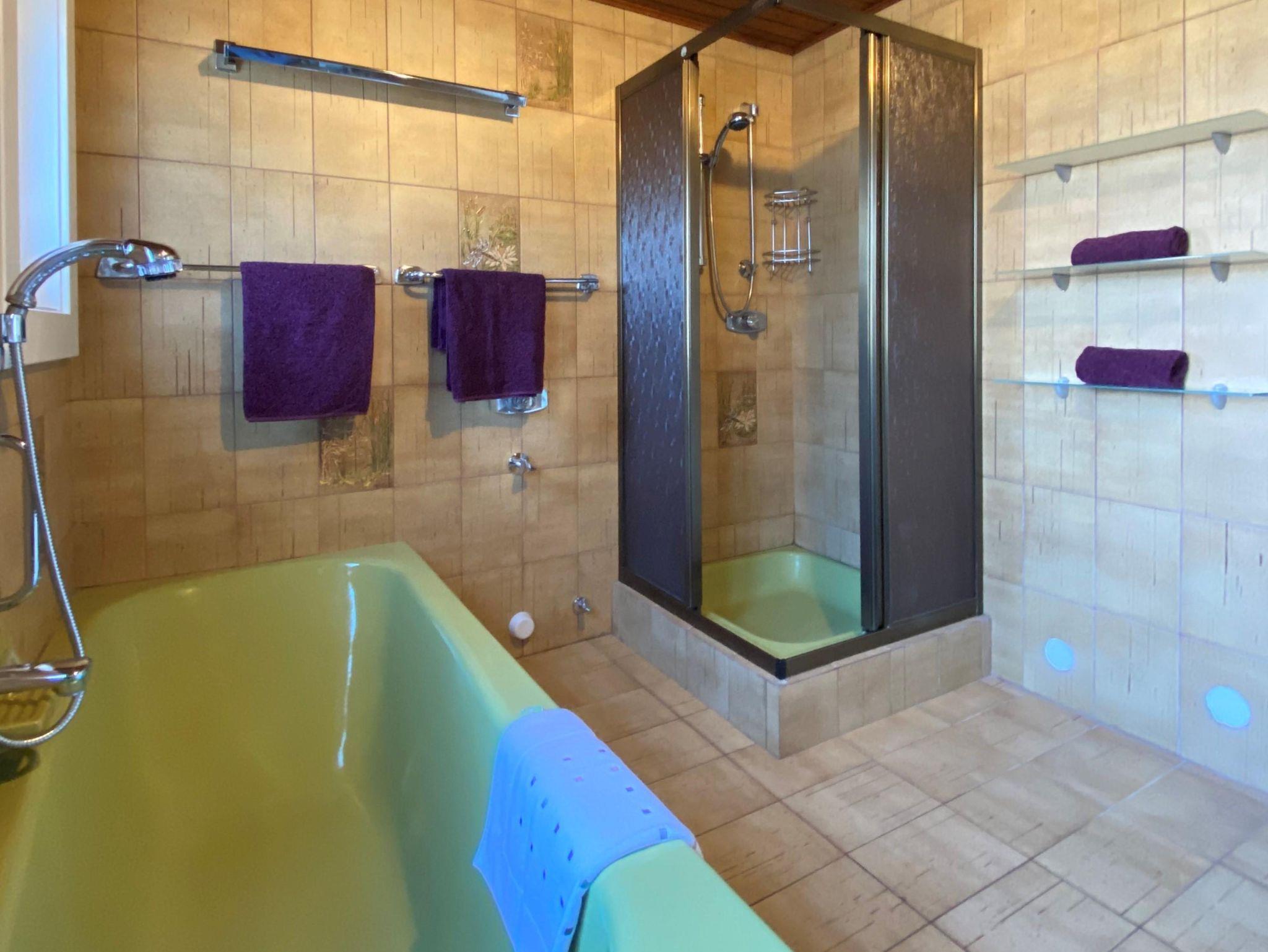 • 1 Badezimmer mit Badewanne, Dusche, WC, Waschbecken, Fön, Kosmetikspiegel