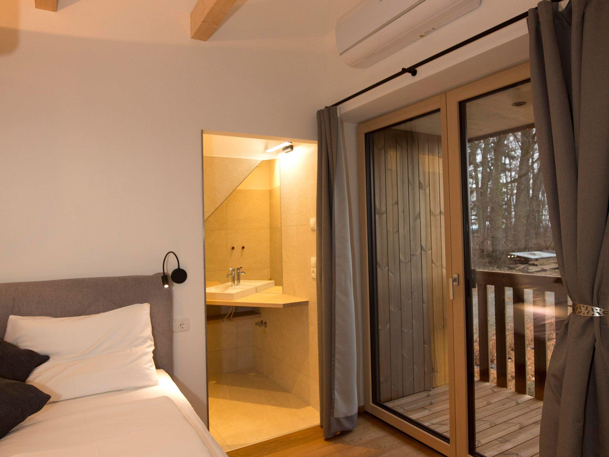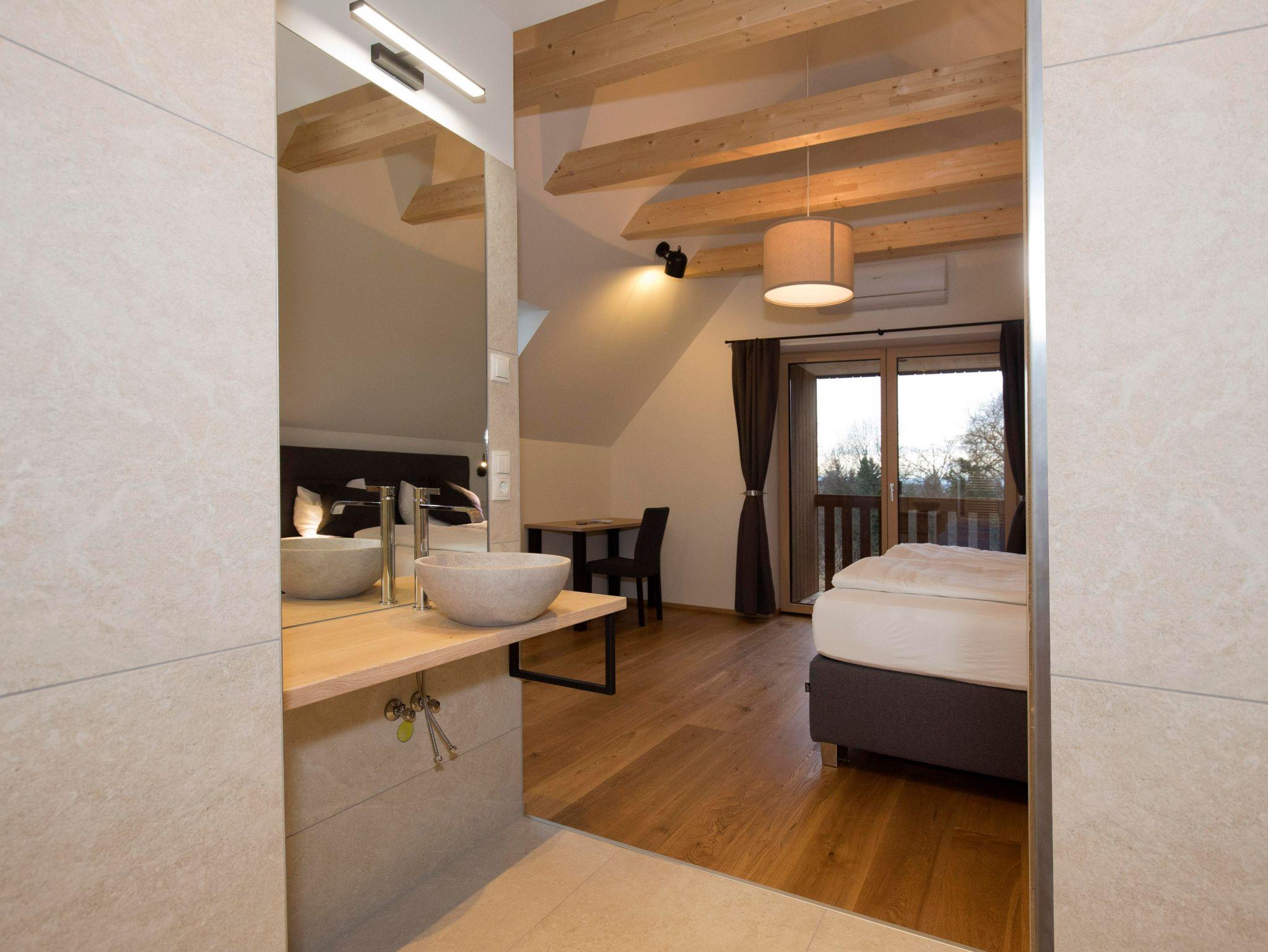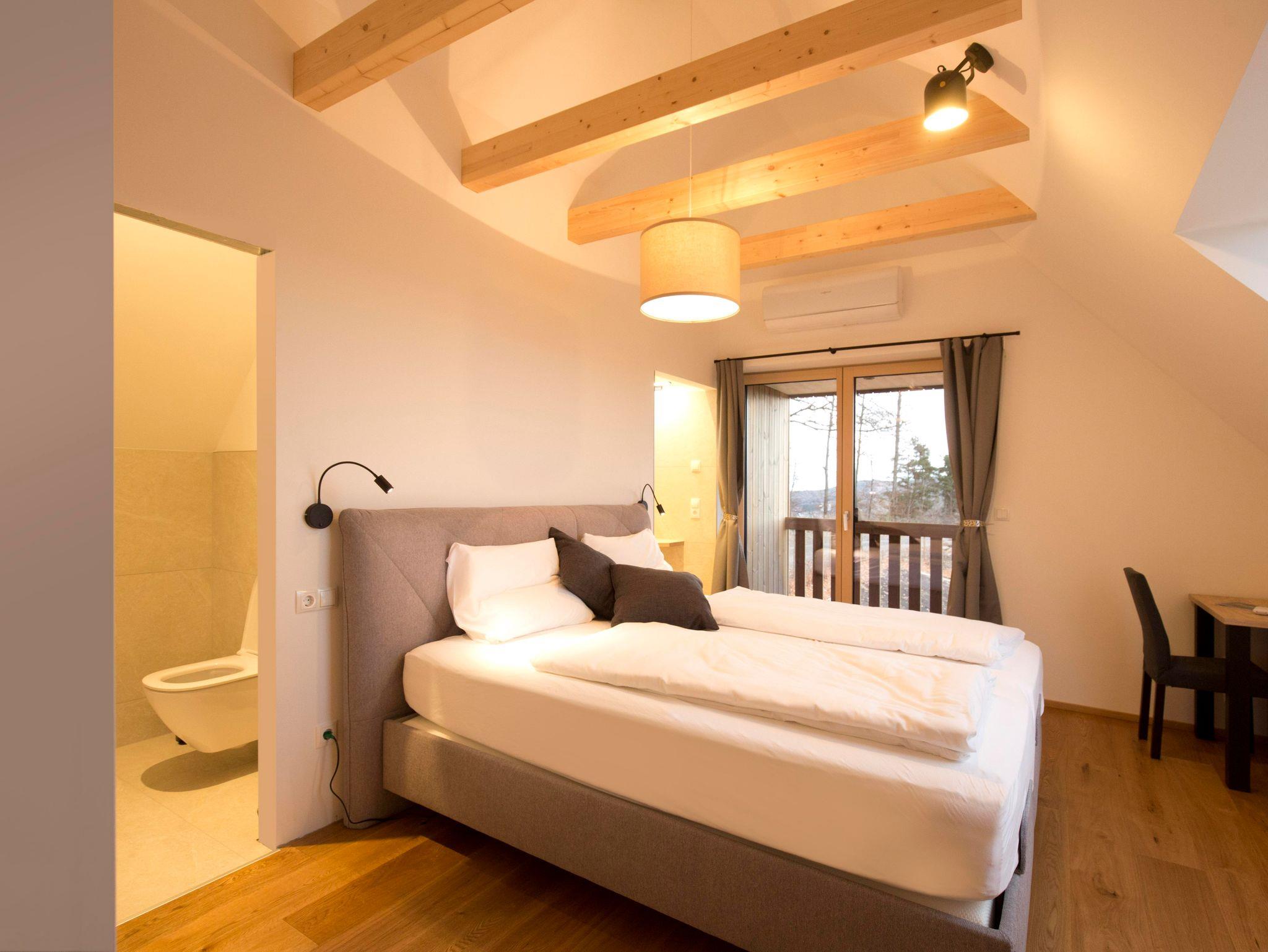 Auf der Holzterrasse können Sie die Sonne den ganzen Tag über genießen, sich im privaten Whirlpool entspannen oder in der stilvollen Spiegelsauna den Abend ausklingen lassen.