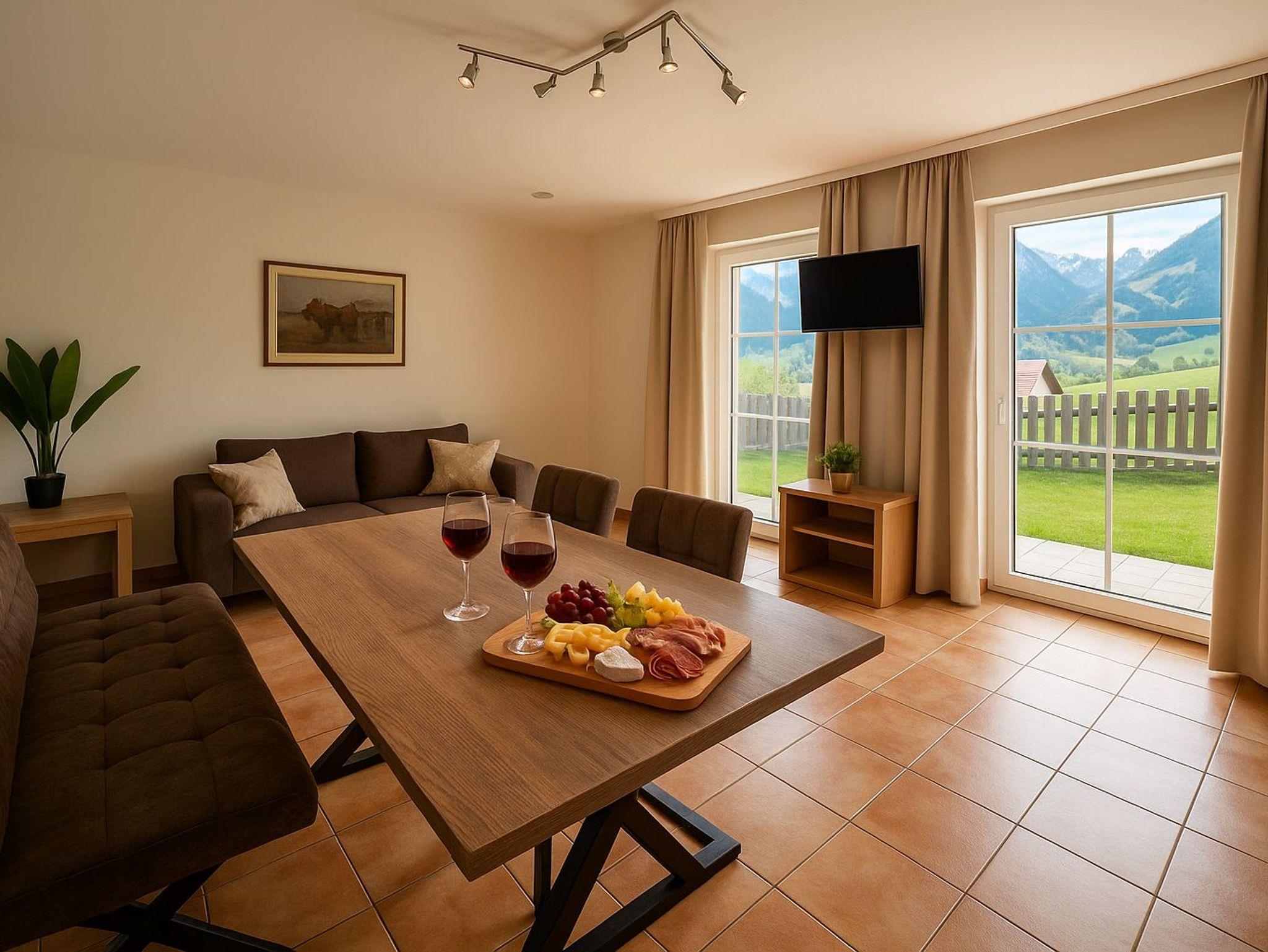 Ferienwohnung 5 ist 42 m² groß. Diese Wohnung besteht aus einem Schlafzimmer, einer Küche, einer Dusche / WC, einem Vorraum mit Garderobe, eigener Terrasse und Balkon und einer großen Liegewiese.