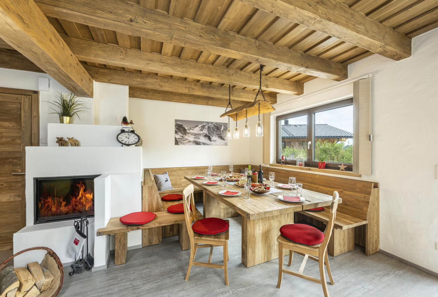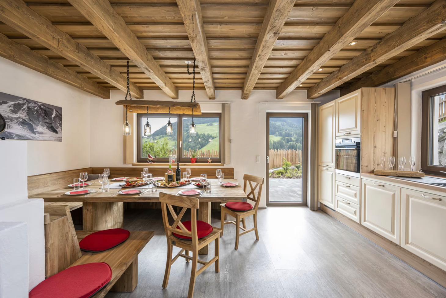 Die moderne Küchenzeile lässt auch bei Profi-Köchen keine Wünsche offen. Neben einem Induktions-Kochfeld gibt es einen Backofen, einen Kühl- und Gefrierschrank sowie allerhand elektrische Küchengeräte (Kaffeemaschine, Toaster und Wasserkocher). Der große Esstisch bietet allen Gästen ausreichend Platz. Aus dem Wohnbereich gelangt man auf die möblierte Terrasse, welche einen traumhaften Ausblick auf die umliegende Bergwelt bietet.