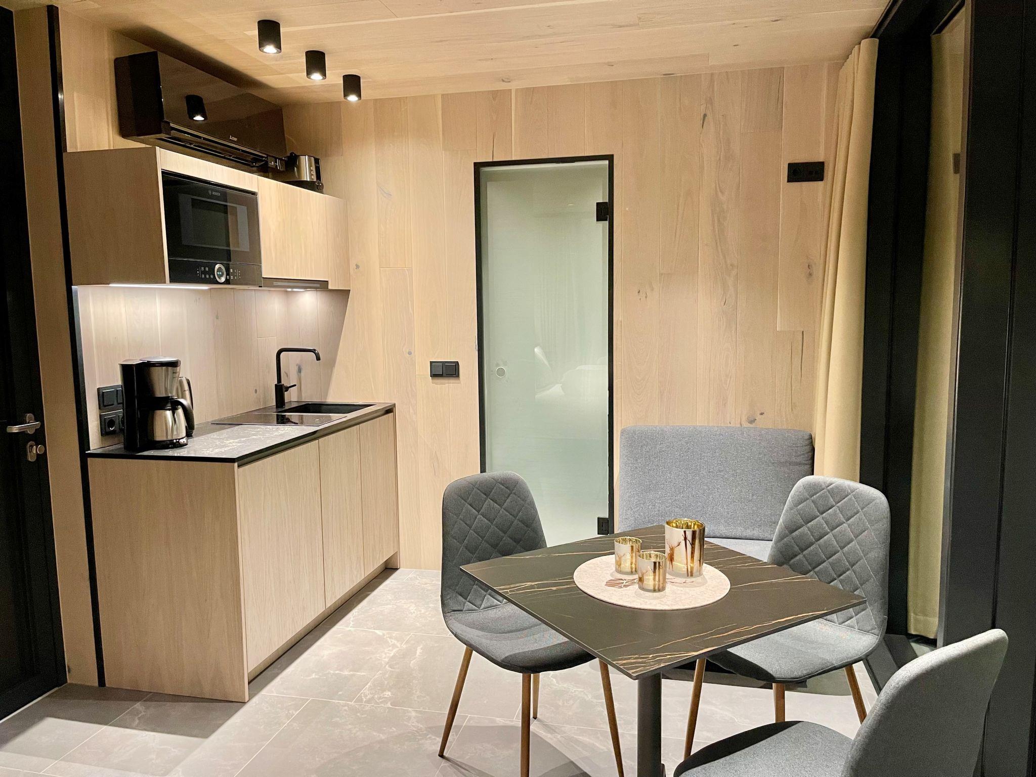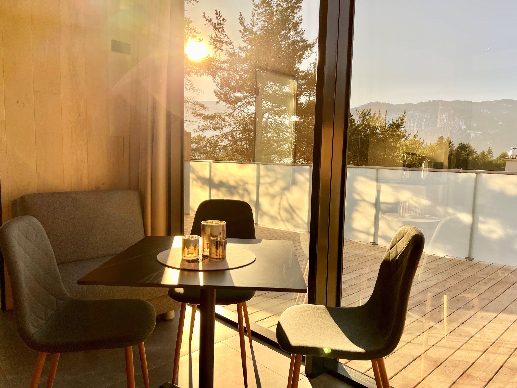 "Panorama Lodge", 1-Zimmer-Chalet 20 m2, Südwestlage. Modern und luxuriös eingerichtet: grosse Wohnküche (2 Glaskeramikplatten, Toaster, Wasserkocher, Mikrowelle, elektrische Kaffeemaschine) mit 1 Doppelbett (160 cm, Länge 200 cm), TV (Flachbildschirm). Dusche/WC. Natursteinboden. Grosse Terrasse, Südlage und Westlage. Terrassenmöbel. Schöne Sicht auf die Berge. Zur Verfügung: Internet (WLAN, gratis). Parkplatz (überdacht). Bitte beachten: Nichtraucher-Unterkunft. Maximal 1 Haustier/Hund erlaubt. Atemberaubendes "Glashaus"- bei Tag keine Einblicke von Aussen! Nachtvorhang zur Verdunkelung ist vorhanden. Zirbenbett!