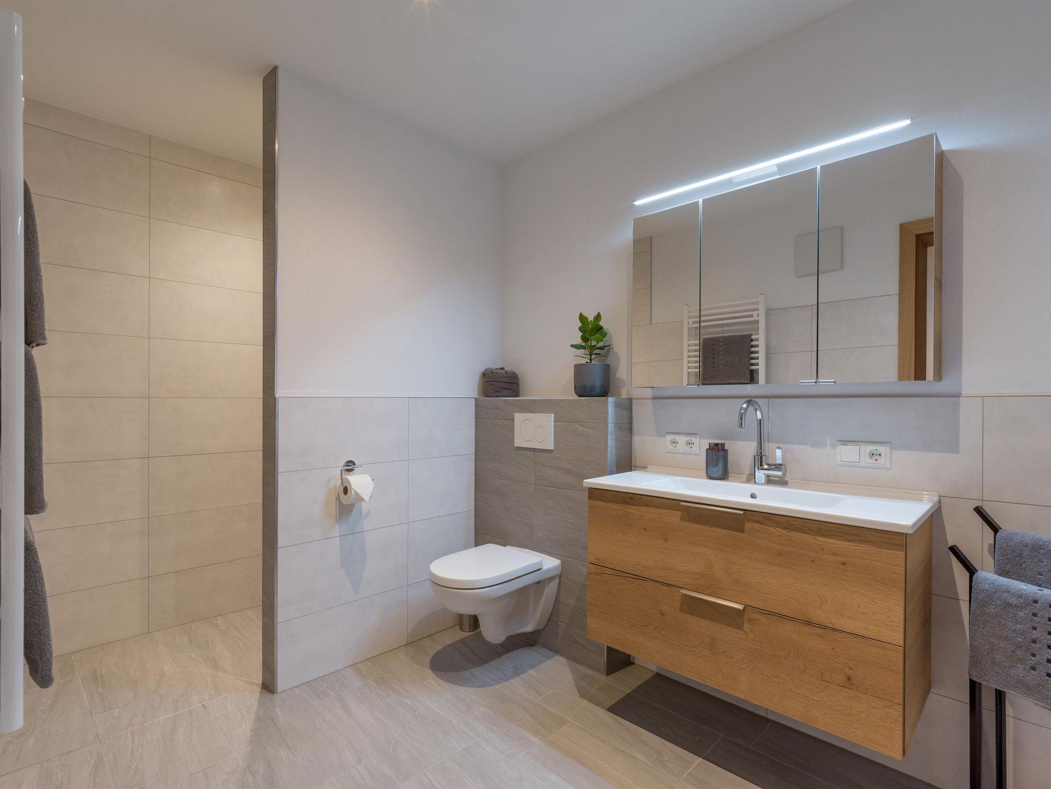 • Bad mit ebenerdiger Regendusche, WC und Handtuchtrockner