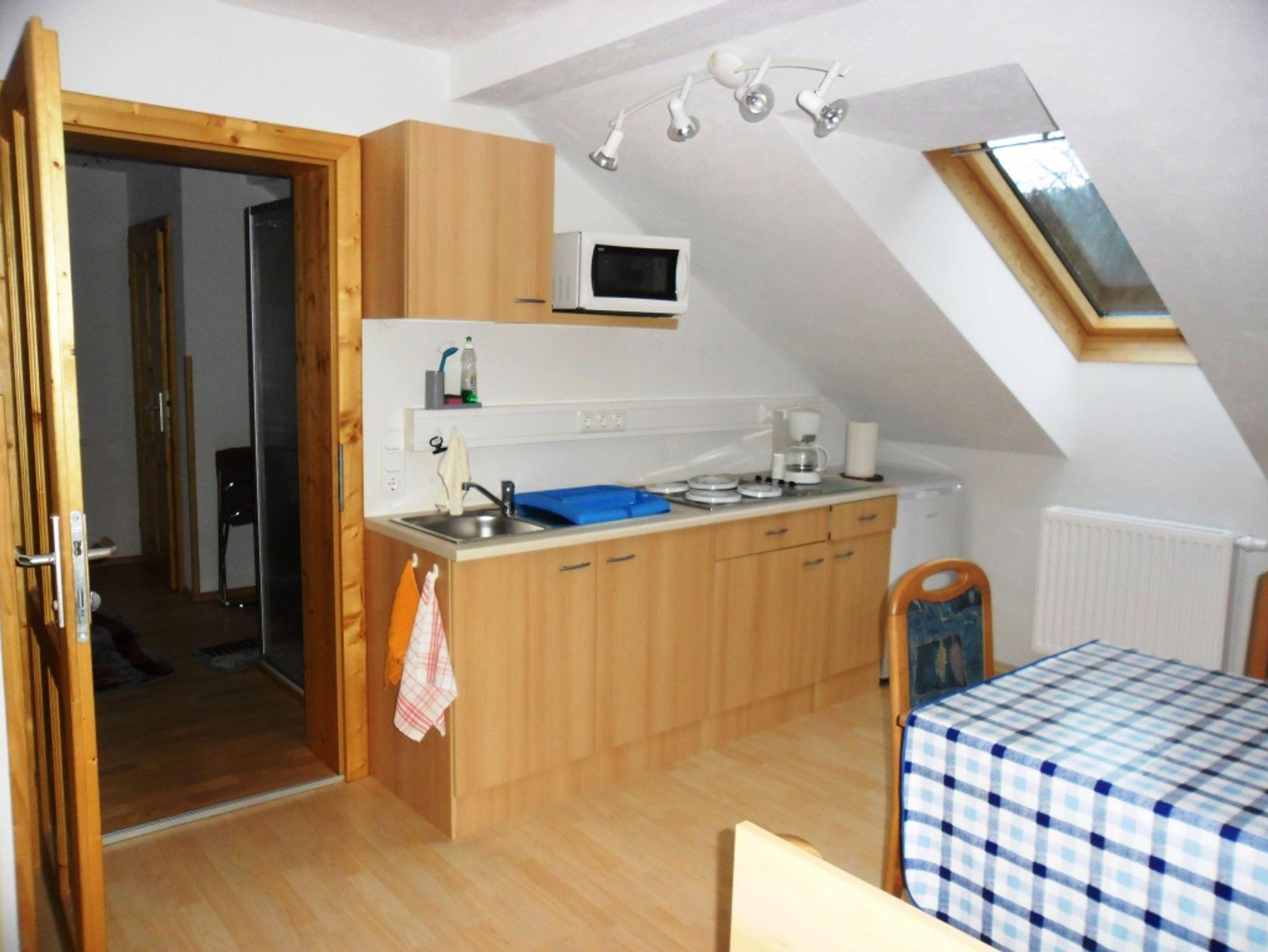 Diese Wohnung bietet einer großen Familie oder auch Freunden genügend Platz. In der dazwischen liegenden Wohnküche kann man gemütlich zusammen sitzen und schöne Stunden verbringen. Ausgestattet ist die Küche mit einer Filterkaffeemaschine, Teekocher, Toaster, Mikrowelle, Minibackofen, und mit einem Kühlschrank mit kleinem Gefrierfach.