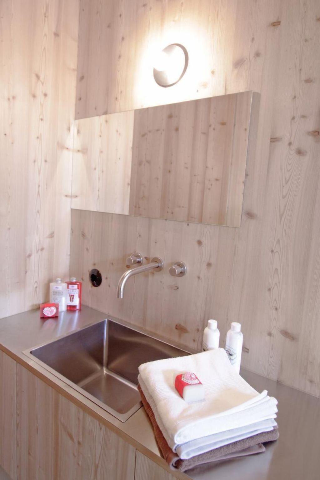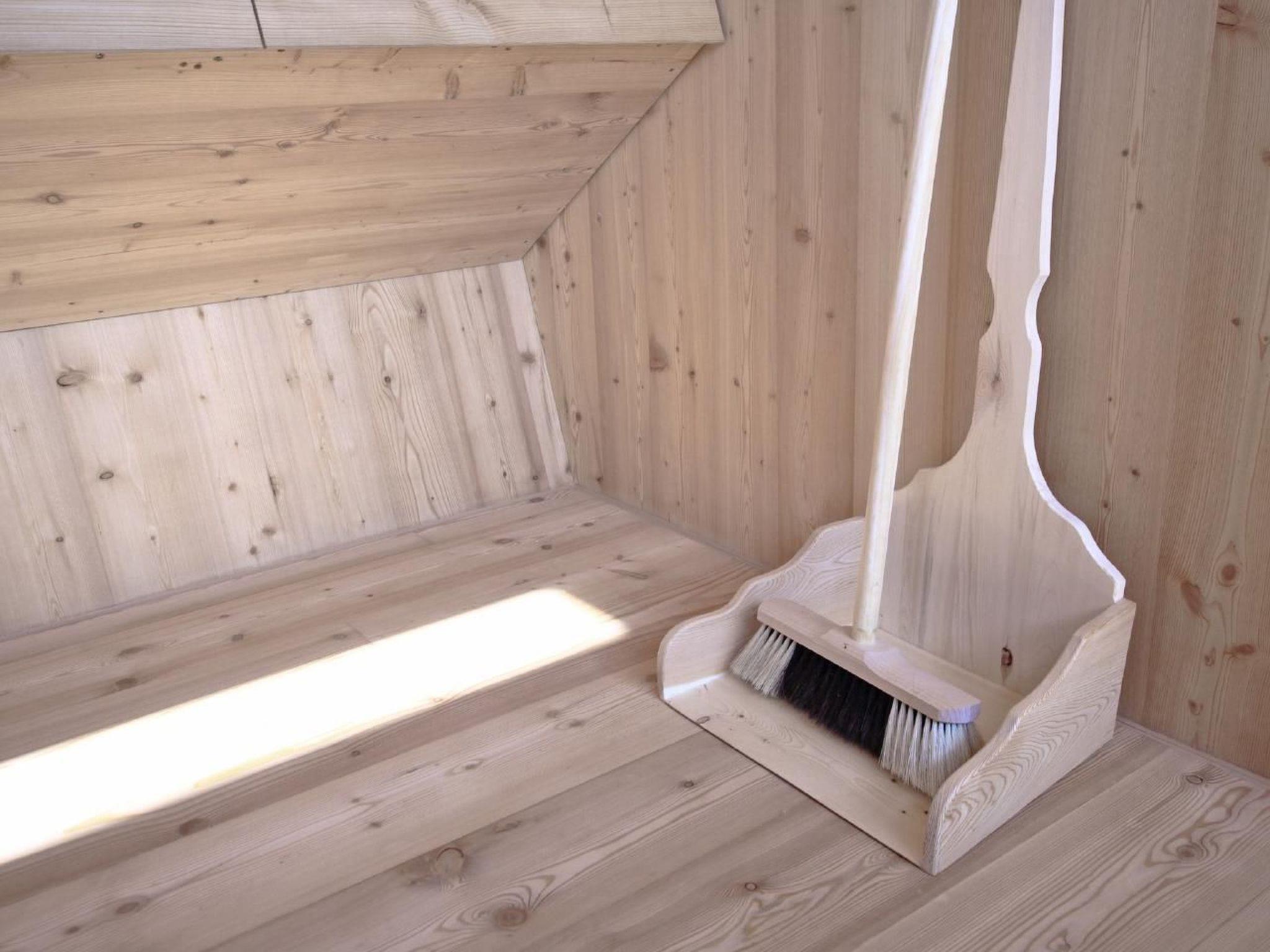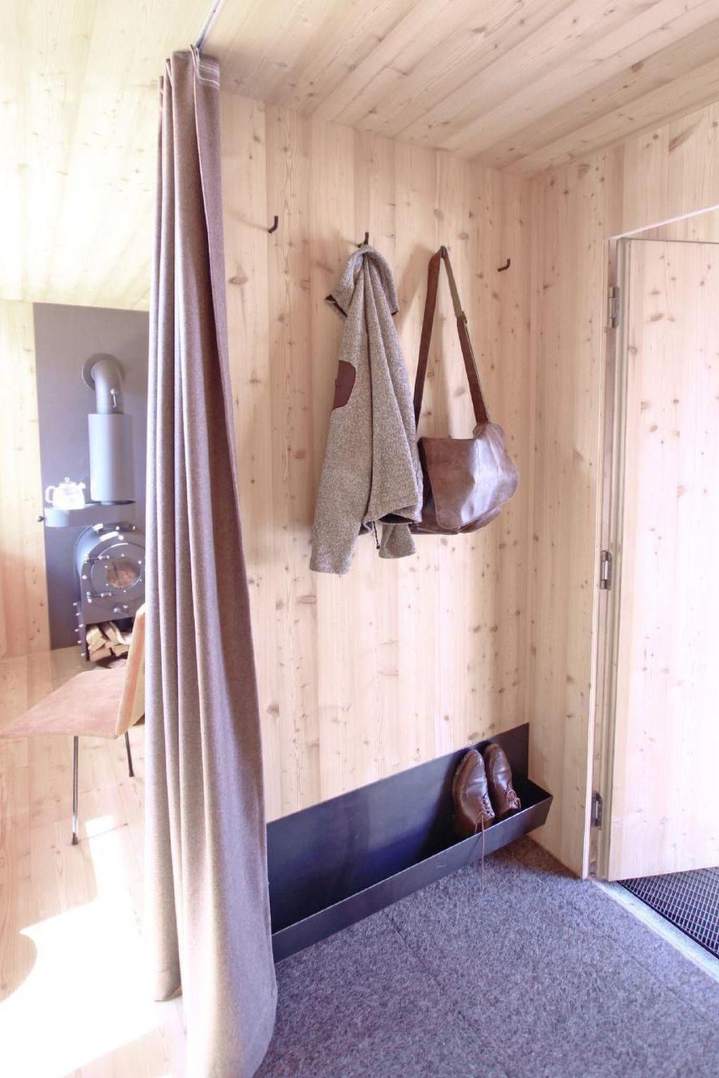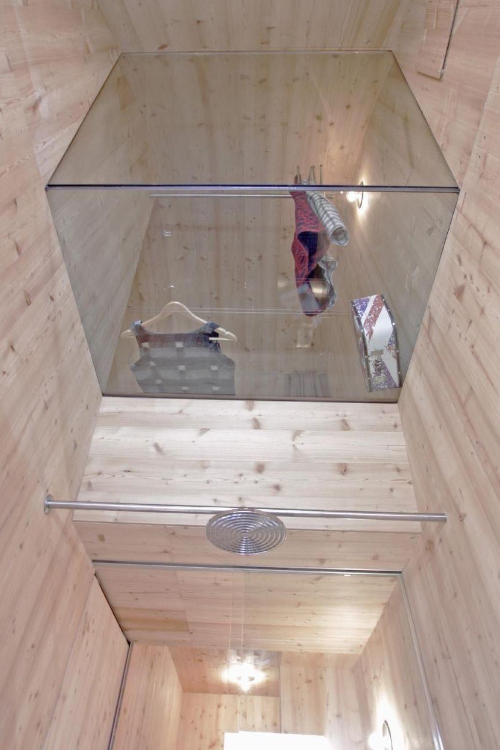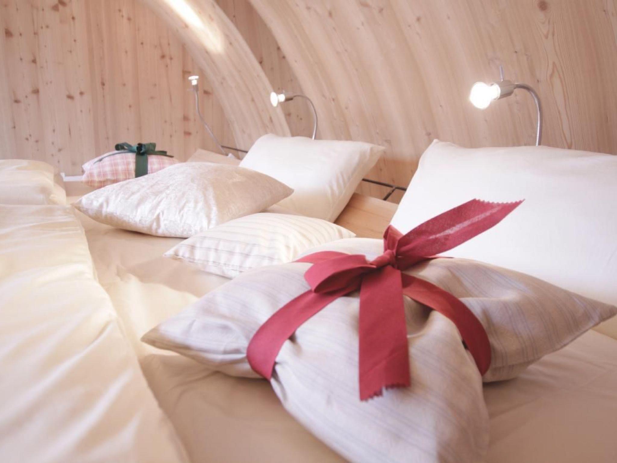 Auf der offenen Empore sind die Schlafplätze untergebracht. Aufgeteilt sind die Betten im Ufogel auf ein großzügiges Doppelbett aus Zirbenholz und einer weiteren Schlafkoje für zwei Personen.