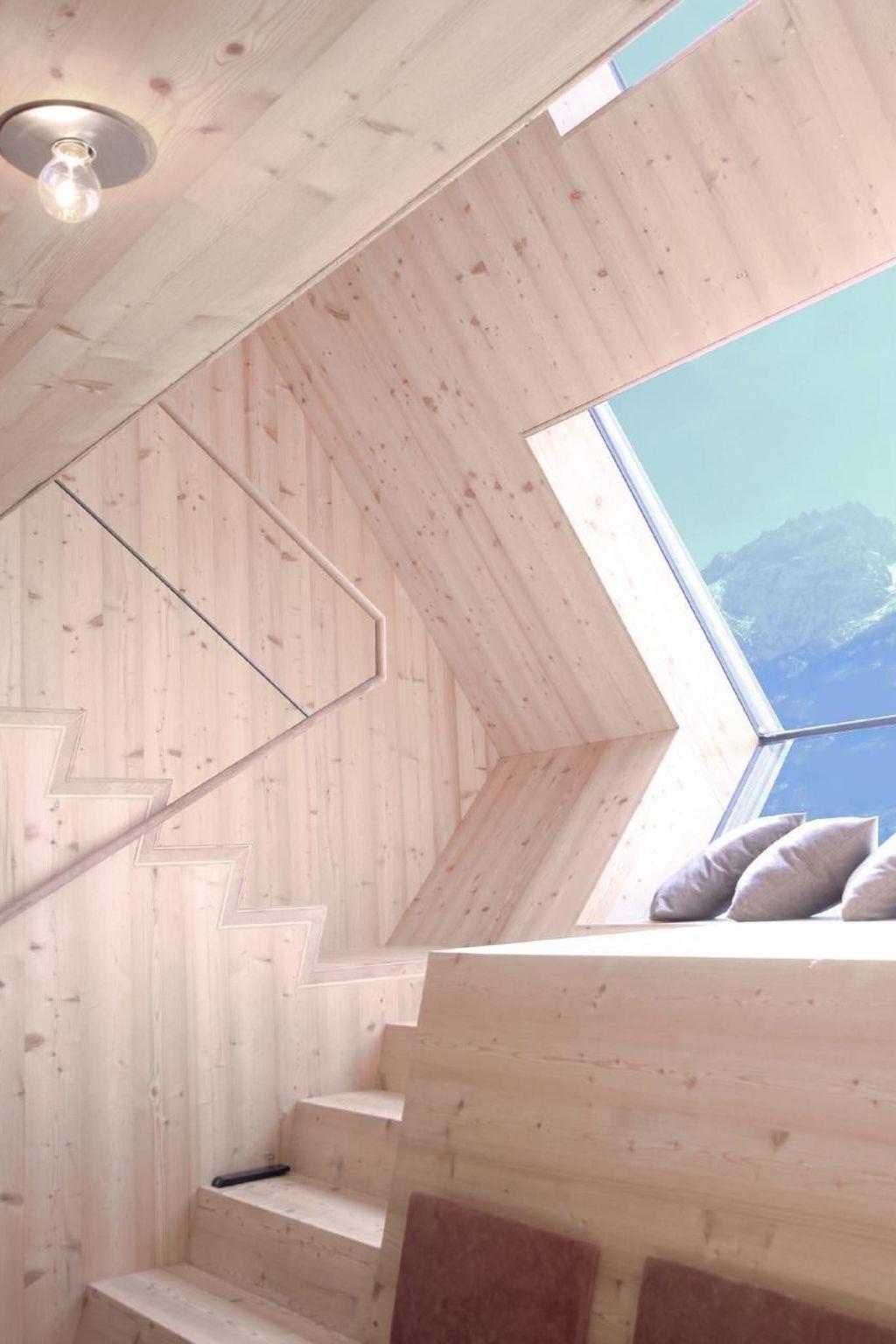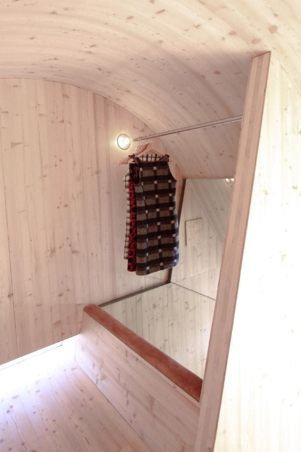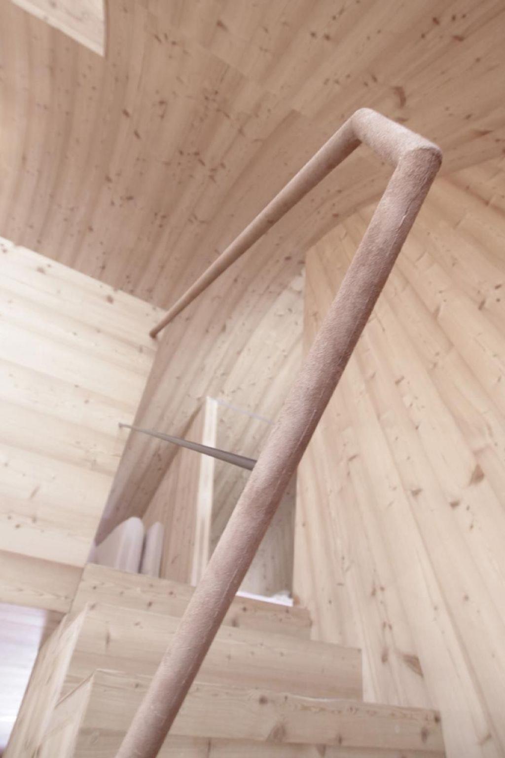 Wohnen in einer Holzskulptur: herzlich Willkommen im Ufogel! Das ist kein Haus von der Stange, eher eine Wohnskulptur, die sich beim Eintreten als Raumwunder entpuppt. Ein großzügiger, brückenartiger Zugang als einzige Verbindung zum scheinbar schwebendem Gebäude. Wenn man im Ufogel sitzt, liegt, oder gemeinsam eine Mahlzeit einnimmt, ist zweierlei immer gegenwärtig: das Holz und der Himmel.