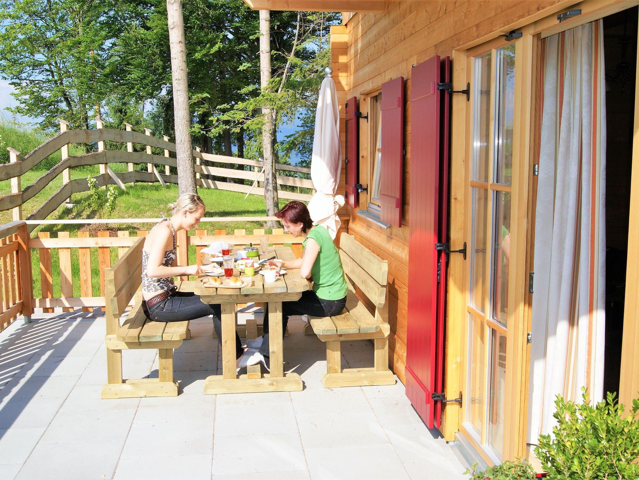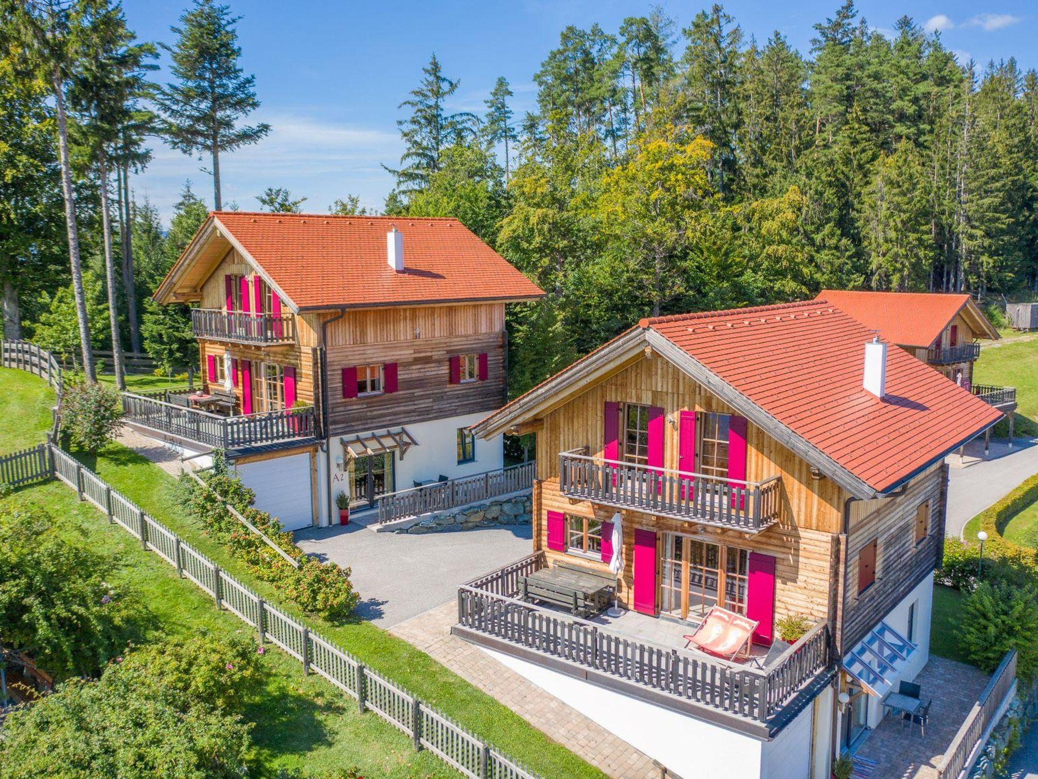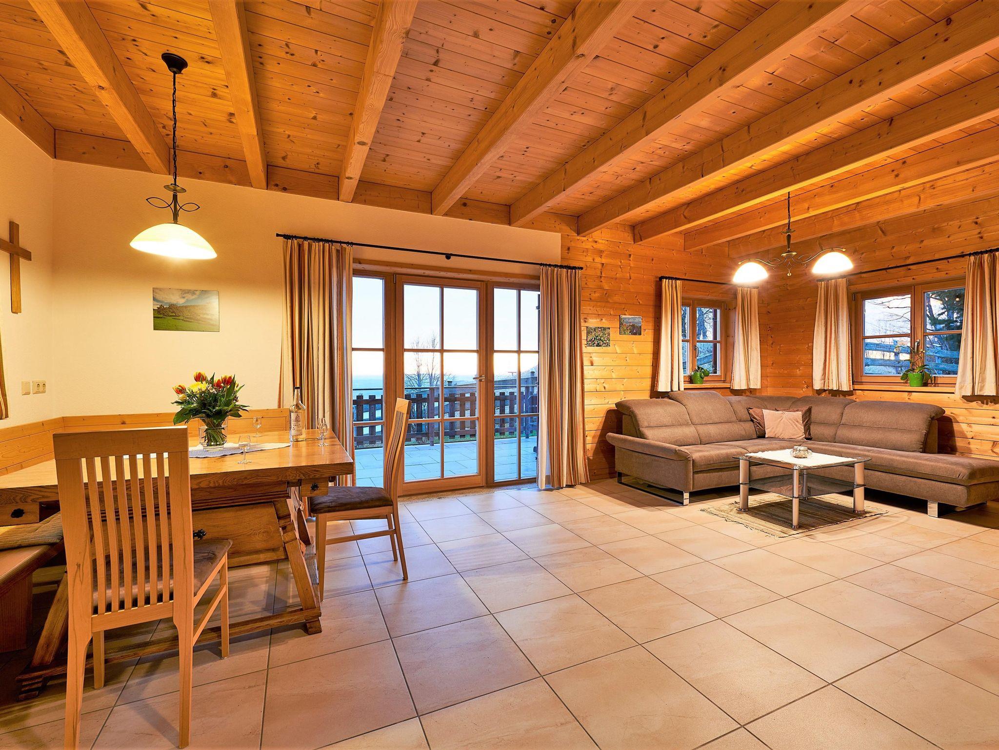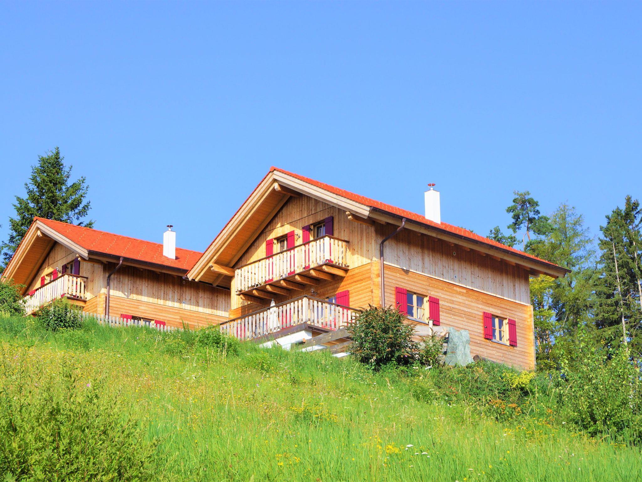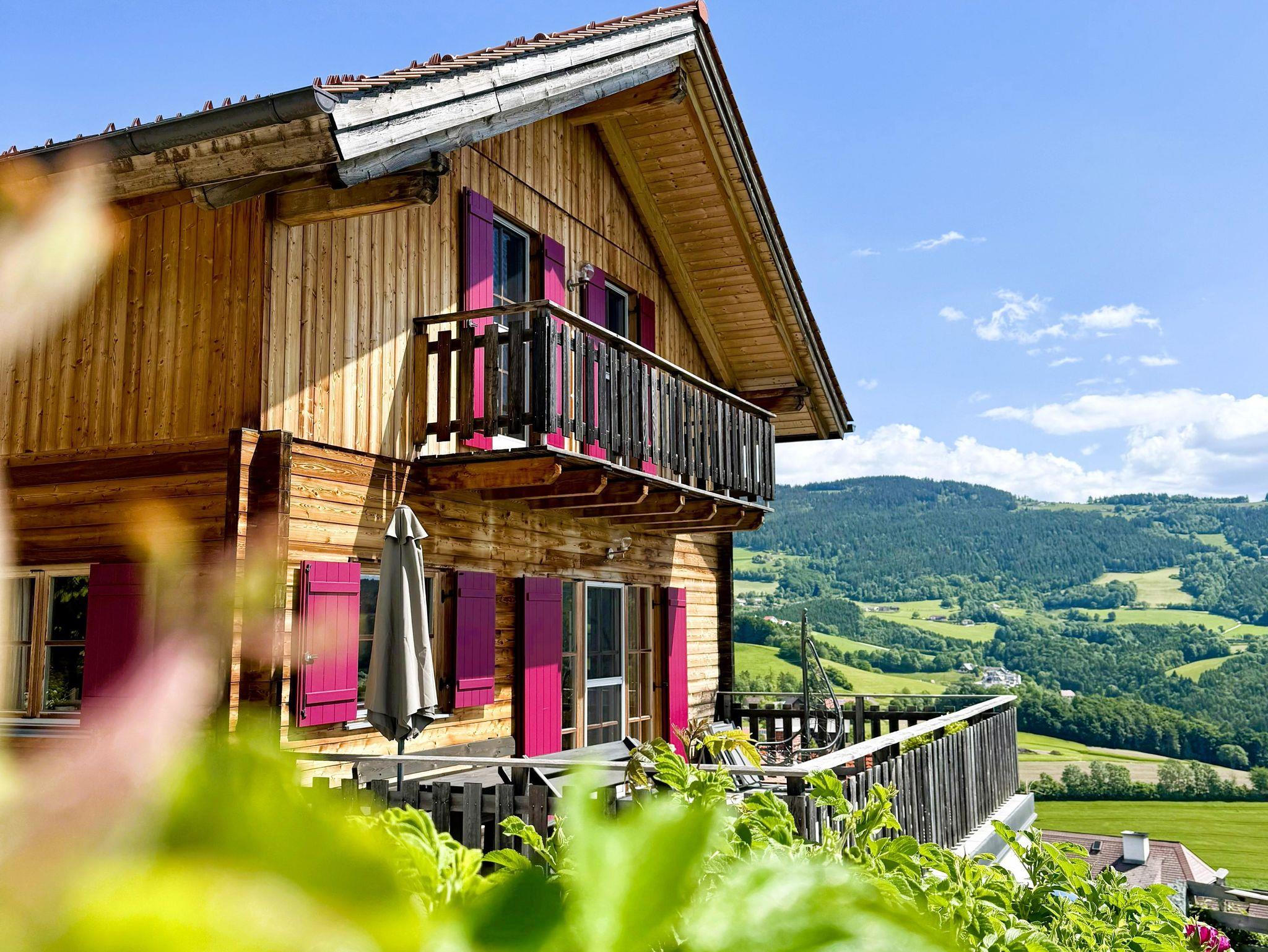 Mit edlem Holzdesign ausgestattetes Ferienhaus, ruhige Lage, traumhafte Ausblicke ins Unendliche, Lärchenholzduft, große Terrasse mit Ausblick, 2 Zimmer mit Balkon, kleine Sauna, drei Schlafzimmer, Teich in der Nachbarschaft