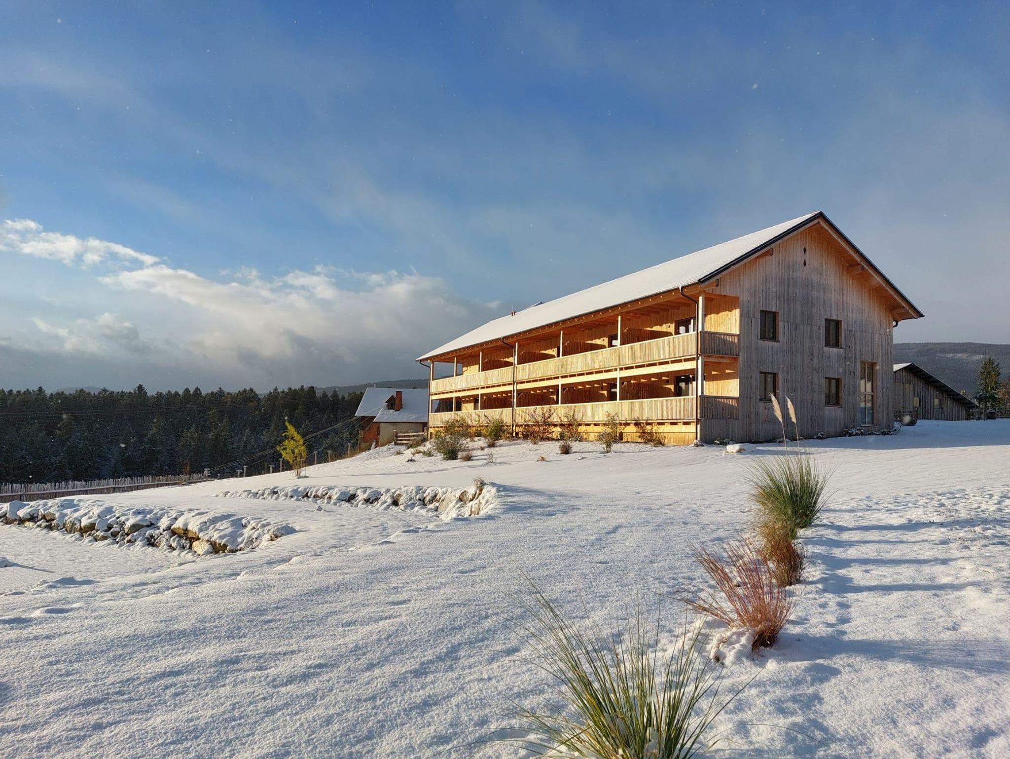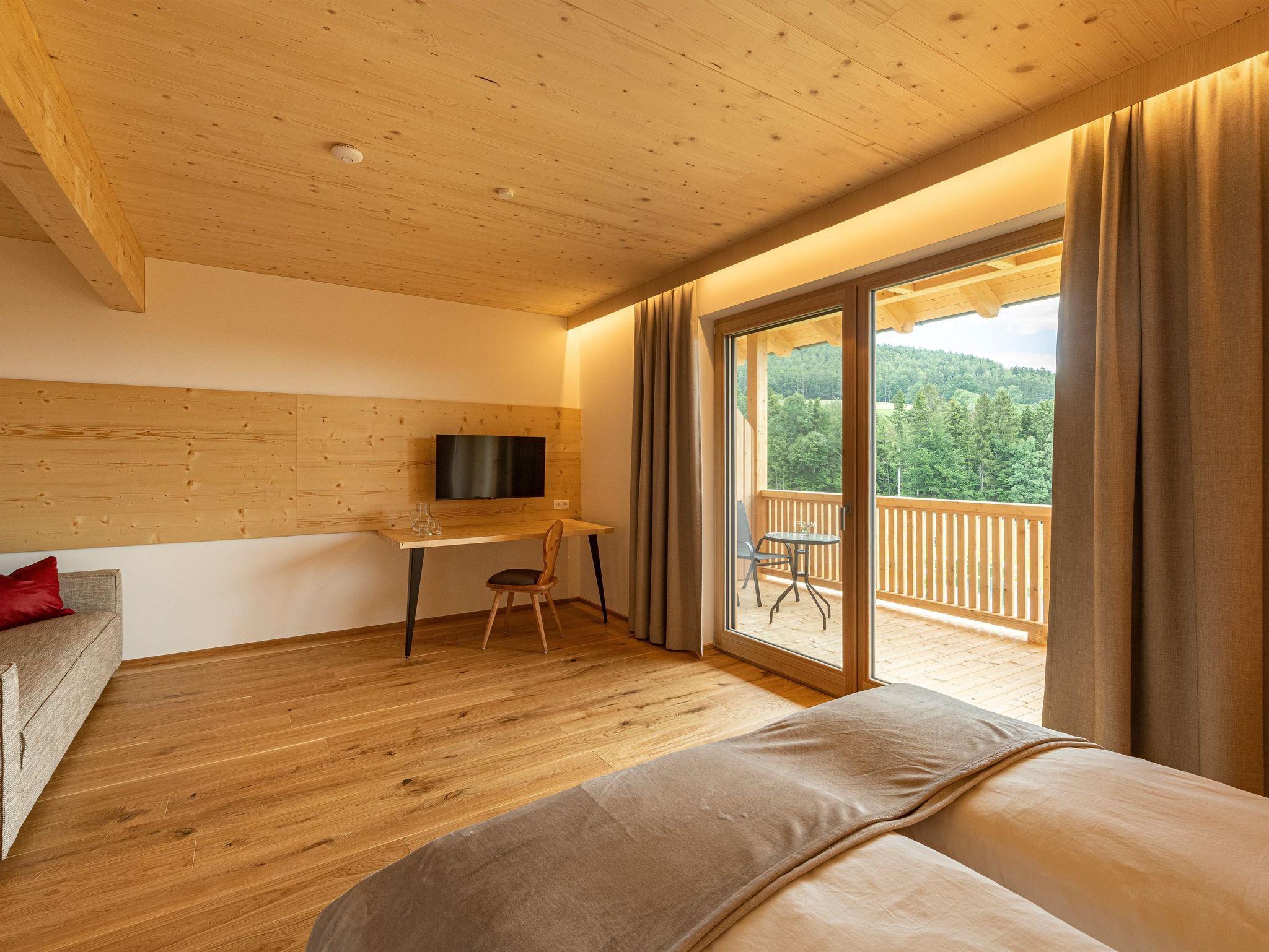 Deluxe ist ein gemütliches Doppelzimmer in unserem neuen Holzhaus. Vom großzügigen Balkon haben Sie einen wundervollen Blick auf unseren Naturteich und die umliegende Berglandschaft. Vom Zimmer können Sie den Sonnenaufgang und sehr oft auch Wildwechsel beobachten.