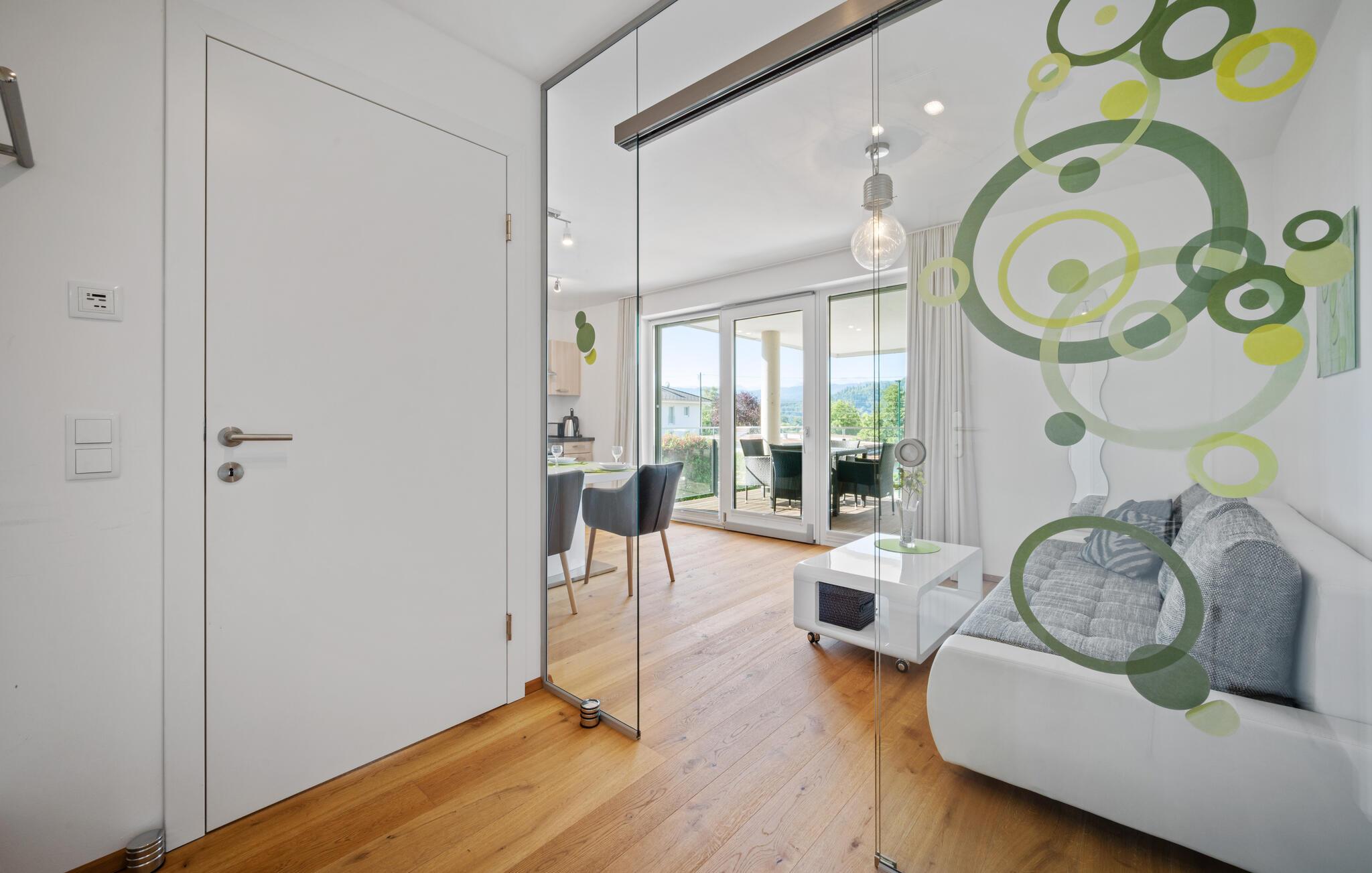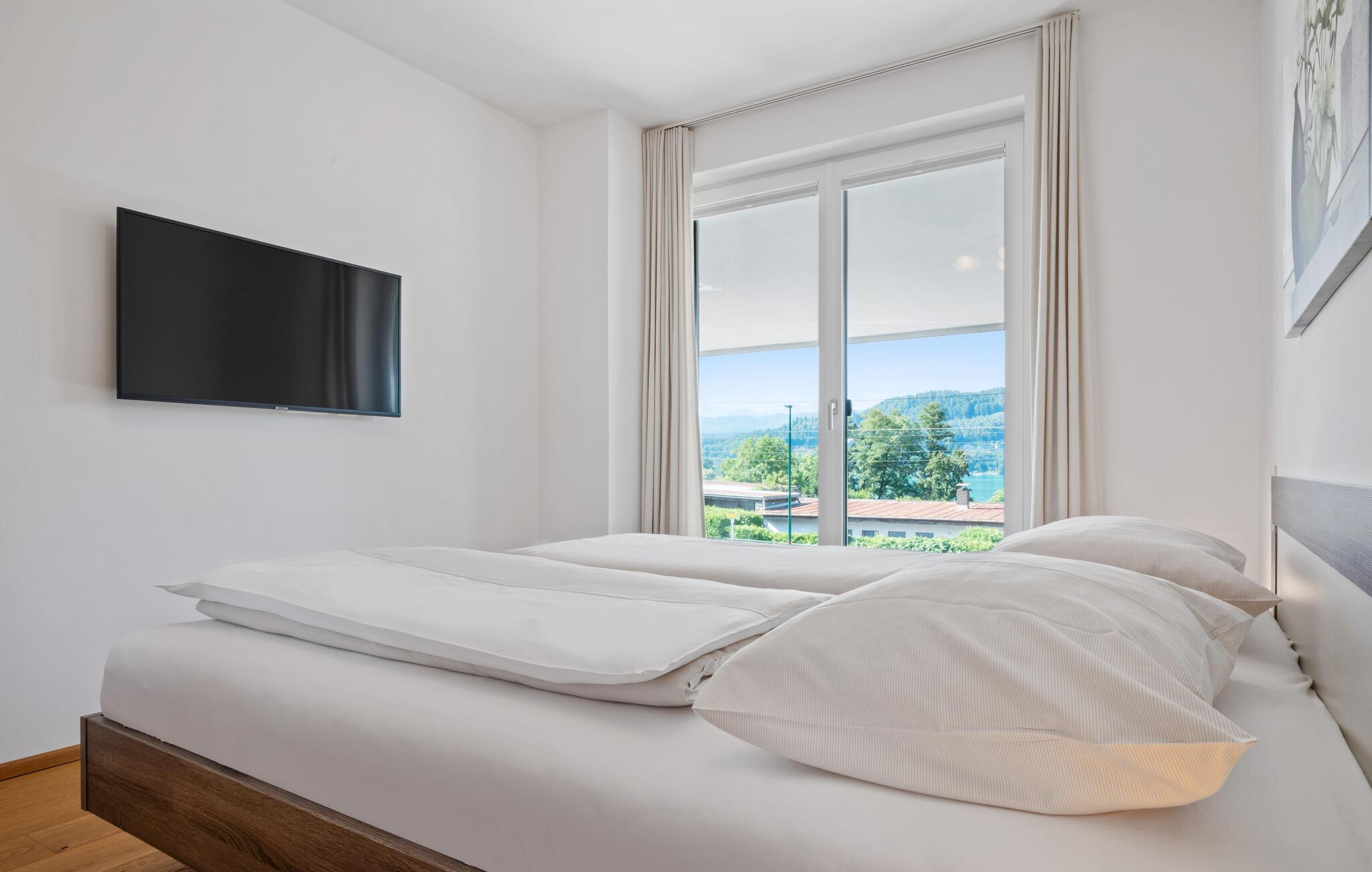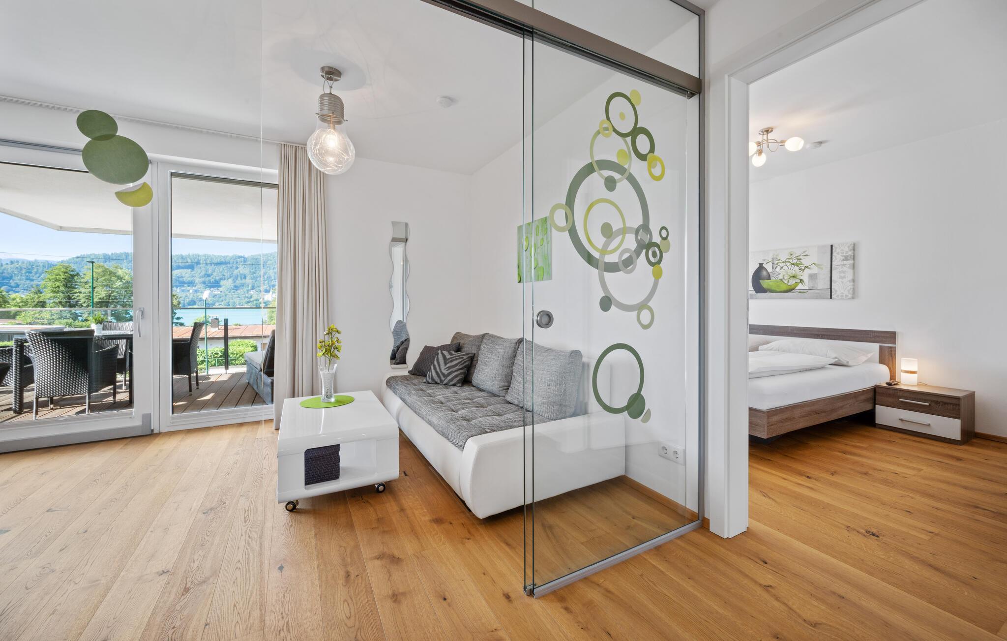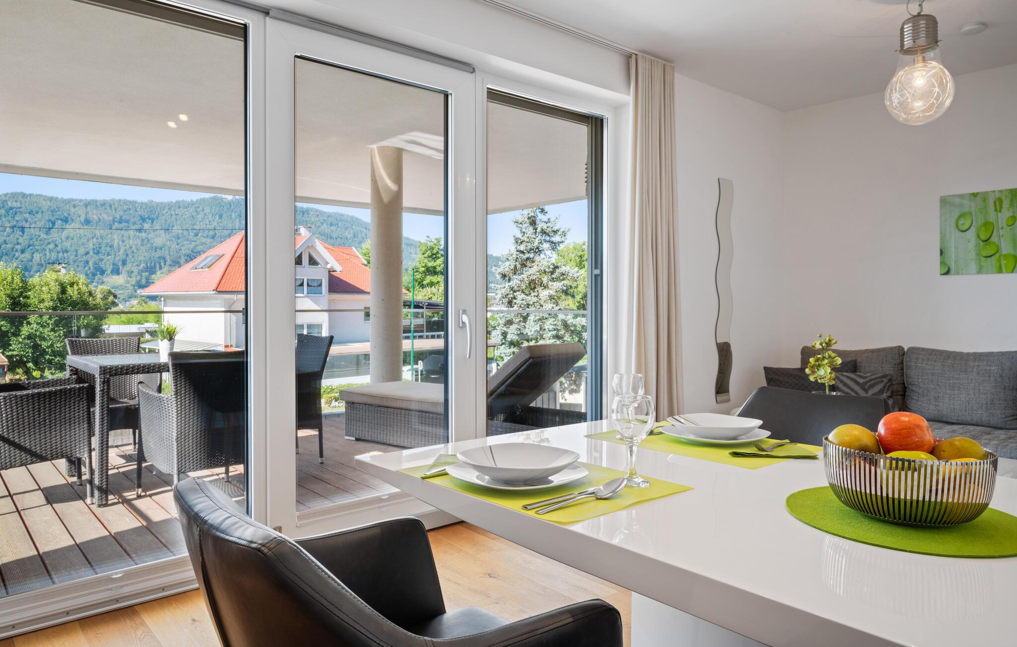 Diese helle und moderne Ferienwohnung begrüßt Sie mit einem angenehmen Ambiente, in dem eine geschmackvolle Einrichtung und viel natürliches Licht für echte Wohlfühlatmosphäre sorgen. Bodentiefe Fenster eröffnen Ihnen einen zauberhaften Blick auf den Wörthersee. Freuen Sie sich auf harmonische Mahlzeiten am einladenden Esstisch und machen Sie es sich nach einem aktiven Tag in der Natur für einen Filmabend auf dem Sofa gemütlich.