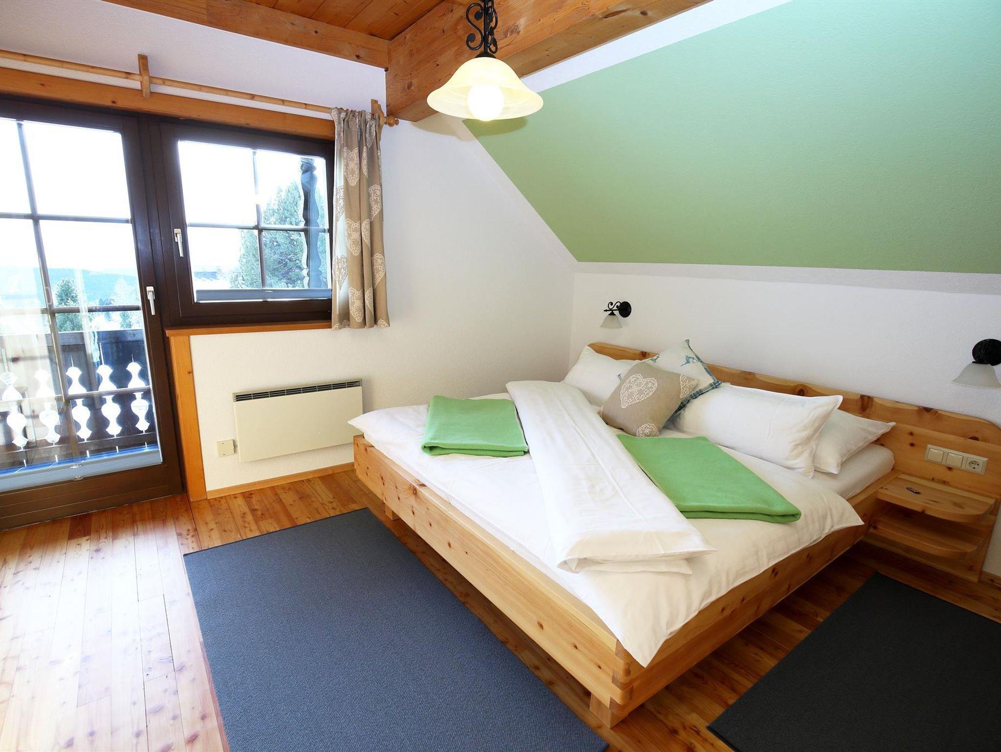 Die Ferienwohnungen Typ M haben 48 m² Wohnfläche, ein Wohnzimmer mit Küche, Kachelofen, ausziehbares Doppelbett, Balkon, ein Doppelzimmer, Balkon, Bad mit Dusche, separates WC und Vorraum.