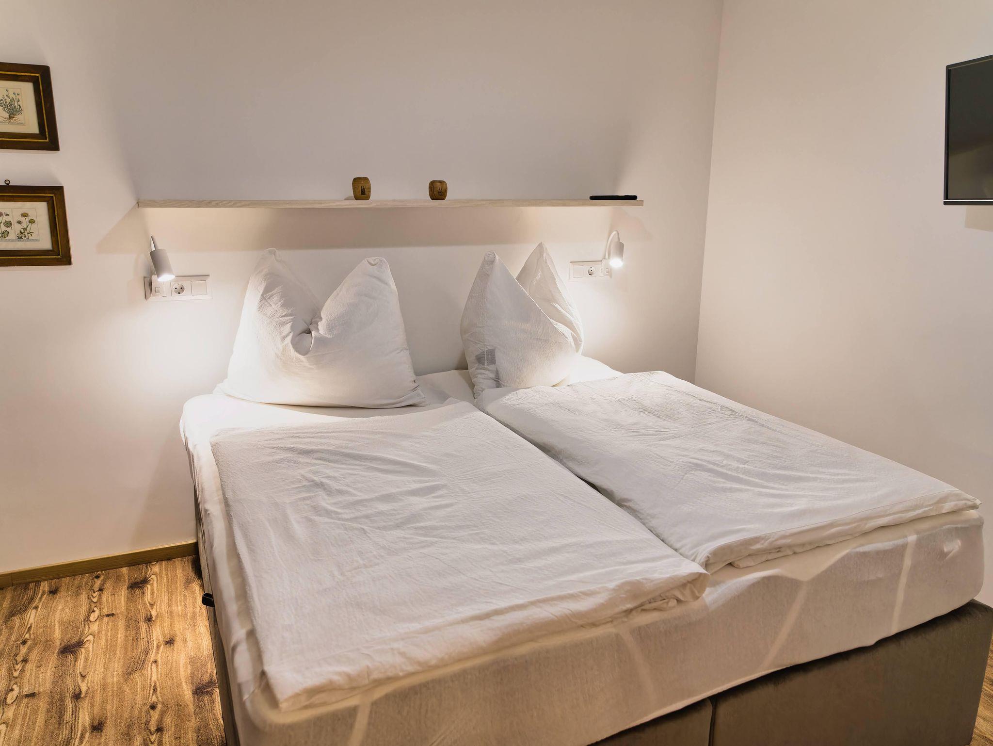 Weiters sind neben dem Wohnbereich die beiden Schlafzimmer (1x mit Doppelbett und SAT-TV und 1x mit Doppelbett - auf ein 3. Bett erweiterbar -, SAT-TV und ein weiterer Ausgang zum Balkon) und das Badezimmer mit Dusche.