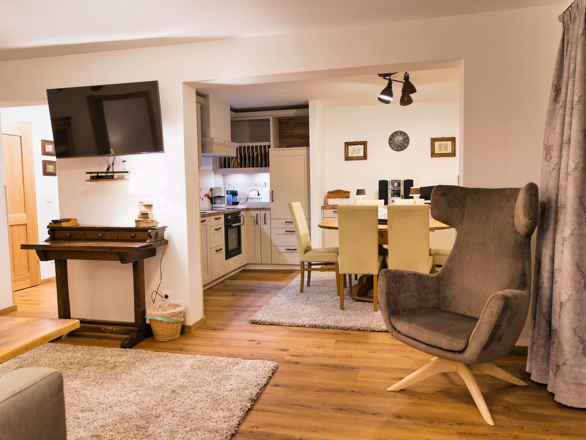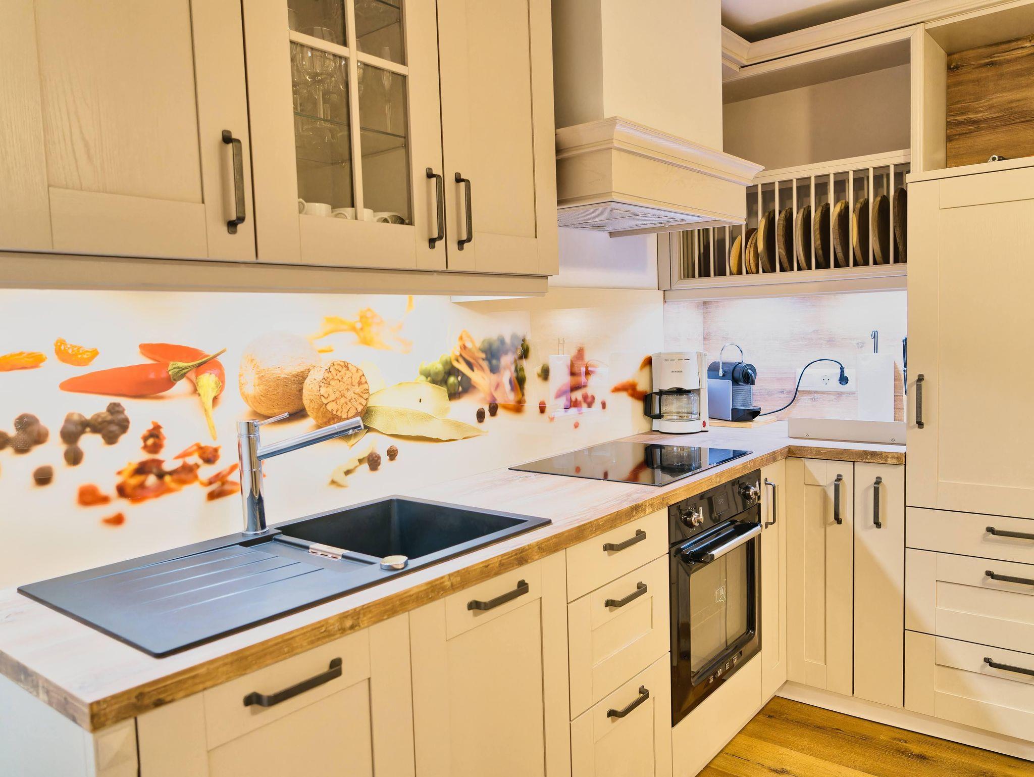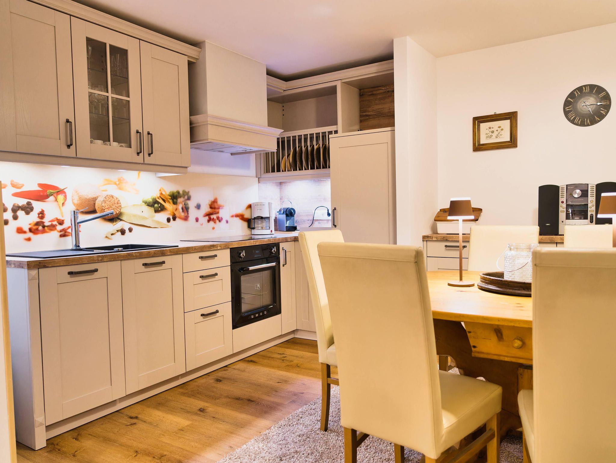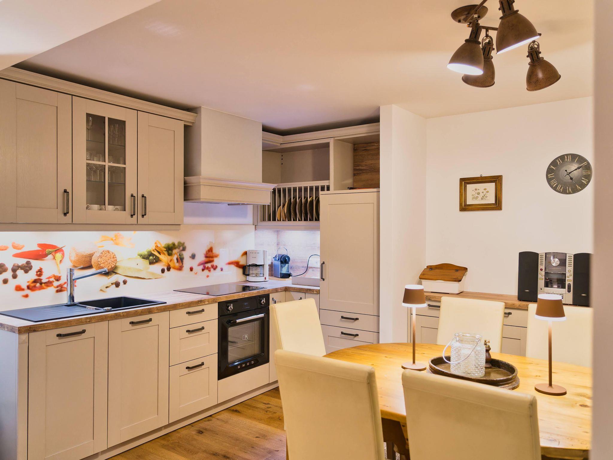Neben dem Wohnbereich ist die offene, voll ausgestattete Küche (Geschirrspüler, E-Herd mit Backrohr, Kühlschrank, Mikrowelle, Filterkaffeemaschine, NESPRESSO Kaffeemaschine, Wasserkocher, Toaster, div. Küchengeräte und ausreichend Geschirr) und der Essbereich.