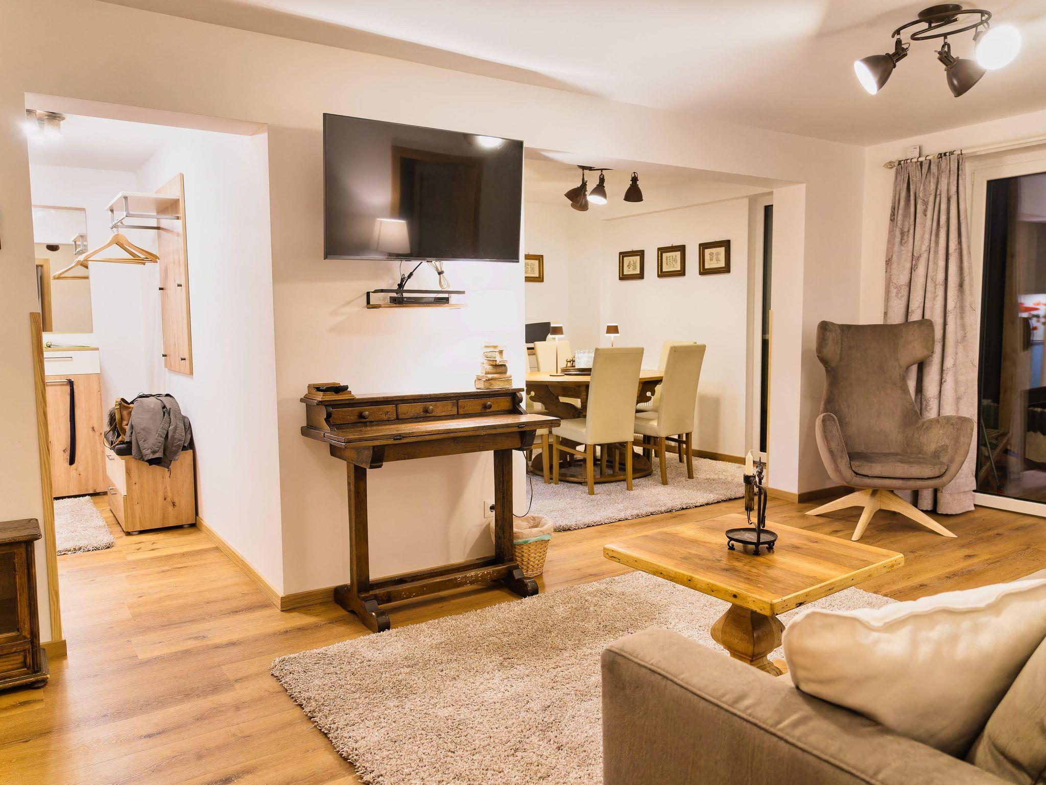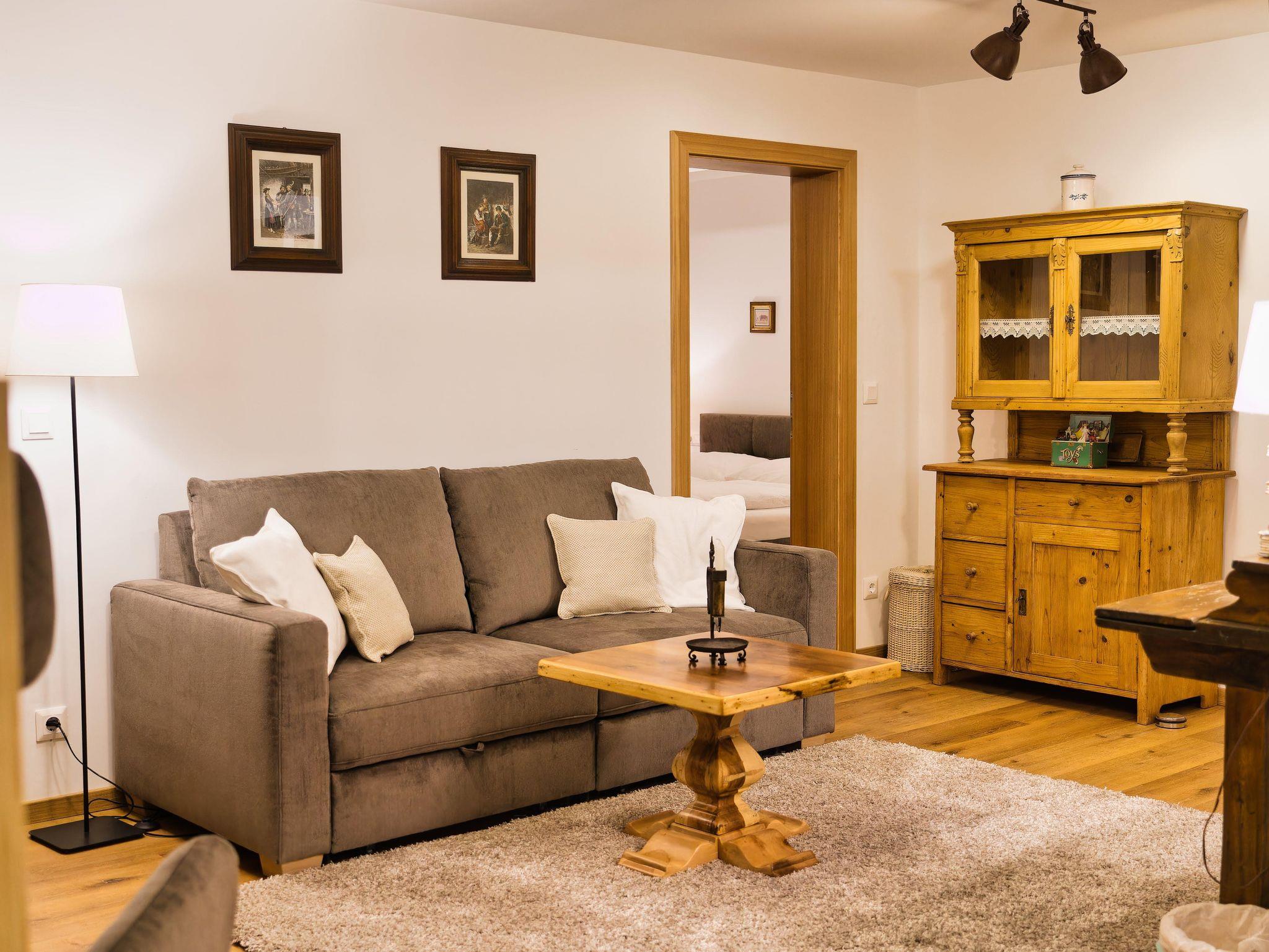 Danach kommen Sie in den großen Wohnbereich mit ausziehbarer Couch, Ohrensessel, Schreibtisch, kleiner Schwedenofen (mit Ethanol beheizbar) für gemütliche Stunden vor dem Feuer, SAT-TV (W-LAN fähig), diverse Brettspiele, kleine Stereoanlage, Bücher und zum großen, südseitigen Balkon mit Gartengarnitur und Liegestühlen. Der Balkon eignet sich hervorragend für sonnige, entspannte Momente mit einem herrlichen Blick auf die Berglandschaft.