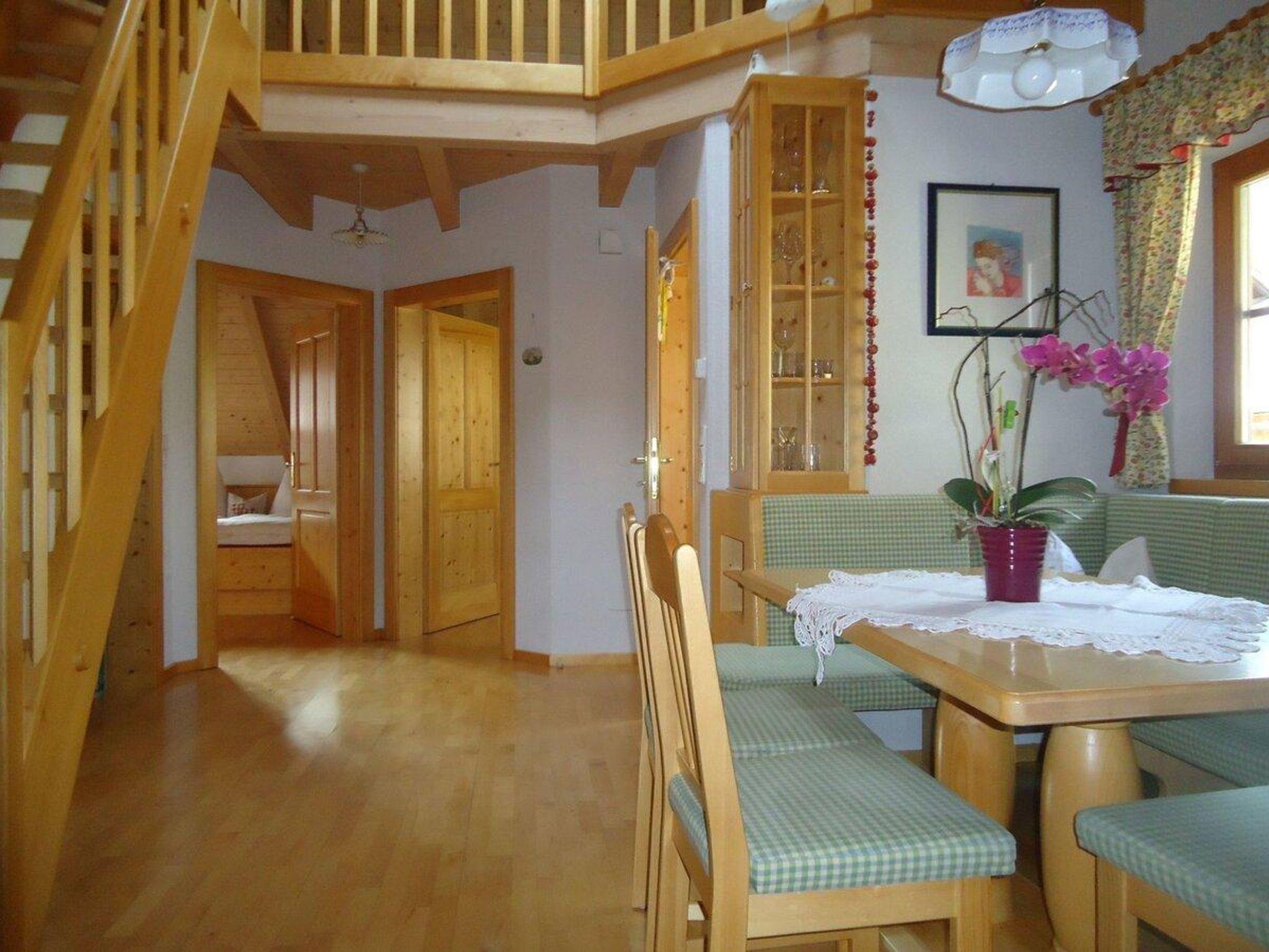 Die liebevoll mit Holzmöbeln eingerichtete Ferienwohnung Himmelschlüssel bietet auf zwei Ebenen Platz für 2 bis 6 Personen. Zwei separate Schlafzimmer mit einem Doppelbett, ein großzügiger Wohnraum mit Sat-TV, gemütlicher Essecke und voll ausgestatteter Küche mit Geschirrspüler sorgen für Komfort. Zwei zusätzliche Betten auf der offenen Galerie machen die Wohnung auch für Familien ideal.