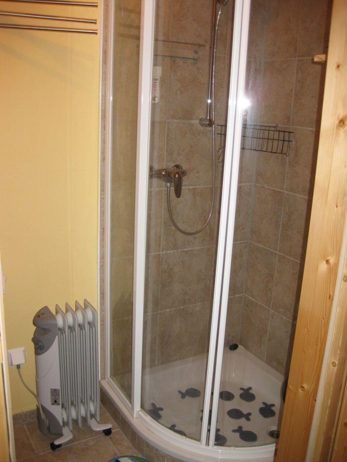 Das Badezimmer ist mit Dusche, Waschbecken und WC ausgestattet.