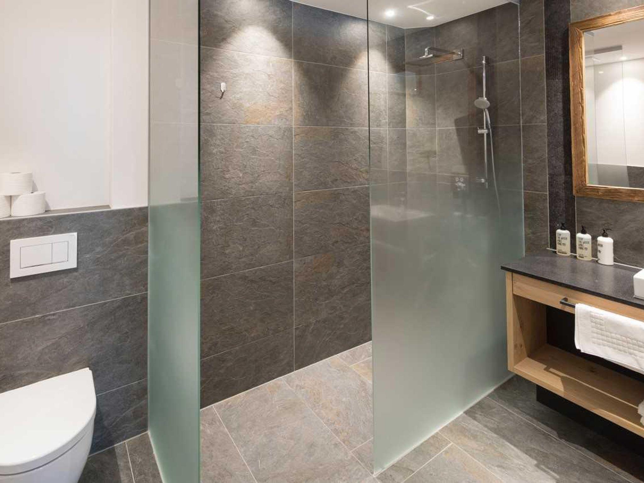 Bad mit begehbarer Dusche, Handtuchtrockner, Kosmetikspiegel, Fön, WC, flauschige