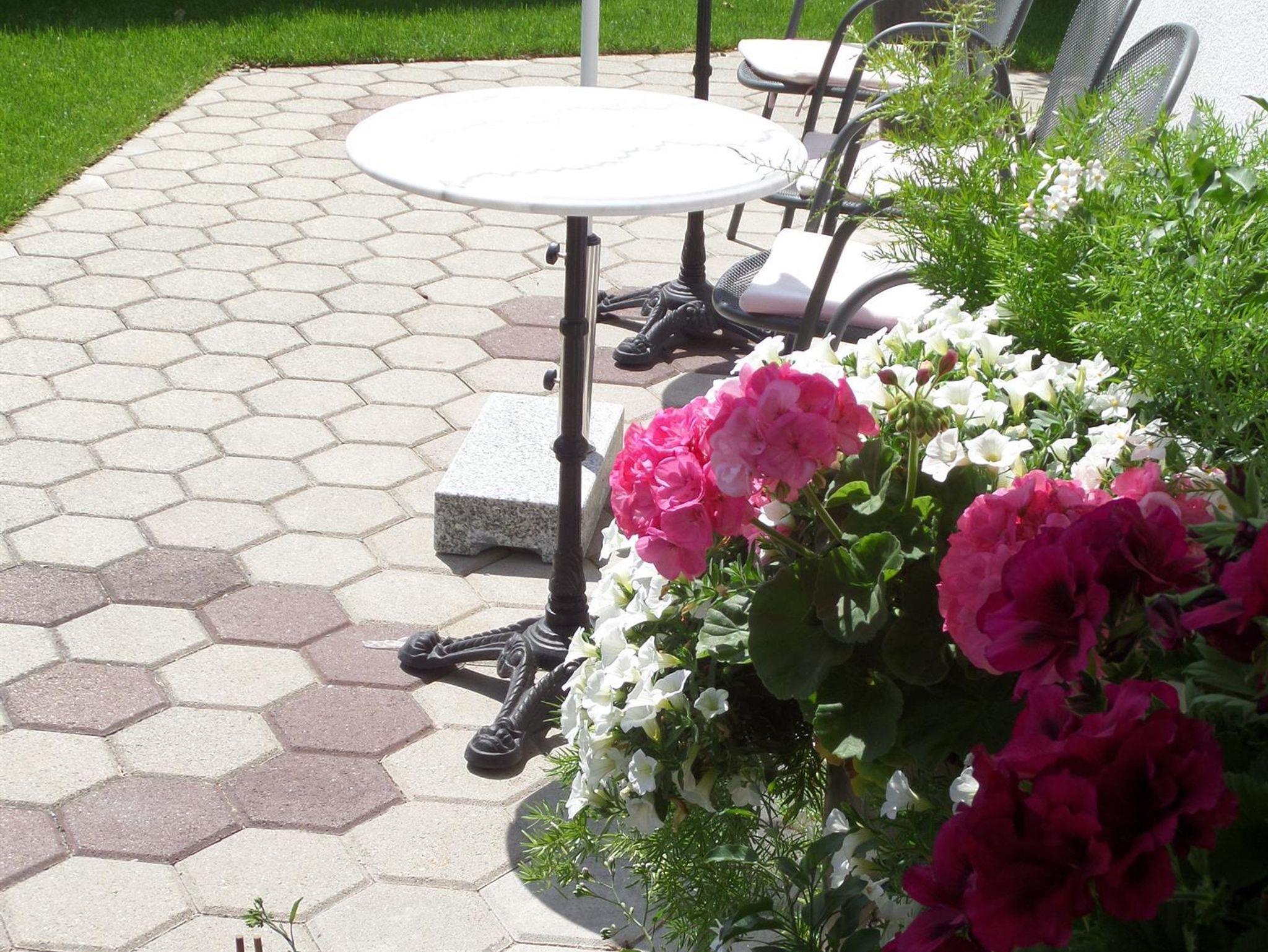 Ein Esstisch und eine Sitzcouch vervollständigen die Einrichtung. Der Balkon ist nach Westen ausgerichtet und hat Tisch und Stühle.