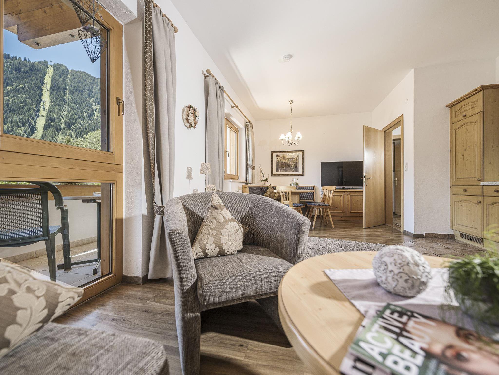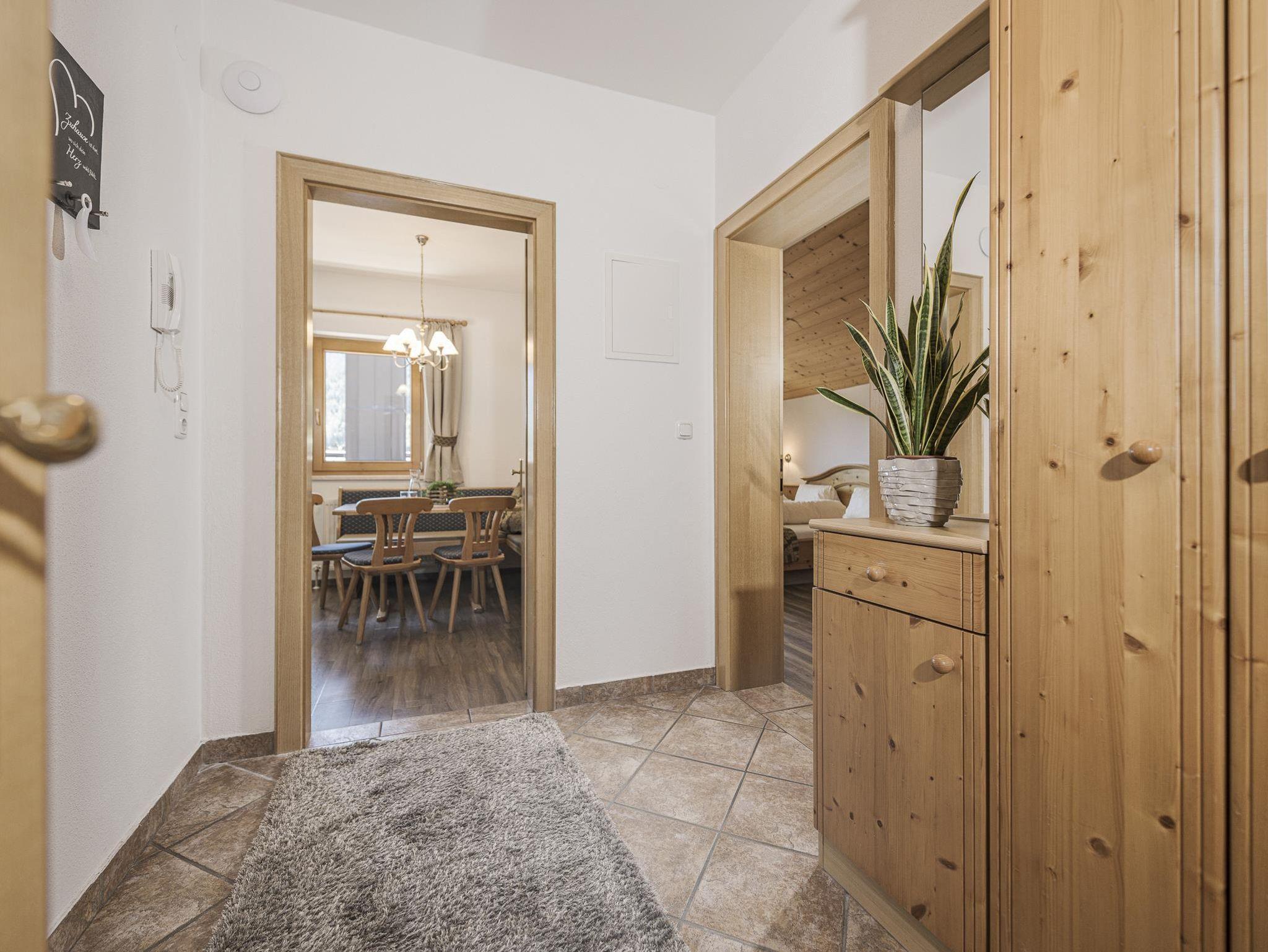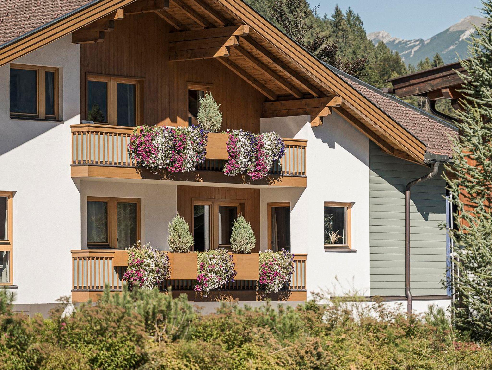 Ein Schlafzimmer mit Doppelbett, ein Schlafzimmer mit Einzelbett, zwei Badezimmer mit WC, Vorraum, Wohnraum mit ausziehbarer Doppelcouch und Balkon. Genießen Sie dazu noch den unvergleichlich schönen Blick auf die umliegenden Berge mit Zwölferkopf und Karwendel-Bergbahn.