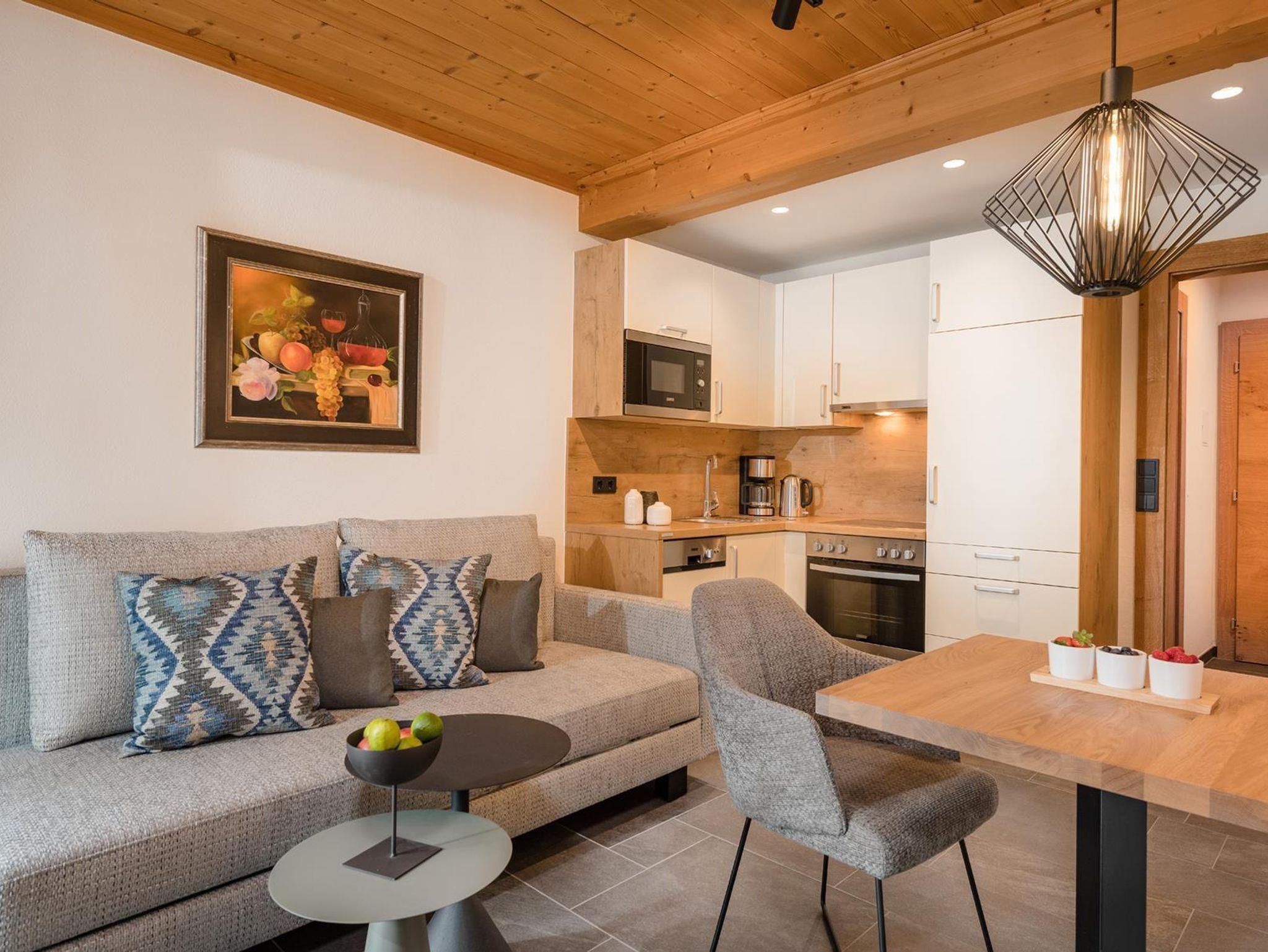 gemütliche Wohnküche mit Wohn- und Essecke, komplett ausgestattete Küche mit 4-Platten-Cerankochfeld, Mikrowelle, Backofen, Kühlschrank mit Gefrierfach, Filterkaffeemaschine (auf Wunsch Nespresso verfügbar), Toaster, Wasserkocher, Geschirr, Besteck und Kochutensilien