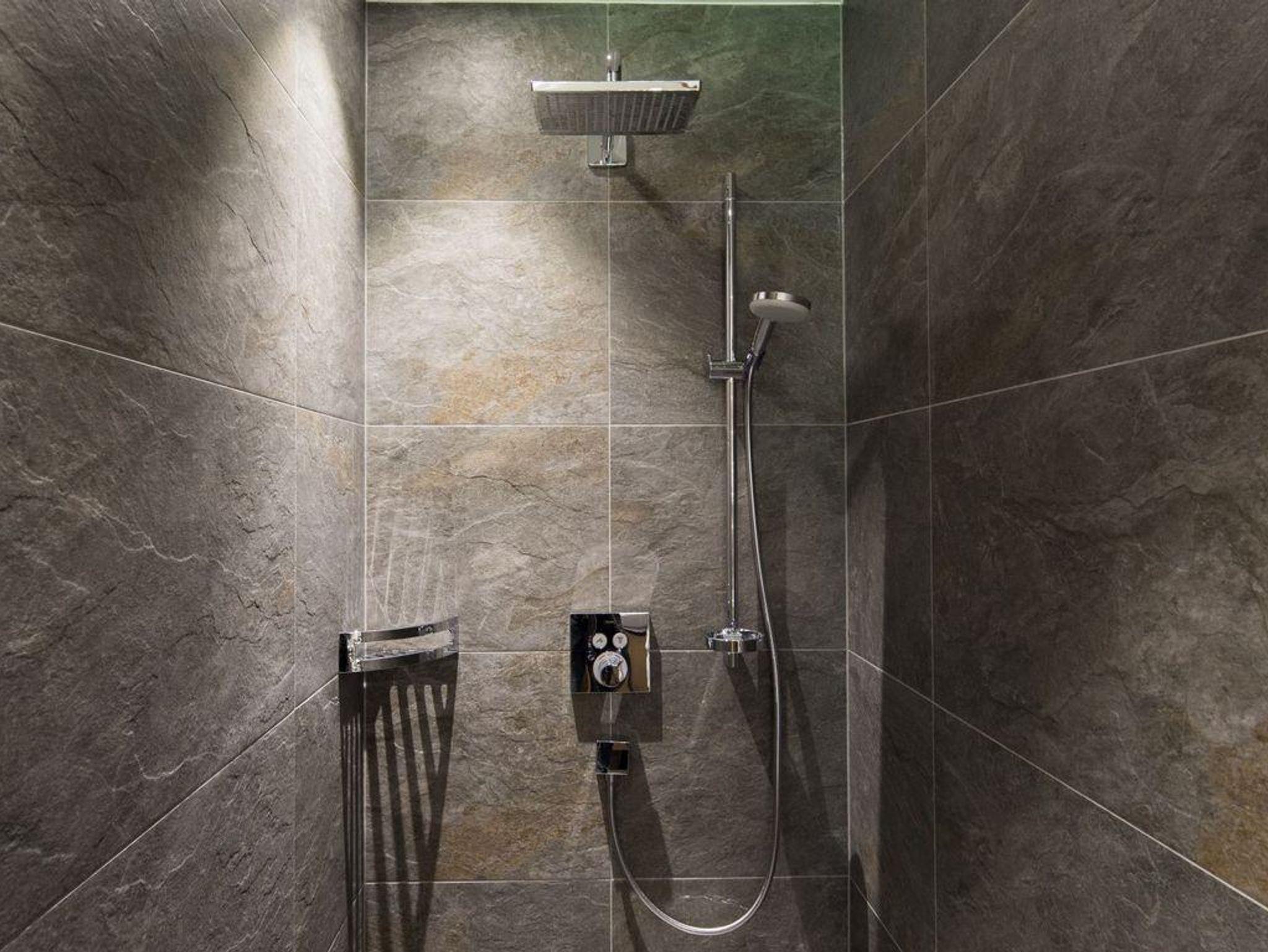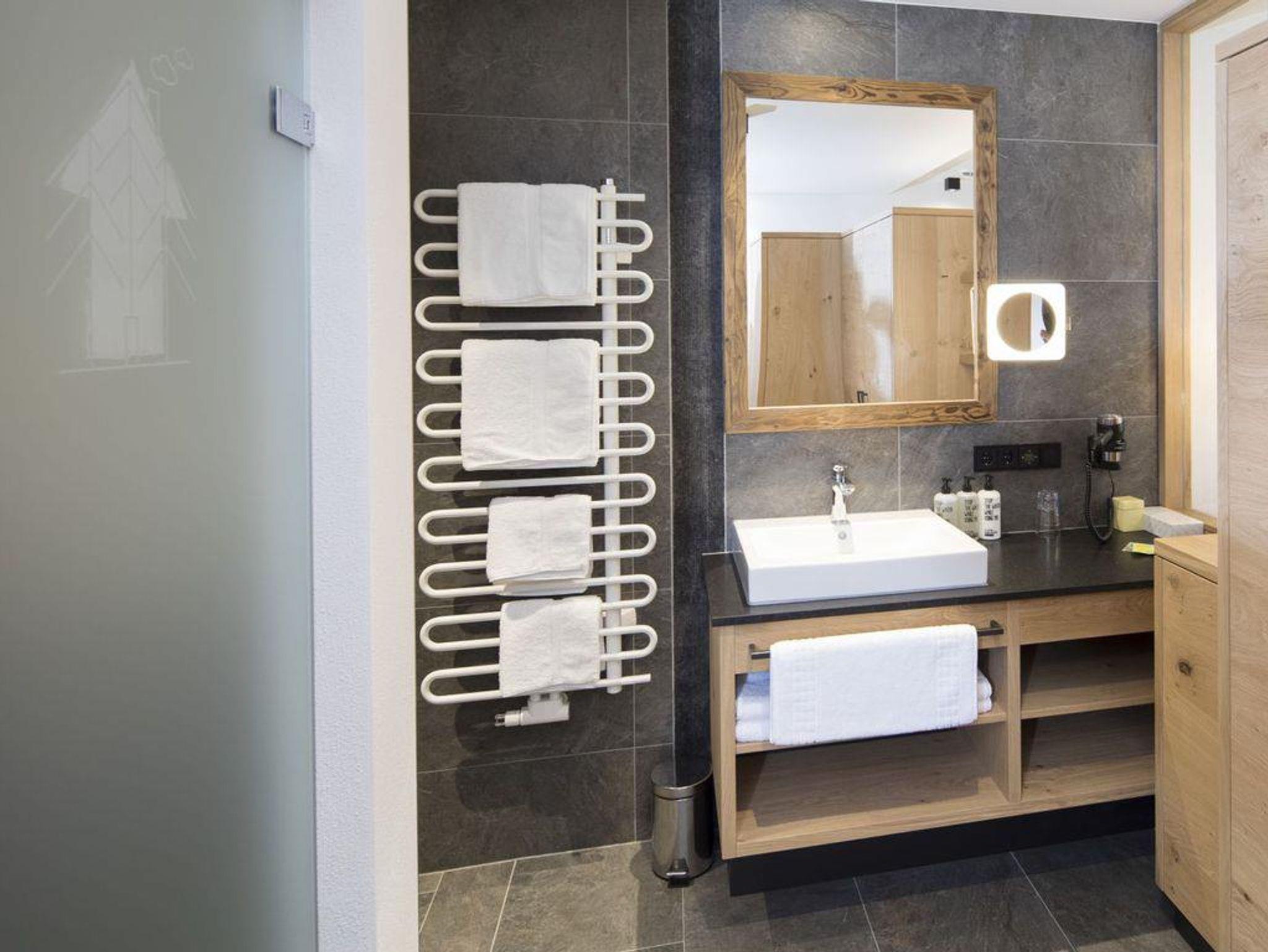 Bad mit begehbarer Dusche, Handtuchtrockner, Kosmetikspiegel, Fön, WC, flauschige