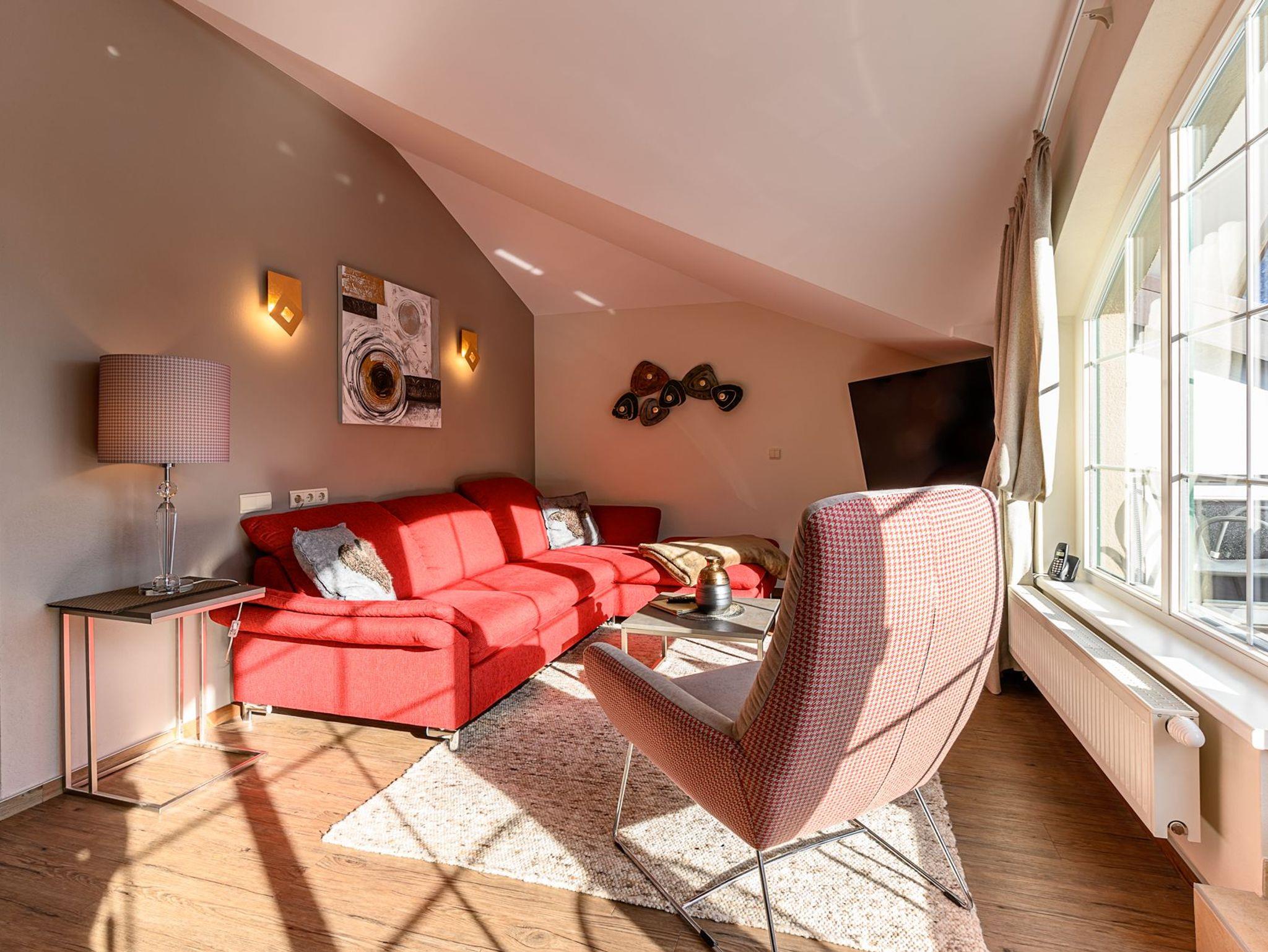 Das Panorama-Doppelzimmer ist voll ausgestattet mit einem Küchenblock und ausziehbarer Couch für 2 Personen. Es hat eine Größe von 35m² und einen Balkon mit Seeblick.