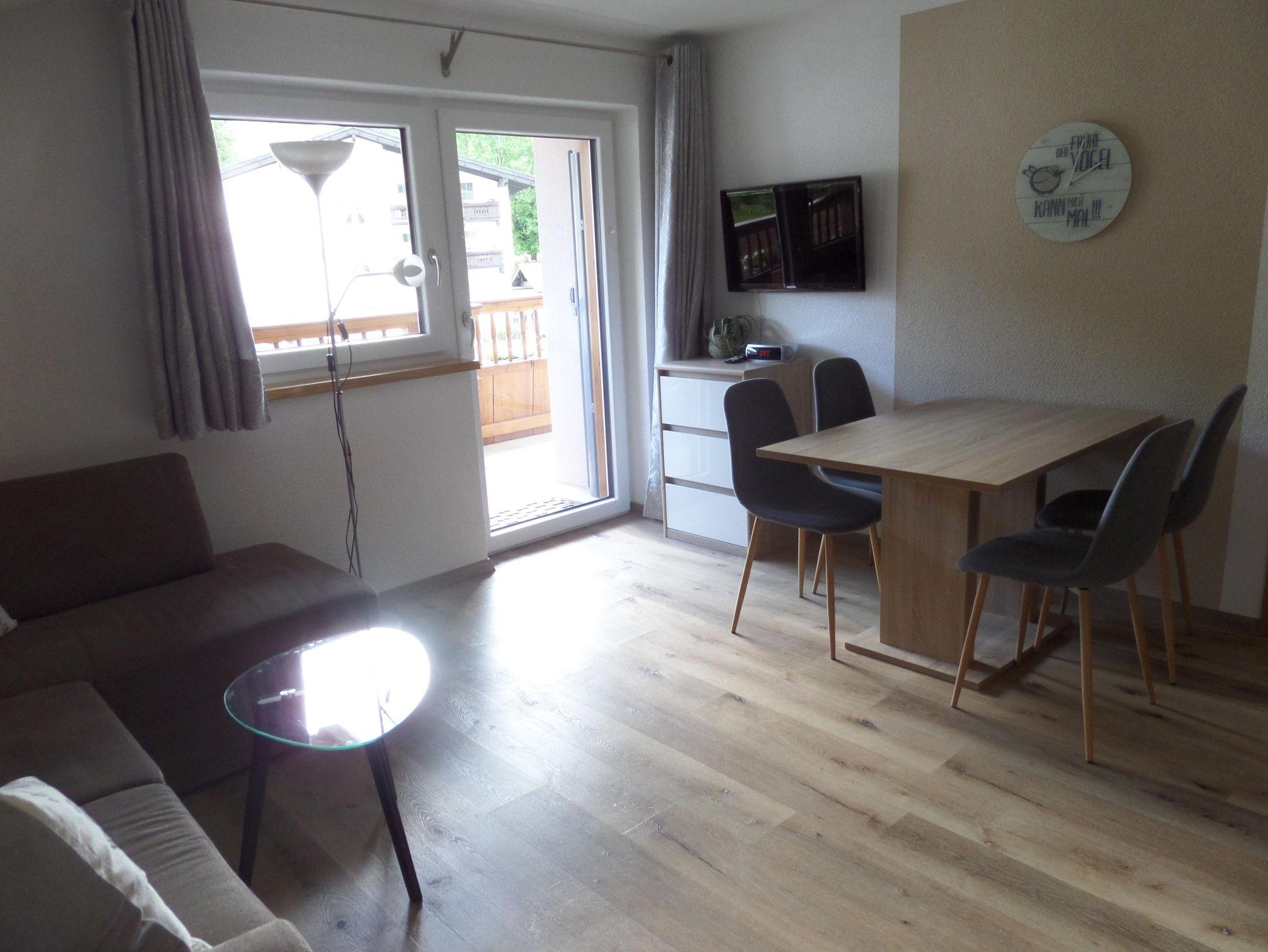 In der Wohnküche ist ein großer Esstisch und eine Wohnecke sorgt für Gemütlichkeit. Der Balkon nach Süden ist mit Gartentisch und Stühlen ausgerüstet.