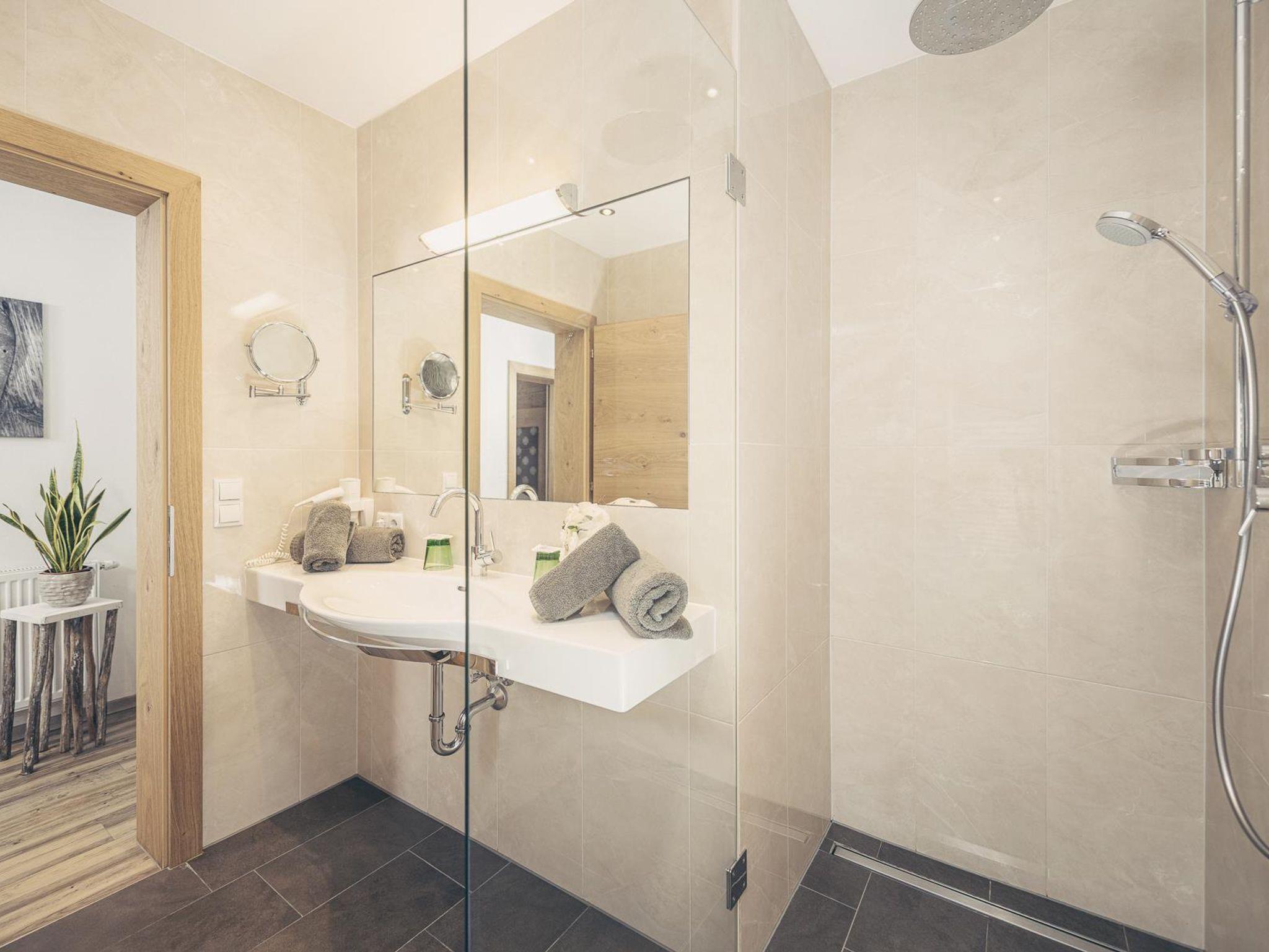 • Badezimmer mit Dusche, teils separates WC