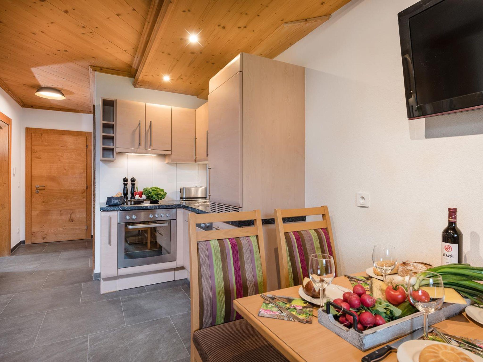 • gemütliche Wohnküche mit Wohn- und Essecke, komplett ausgestattete Küche mit 4-Platten-Cerankochfeld, Mikrowelle, Backofen, Kühlschrank mit Gefrierfach, Filterkaffeemaschine (auf Wunsch Nespresso verfügbar), Toaster, Wasserkocher, Geschirr, Besteck und Kochutensilien