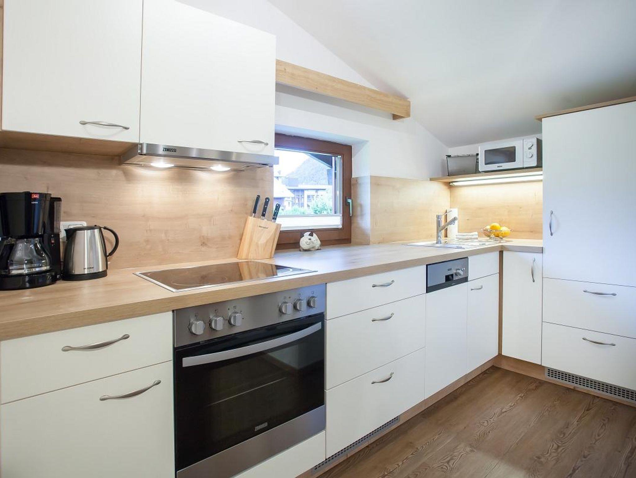 • Komplett ausgestattete Küche m. Ceranfeld, Backrohr, Kühlschrank m. kl. Gefrierfach, Geschirrspüler, Mikrowelle, Toaster