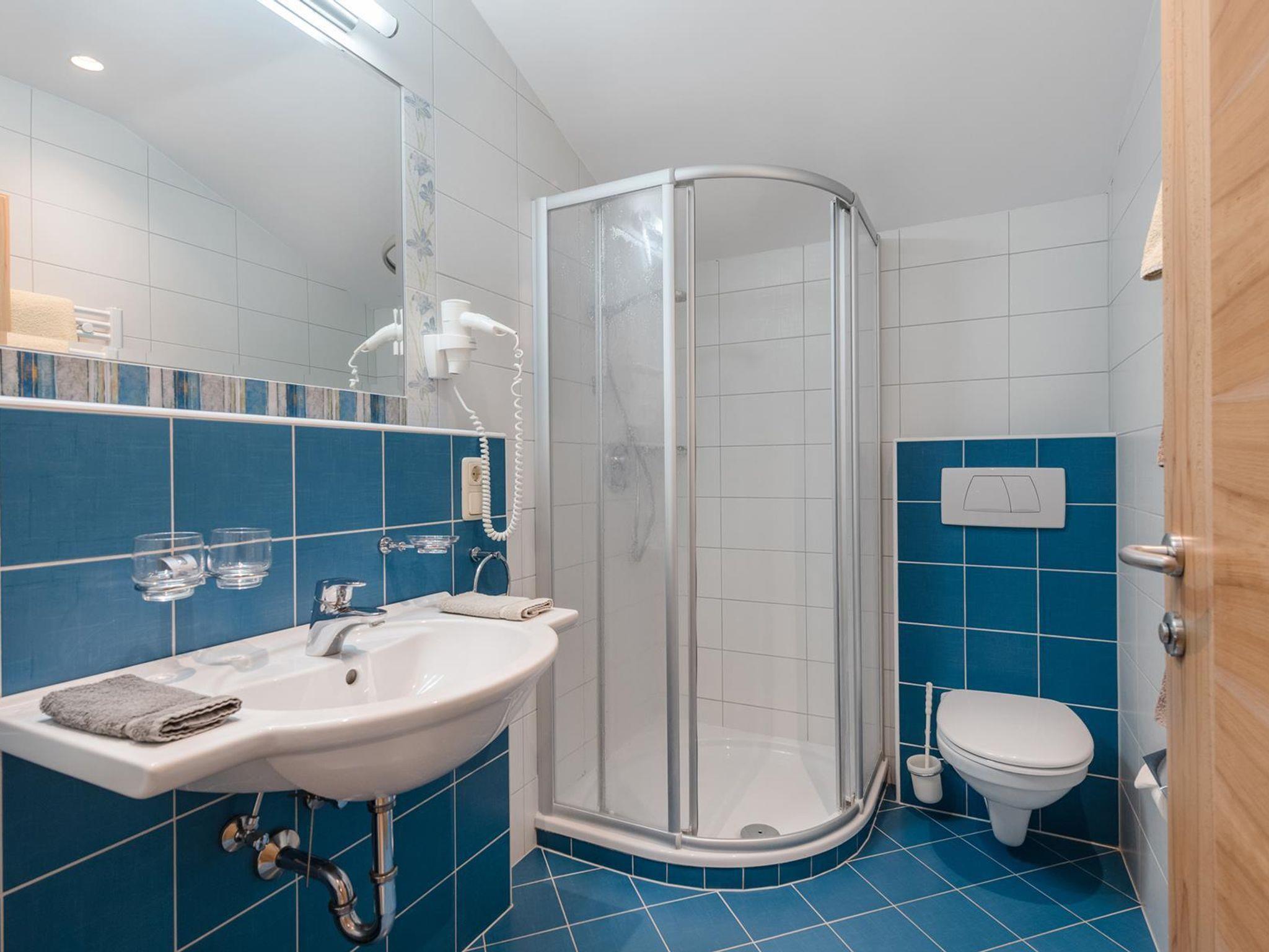 • modernes Badezimmer mit barrierefreier Dusche und WC (Fön, Kosmetikspiegel, Radio)