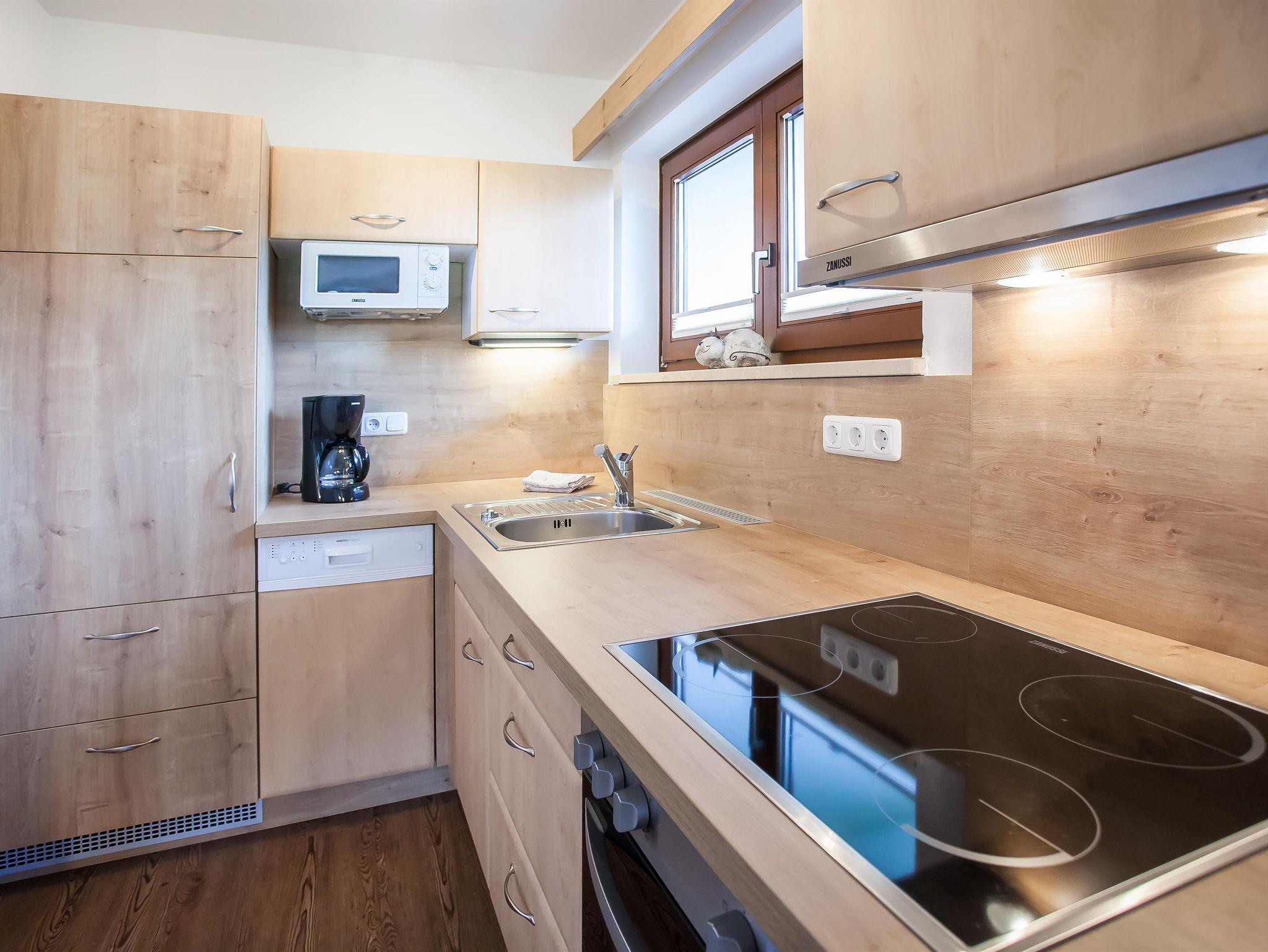 Neu renovierte Ferienwohnung mit 1 Schlafzimmer, Wohnraum mit Sitzecke und komplett ausgestatteter Küche mit Ceranfeld, Mikrowelle, Backrohr, Geschirrspüler und Filter-Kaffeemaschine, Bad mit Dusche und separater Toilette und Balkon.
