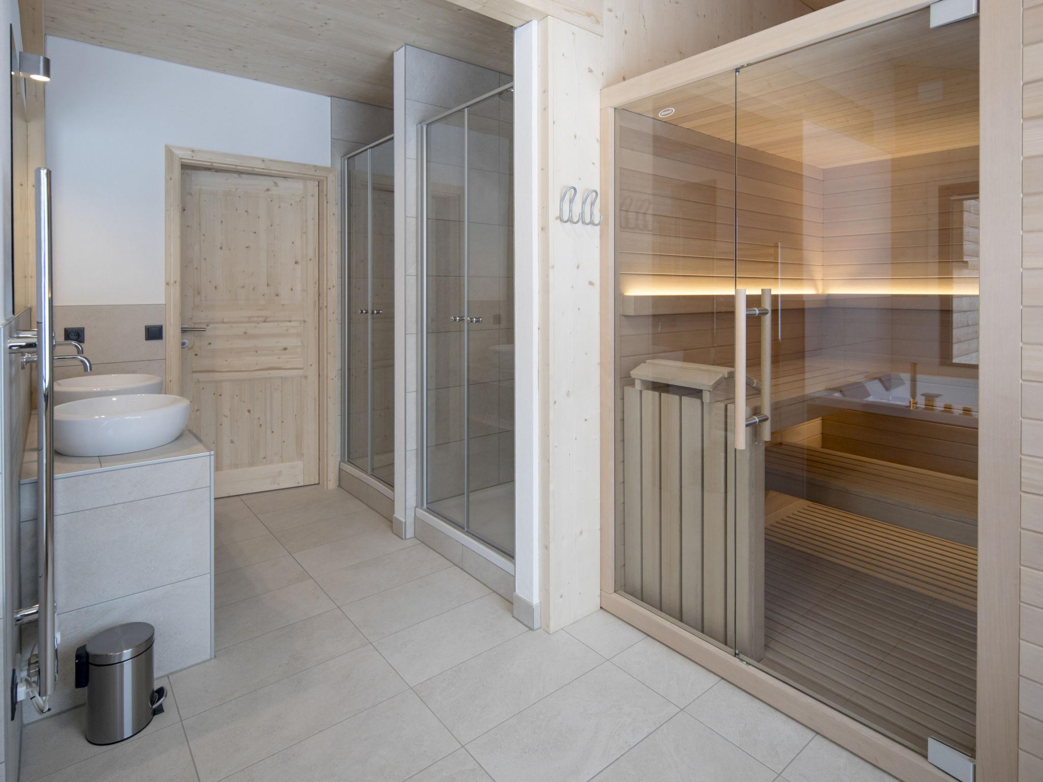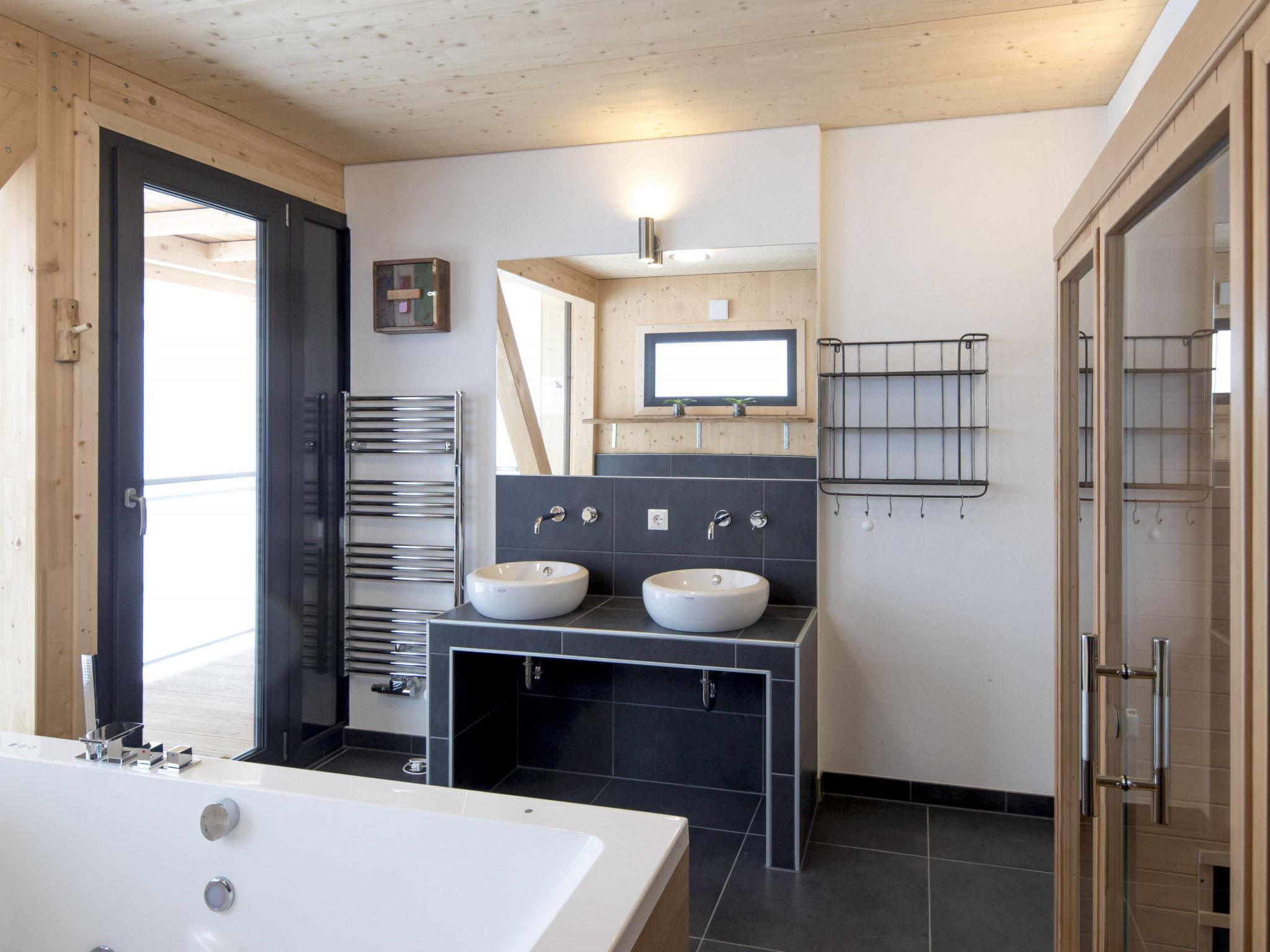 "Superior 8 Sauna & Sprudelwanne innen", 4-Zimmer-Chalet 120 m2. Komfortabel und geschmackvoll eingerichtet: Wohn-/Esszimmer mit Essecke und Sat-TV (Flachbildschirm). 2 Doppelzimmer, jedes Zimmer mit Dusche/WC. 1 Doppelzimmer mit Dusche/WC und Sat-TV (Flachbildschirm). Offene Küche (Backofen, Geschirrspüler, 4 Glaskeramikplatten, Toaster, Wasserkocher, Mikrowelle, elektrische Kaffeemaschine). Dusche/WC, Sauna. Balkon. Balkonmöbel. Sehr schöne Sicht auf die Berge. Zur Verfügung: Haartrockner. Internet (Wireless LAN, gratis). Bitte beachten: Nichtraucher-Unterkunft.